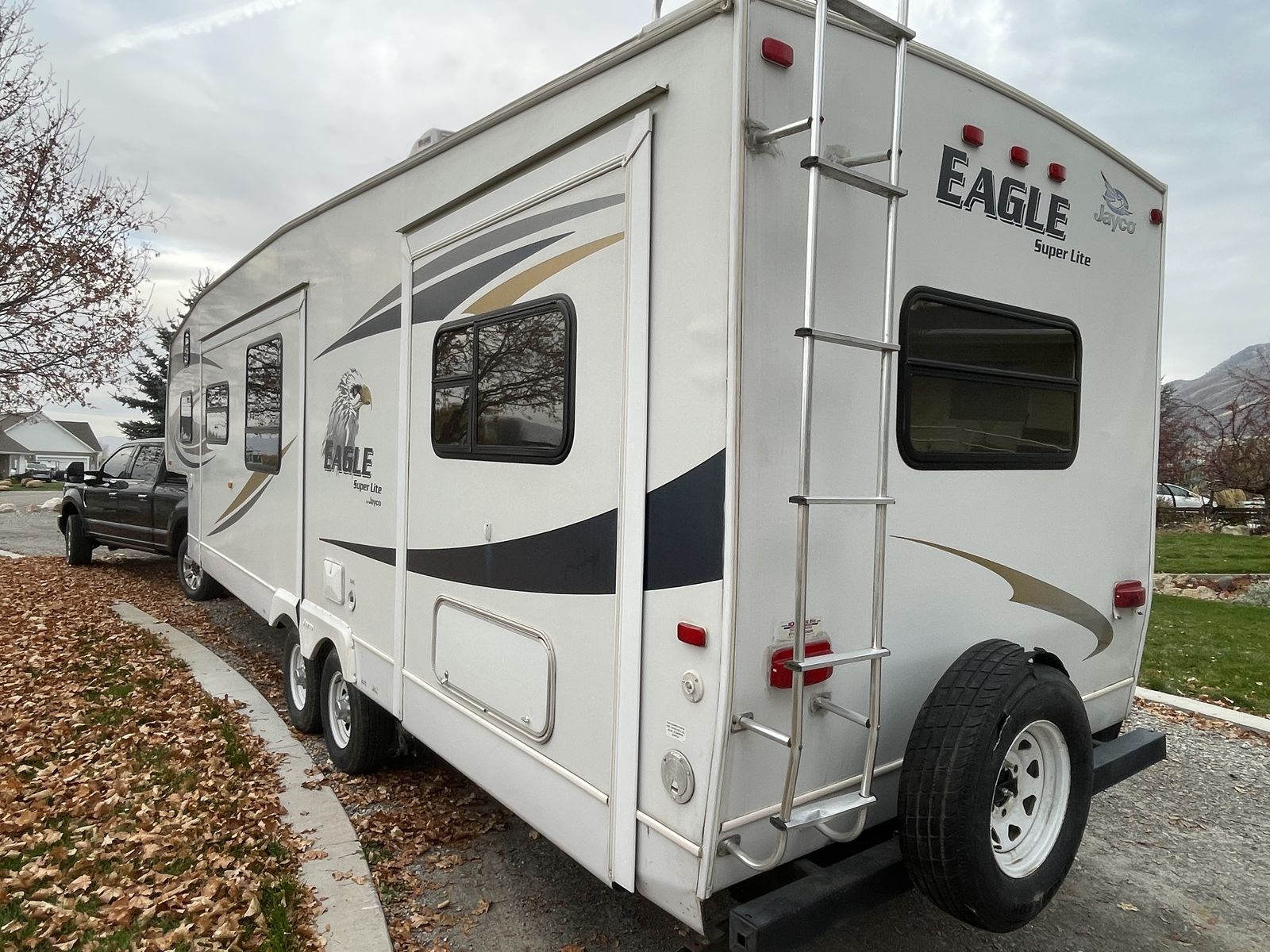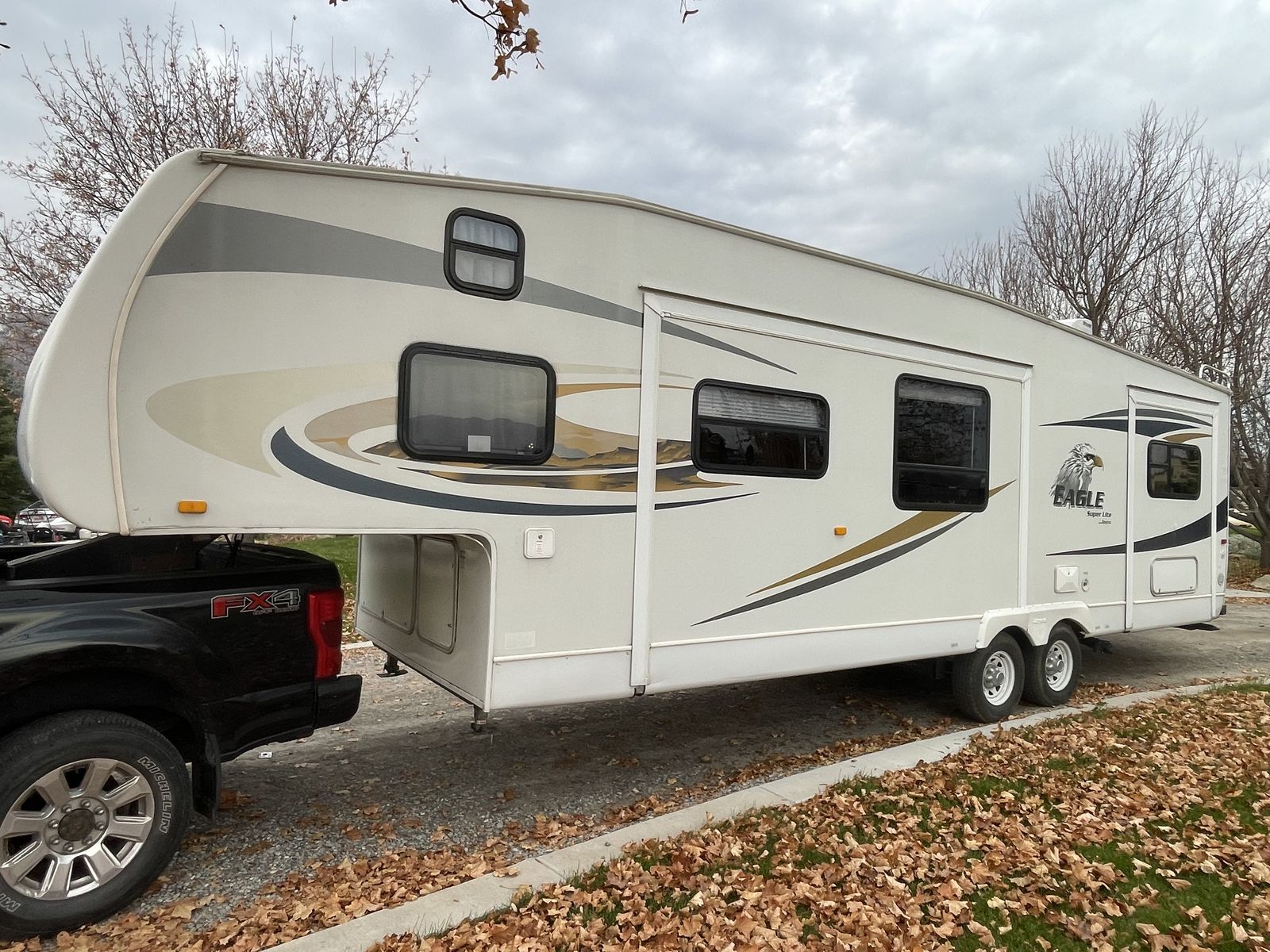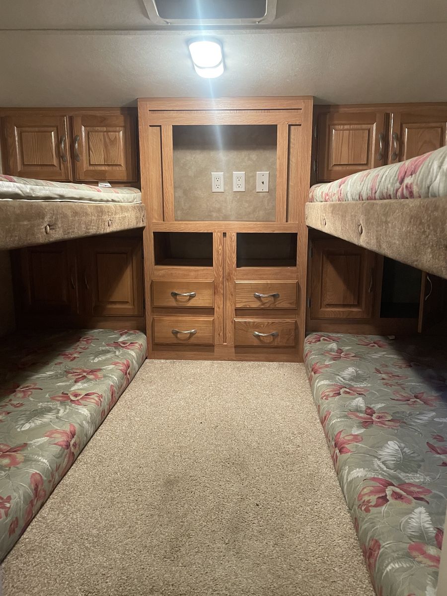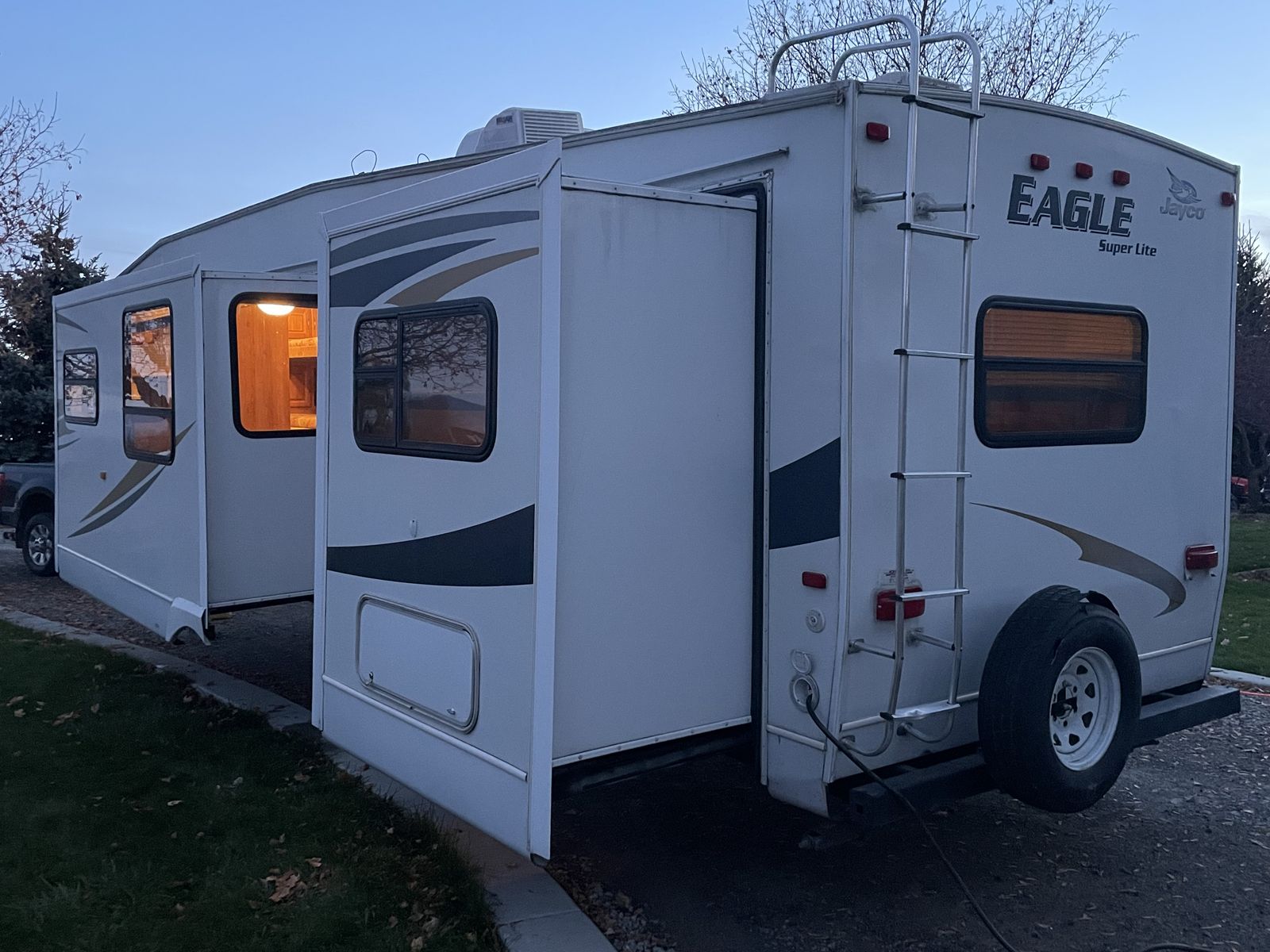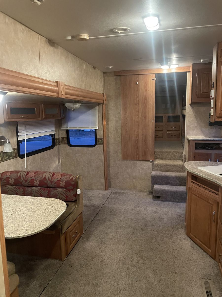 Venmo2008 Jayco Eagle 30' 5th wheel. This model has the Bunkbeds in the front up top and the Queen bed with tipout in the very back. Other big tipout in Dining/Living area where table is. Has auto matic awning that was installed. Bought this as a project last year and never got it done this winter. Has water damage on the very back wall where ladder is. Will have a rebuilt title once you have finished fixing it. Has been in Dry storage shop all winter. This should be one is your a little handy to be able to finish and have it ready for camping by Memorial Day!