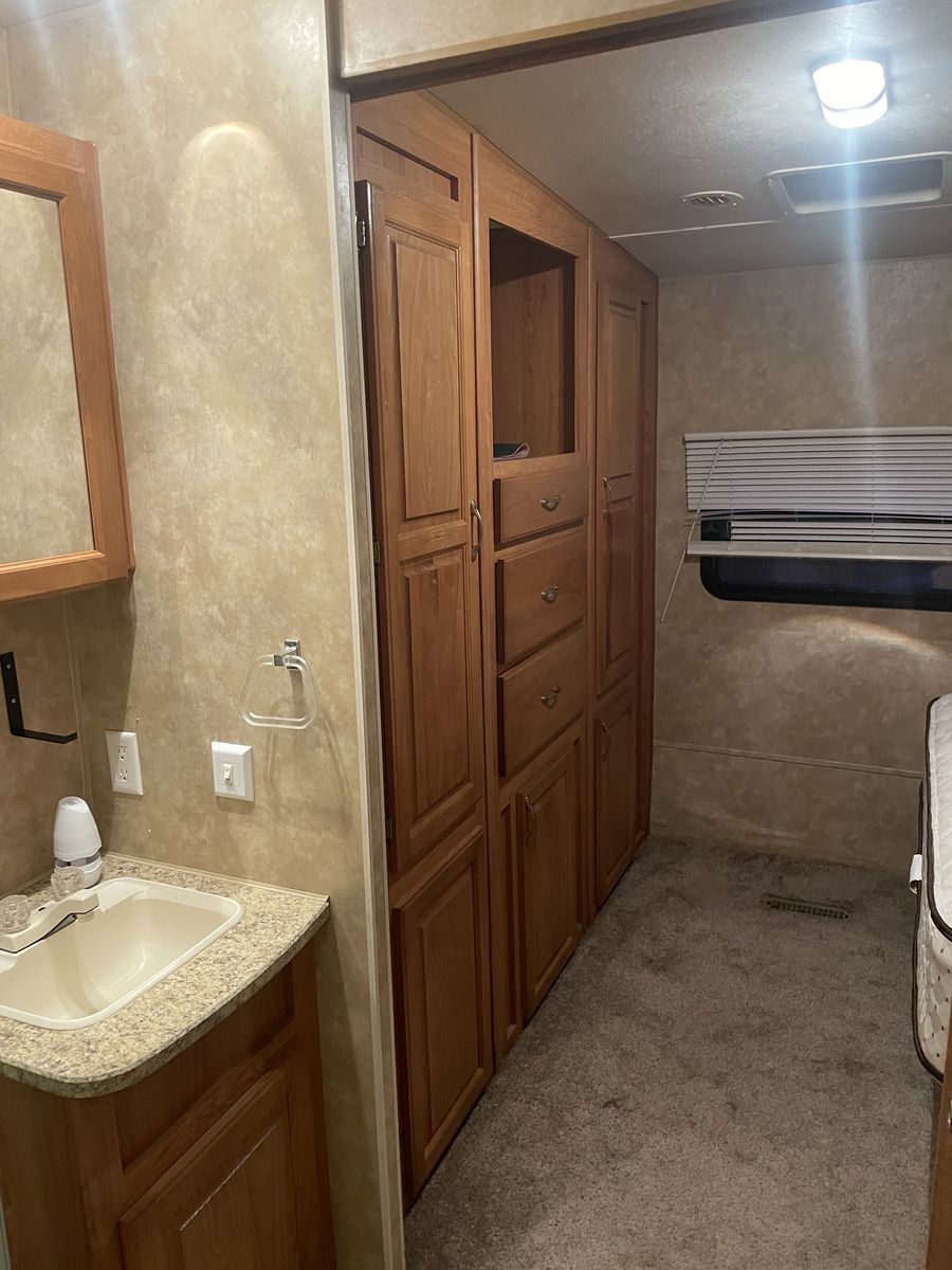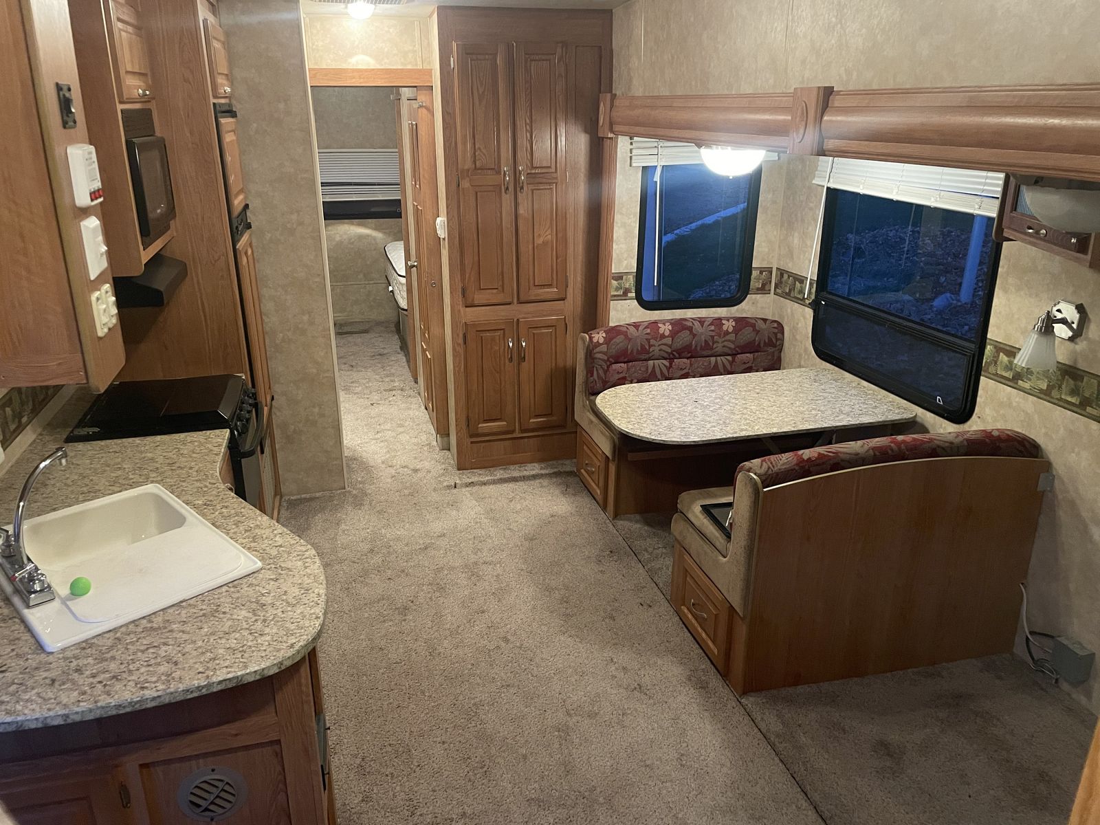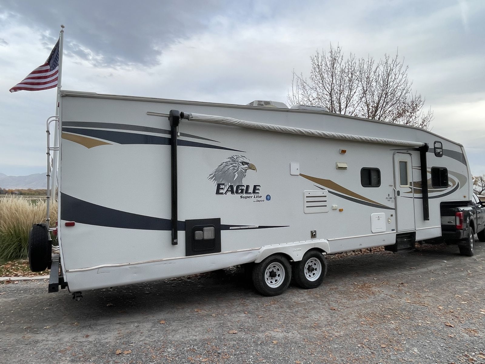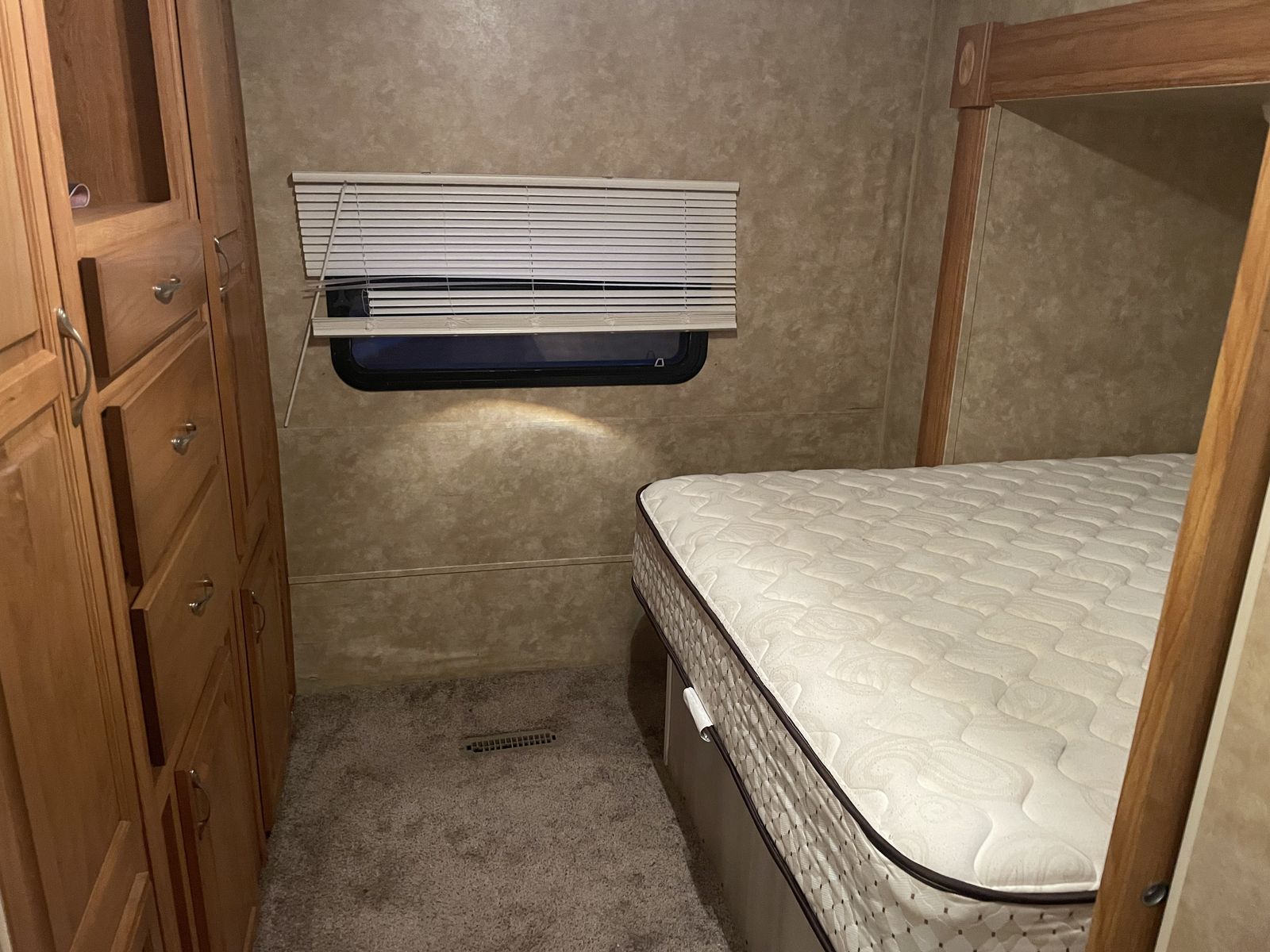 Venmo2008 Jayco Eagle 30' 5th wheel. This model has the Bunkbeds in the front up top and the Queen bed with tipout in the very back. Other big tipout in Dining/Living area where table is. Has auto matic awning that was installed. Bought this as a project last year and never got it done this winter. Has water damage on the very back wall where ladder is. Will have a rebuilt title once you have finished fixing it. Has been in Dry storage shop all winter. This should be one is your a little handy to be able to finish and have it ready for camping by Memorial Day!