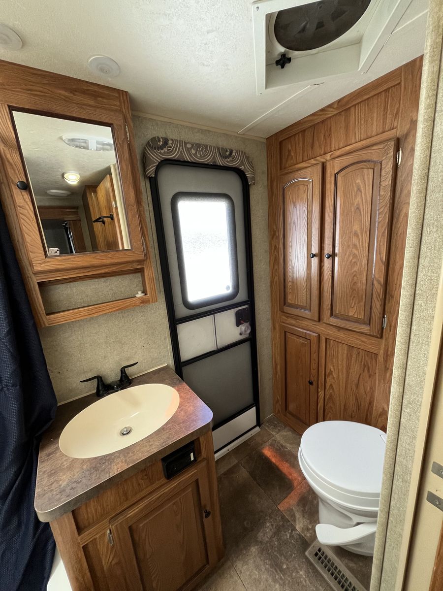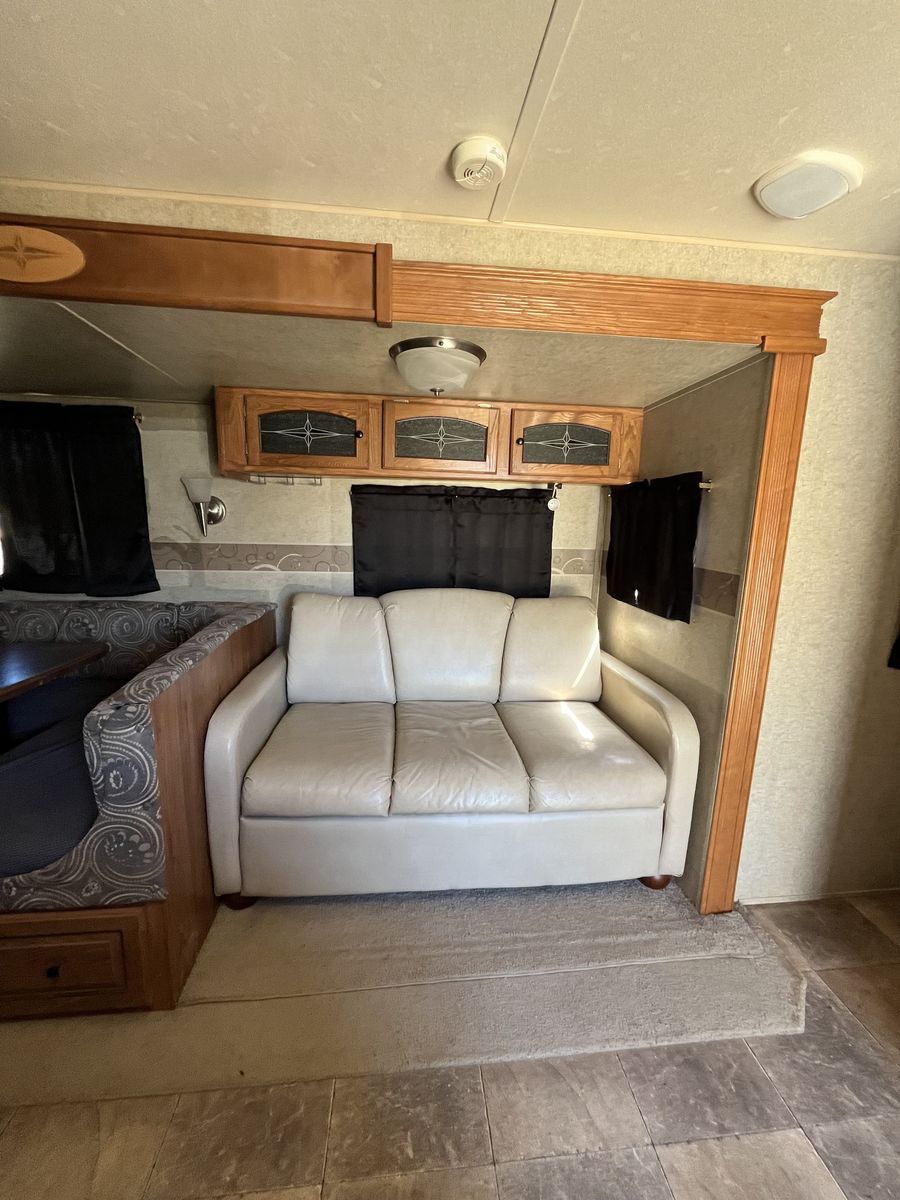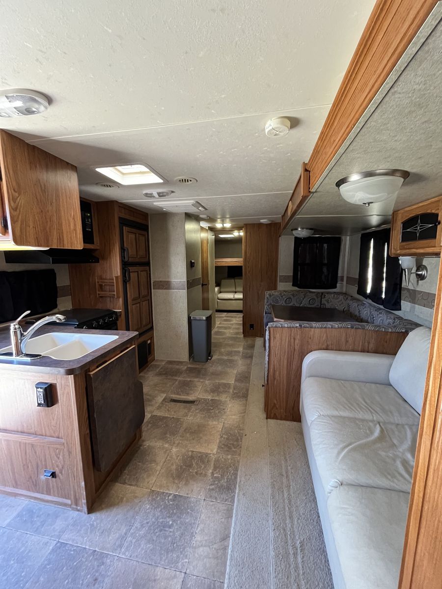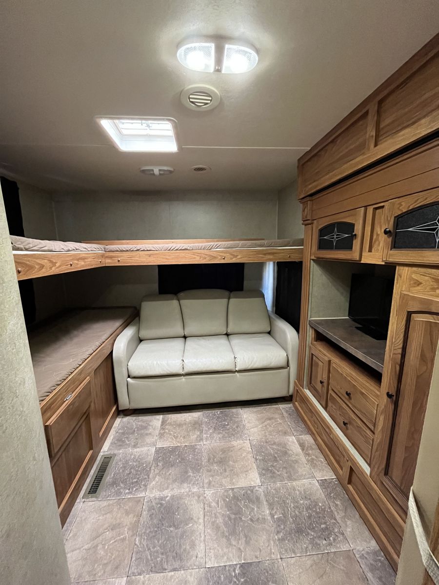 Spacious 34' bumper-pull travel trailer ideal for families. 2 slide-outs, 3 twin bunks, 2 sleep sofas (full air mattresses), queen front bed, and convertible dinette — comfortably sleeps 8+. Large kitchen + outdoor kitchen with LP grill hookup, outdoor shower. Recently replaced furnace, hot water heater, toilet, roof vent covers, power jack, and new hybrid memory foam mattress in bedroom. Used just one hunting season since updates. Awning covers are sunbaked and need replacement (awnings still work). Family outgrew it — well cared for and ready for more adventures.