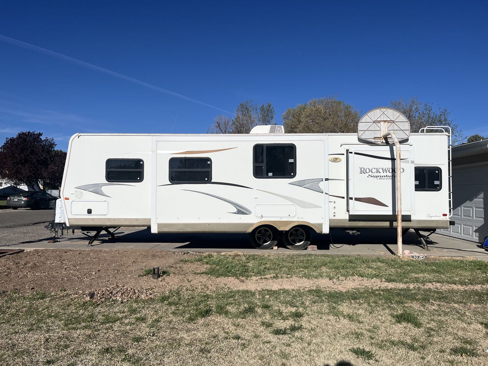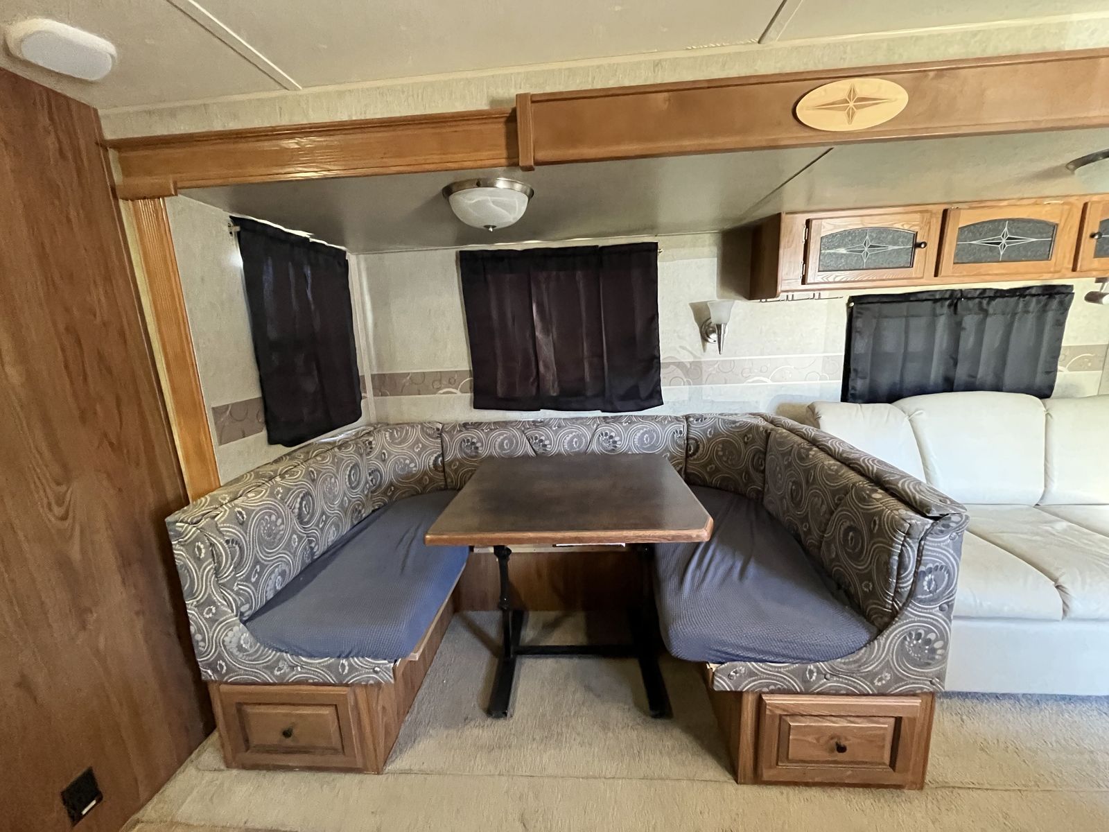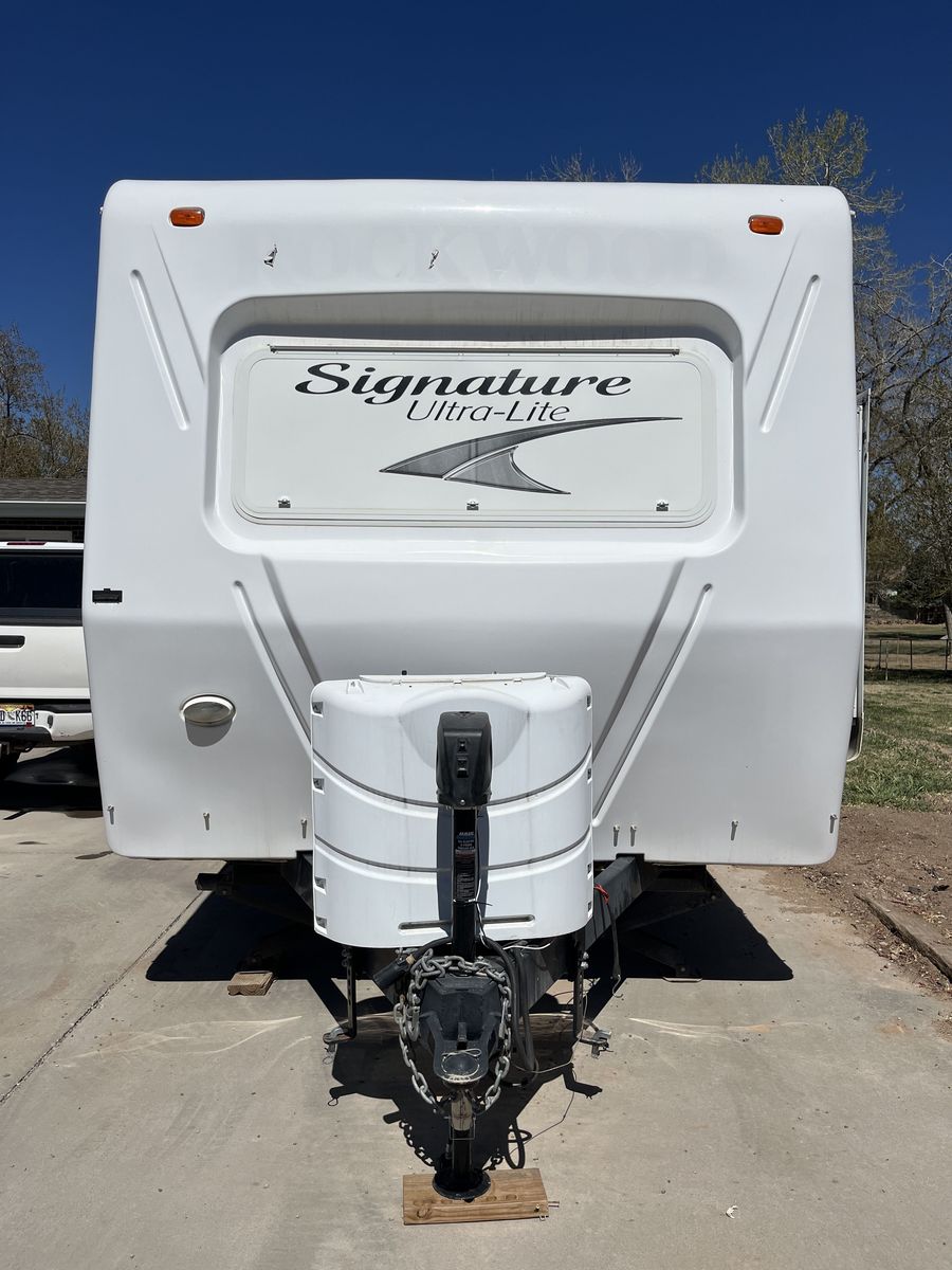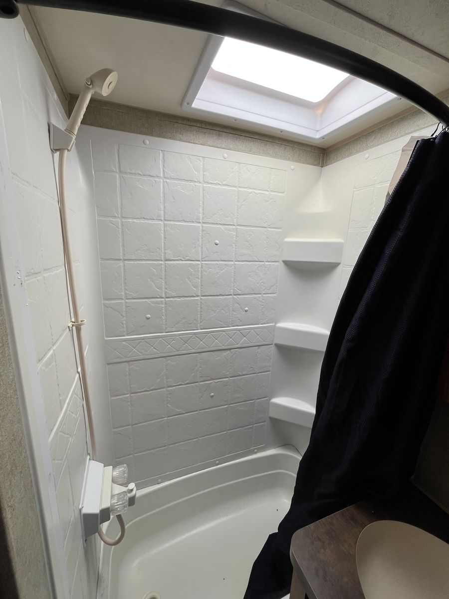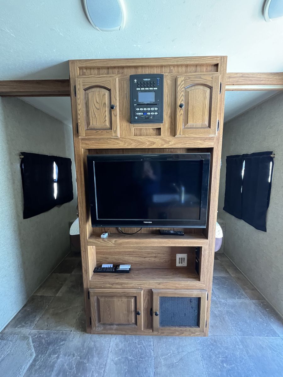 Spacious 34' bumper-pull travel trailer ideal for families. 2 slide-outs, 3 twin bunks, 2 sleep sofas (full air mattresses), queen front bed, and convertible dinette — comfortably sleeps 8+. Large kitchen + outdoor kitchen with LP grill hookup, outdoor shower. Recently replaced furnace, hot water heater, toilet, roof vent covers, power jack, and new hybrid memory foam mattress in bedroom. Used just one hunting season since updates. Awning covers are sunbaked and need replacement (awnings still work). Family outgrew it — well cared for and ready for more adventures.