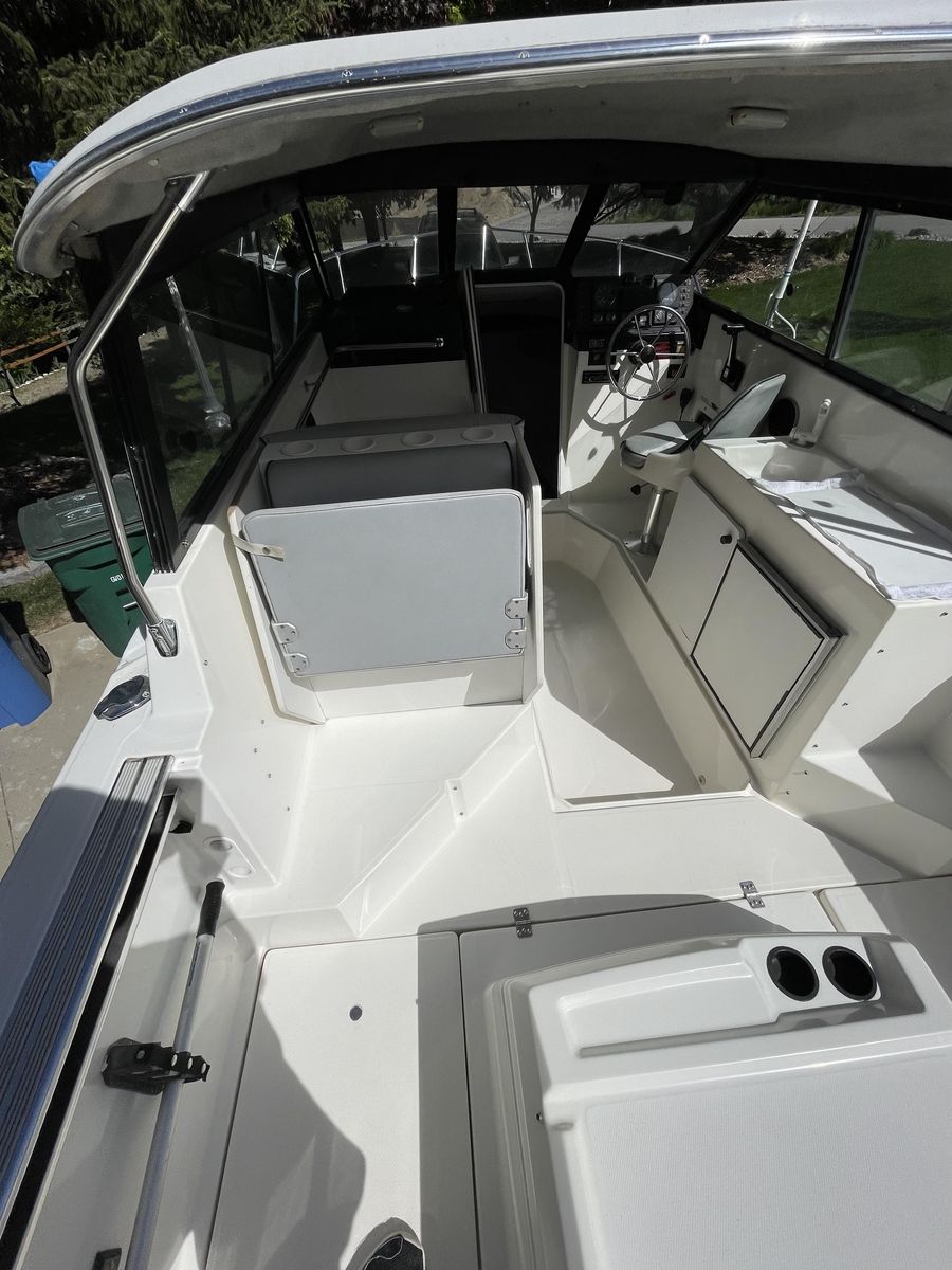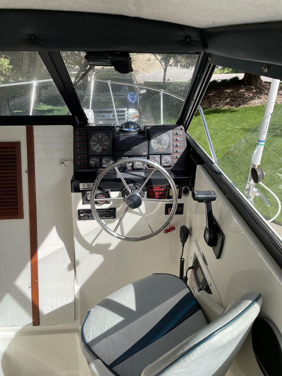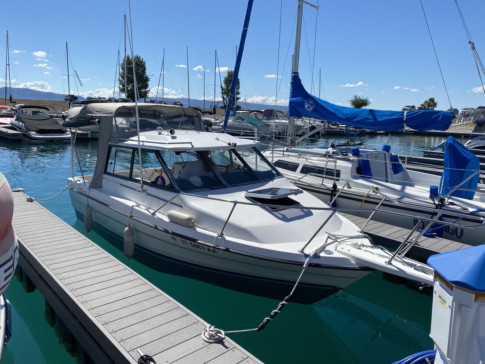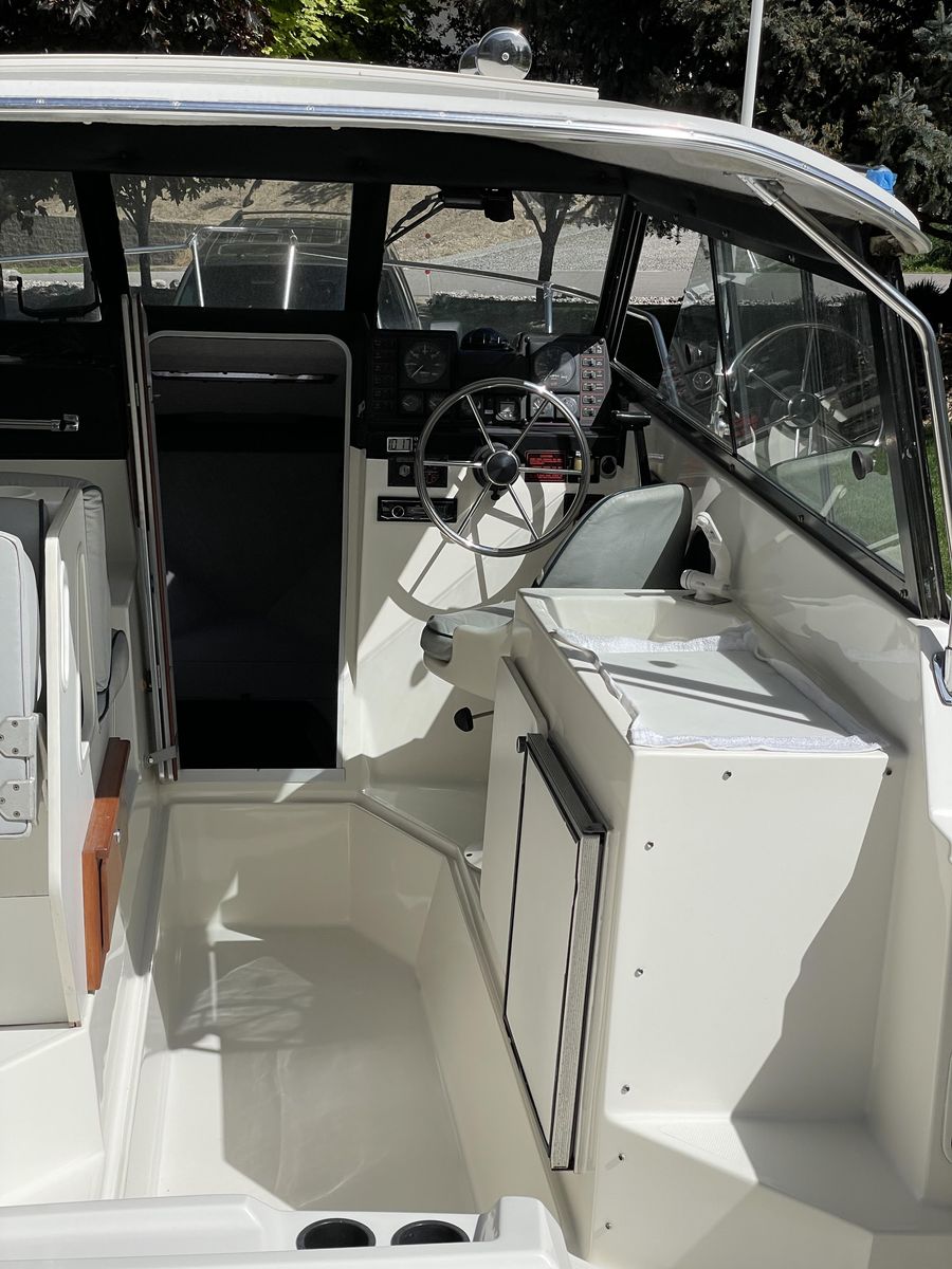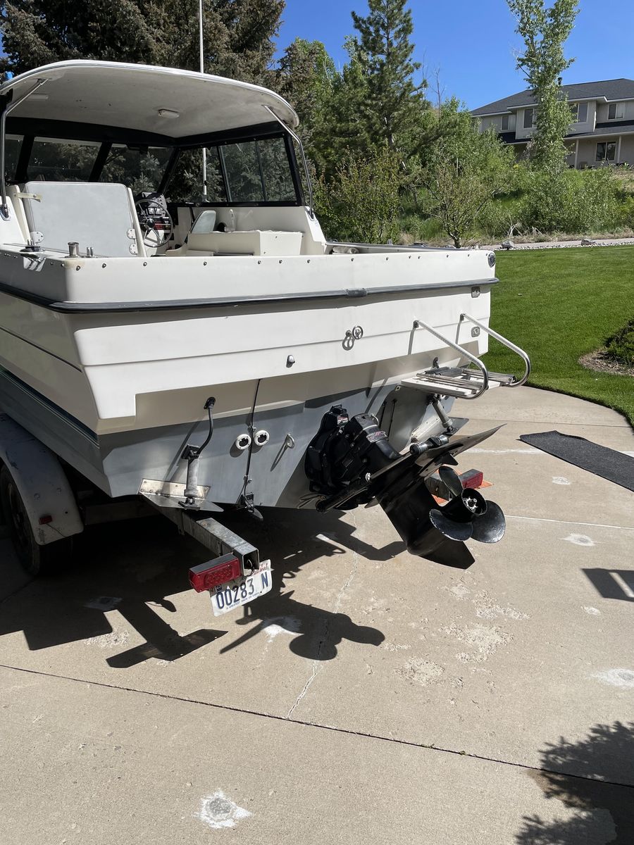 1991 Bayliner 2159 hardtop cuddy in great condition, all fiberglass interior (no plywood), w/twin axel galvanized trailer, Goodyear Endurance US made tires, all in great condition. 4.3 liter Mercruiser I/O 1053 hrs. Professionally maintained. Hydraulic trim tabs. New outdrive rams. Circulating bait tank. Below deck fish cooler. 20” Lewmar Ocean deck hatch, anchor rode deck pipe, anchor tensioner, dock line chocks, radar arch. Galley with 12V water system and ice box. All LED interior, cockpit lighting and gunnel lighting. Sleeps 3 (2 in V berth and 1 in quarter berth). Like-new interior cushions with new firm foam. Full suite of canvas accessories: bimini, cockpit cover, bulkhead cover, side and windshield curtains, side window screens, full custom camper enclosure with screens and roll-up/removeable windows, 2 sets of cockpit carpets, full custom winter cover, Port-a-Potti. 4 step extendable swim ladder with boarding handle. Electronics: JVC CD/XM/Bluetooth stereo, ICOM DSC/GPS marine radio, Humminbird Helix 7 DI GPS fish finder, CO monitor, fuel vapor detector. Extra prop and many maintenance items. Excellent for overnight stays. $15,000. 435-294-5677 or 435-294-5491.