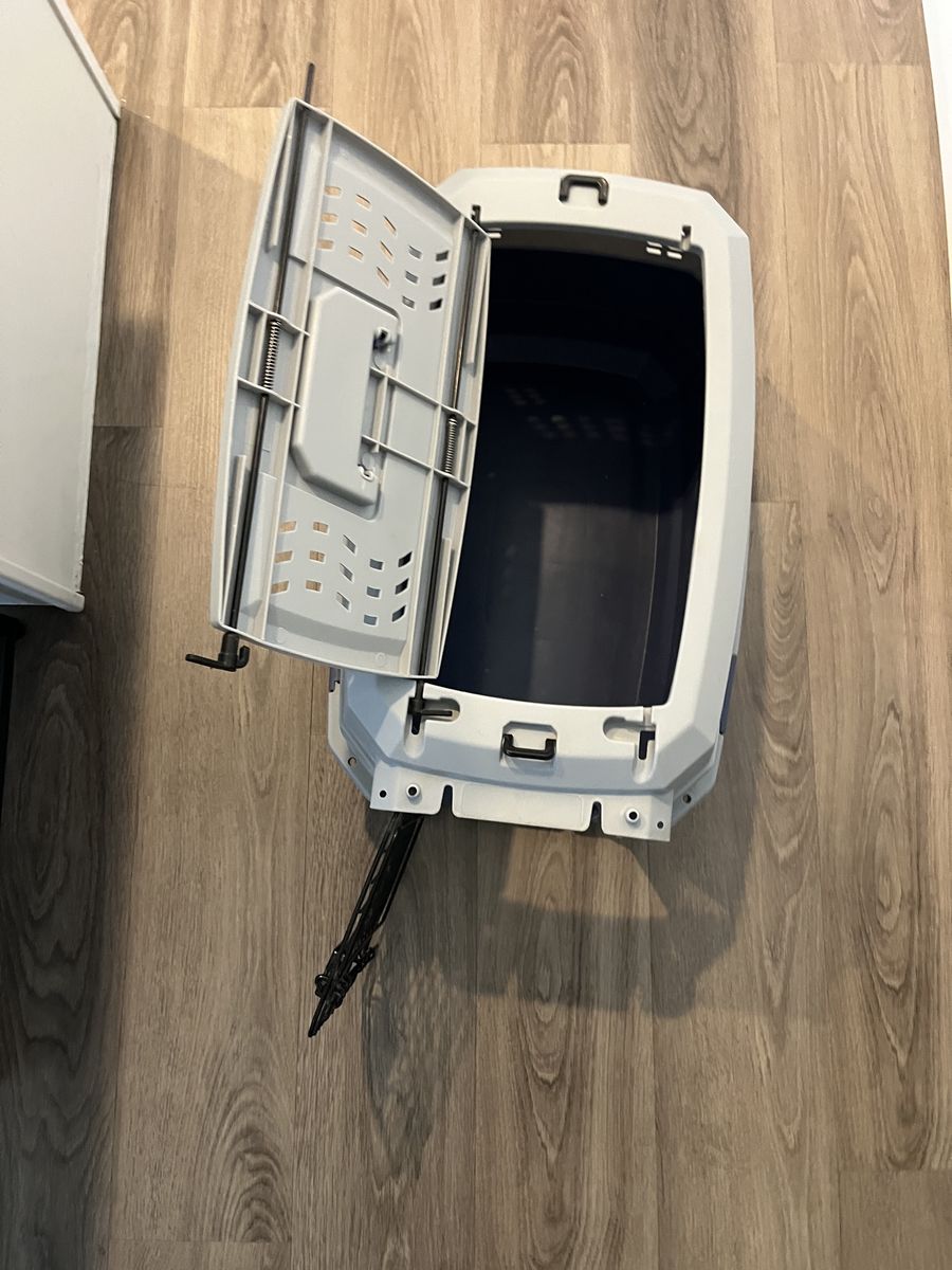 Small dog or cat carrier. 2 door gray and blue. 19 inches long, 12 inches wide and 10 inches tall.