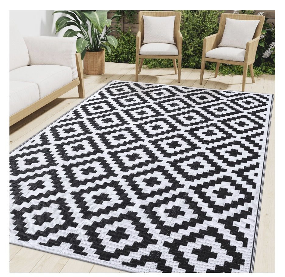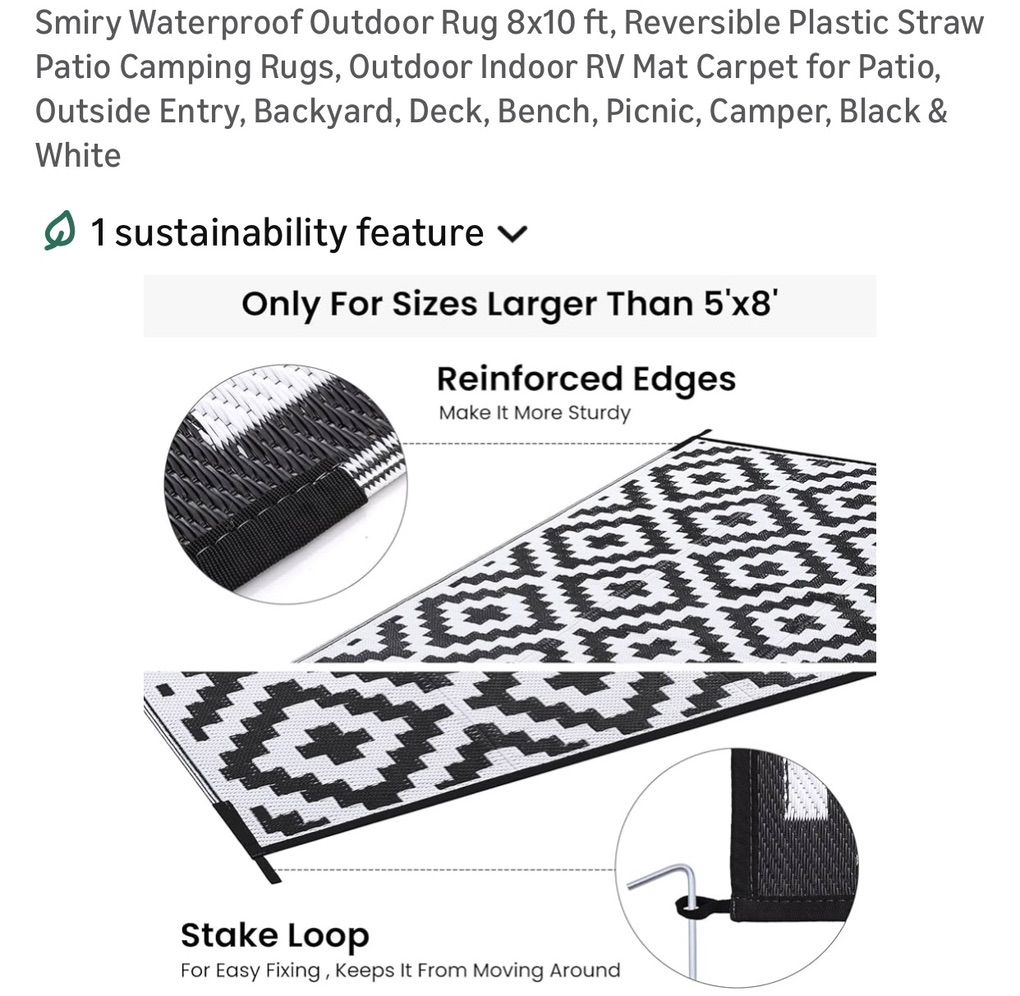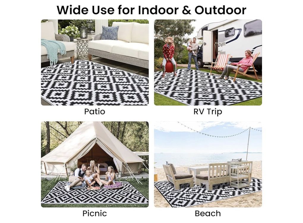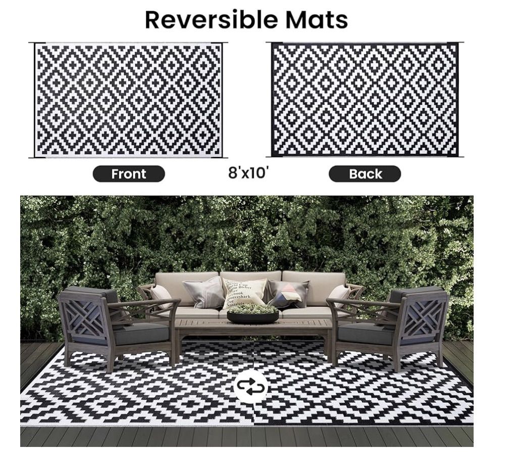 VenmoSmiry Waterproof Outdoor Rug 8x10 ft, Reversible Plastic Straw Patio Camping Rugs, Outdoor Indoor RV Mat Carpet for Patio, Outside Entry, Backyard, Deck, Bench, Picnic, Camper, Black & White. New. $60