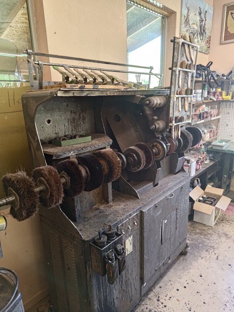 Shoe shining unit, works great runs on 220v. Come with a bunch of leather dye and burnishing ink and wells as burnishing irons