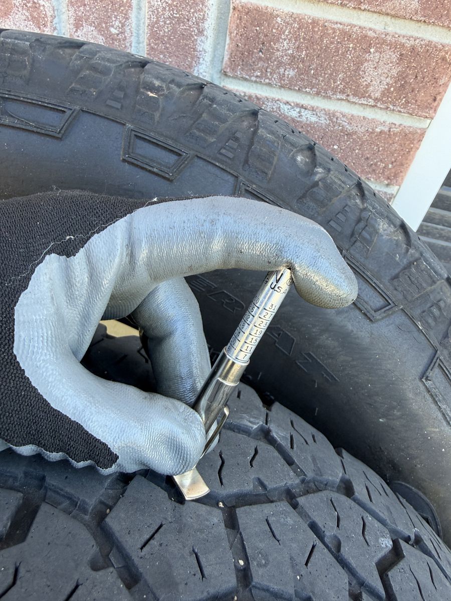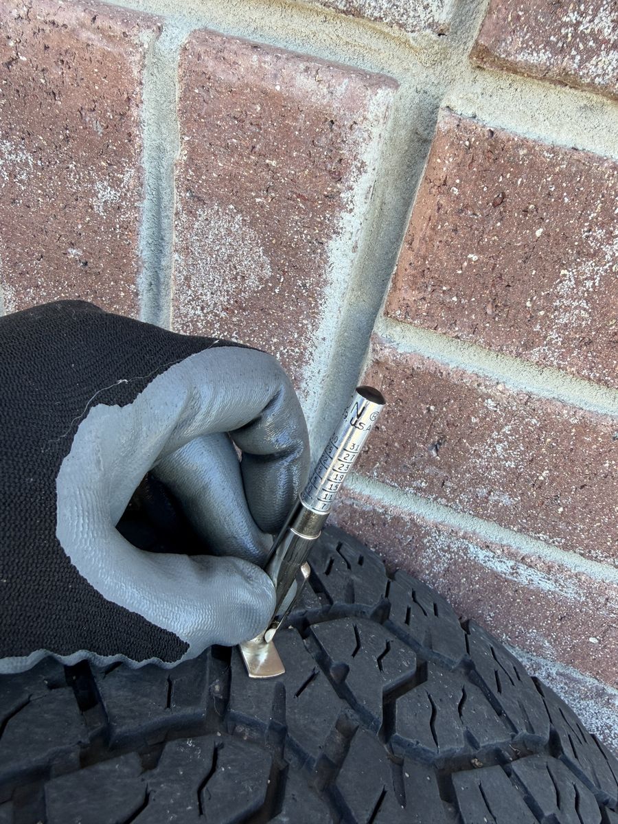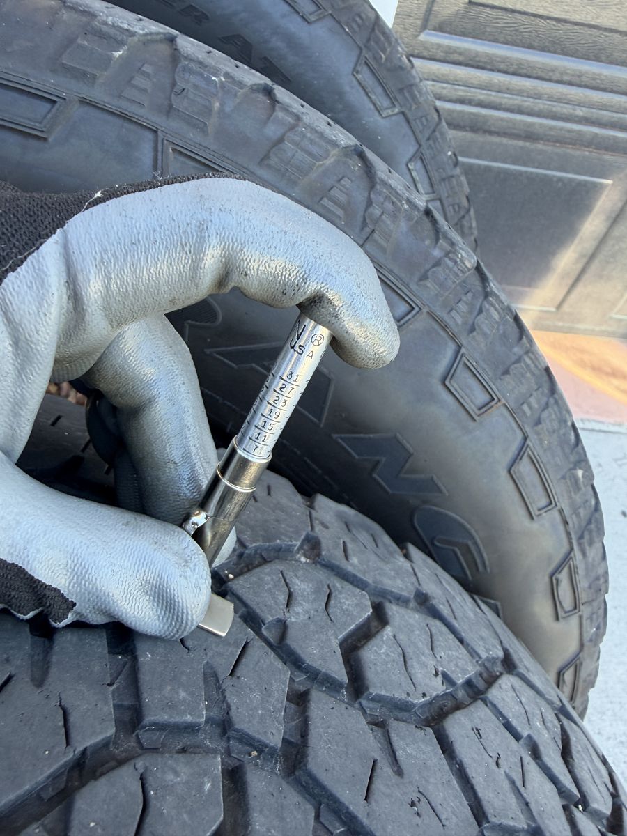 7/32" depth on each of the tires (12/32" from factory) so just over 1/2 tread left. I added a photo of the specs for reference.