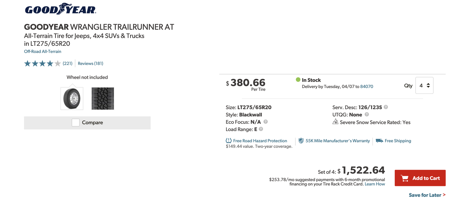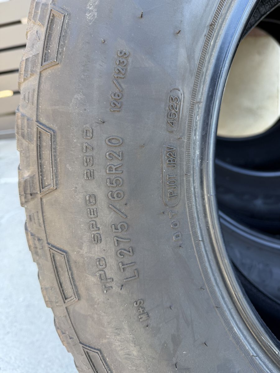 VenmoFor sale are (4) Goodyear Wranlger Trailrunner AT in 275/65/20 (E Rated). These are in great shape and have never been repaired or had a flat or damage, 2023 build date. M+S and Snowflake rated.
