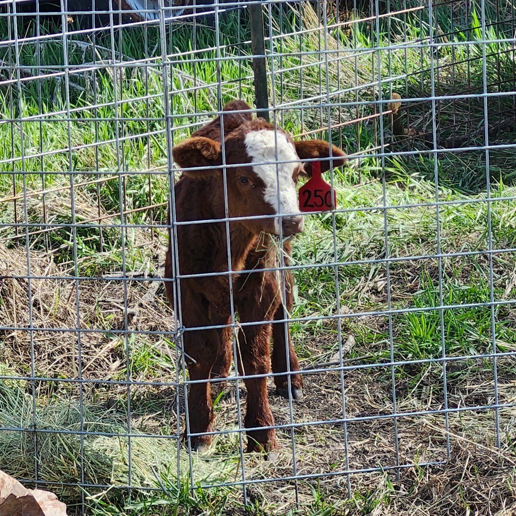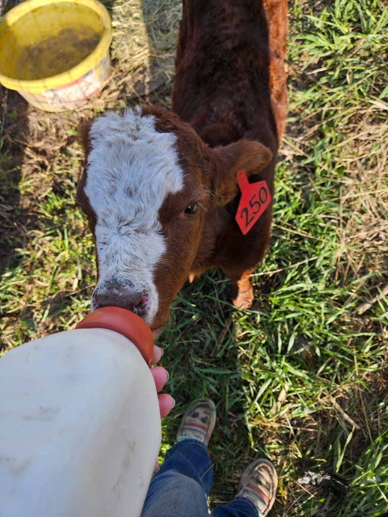 Simmental Angus cross. Born march 11. We've had this calf on a bottle for a few days. Mom wasn't taking care of her. She takes a bottle well and is starting to nibble on alfalfa and grain.
