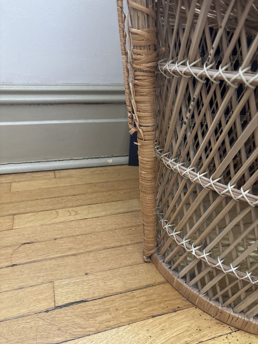 CashAppCute peacock chair, very sturdy, in pretty good shape. Minor damage on one leg. About 53x33.