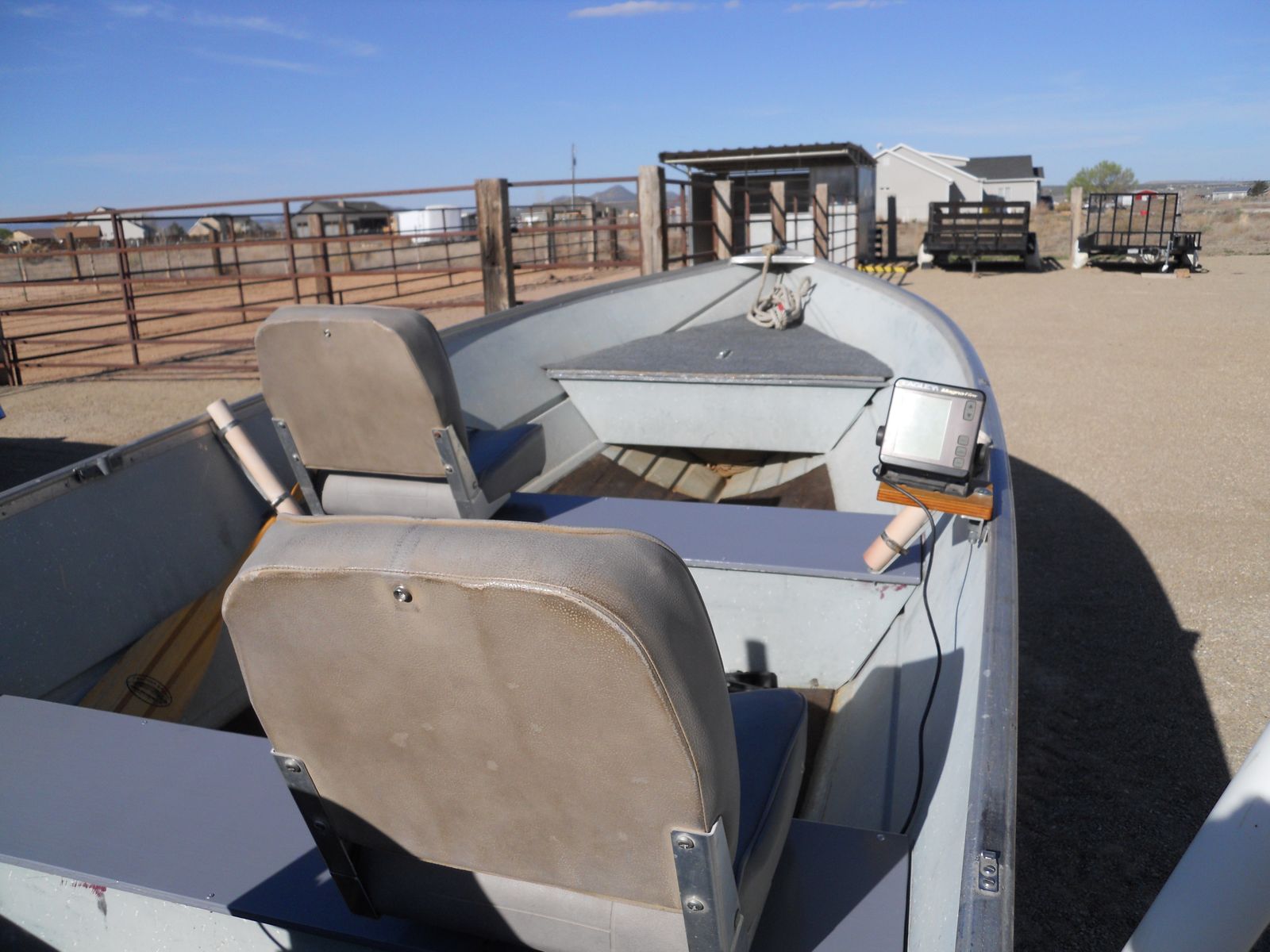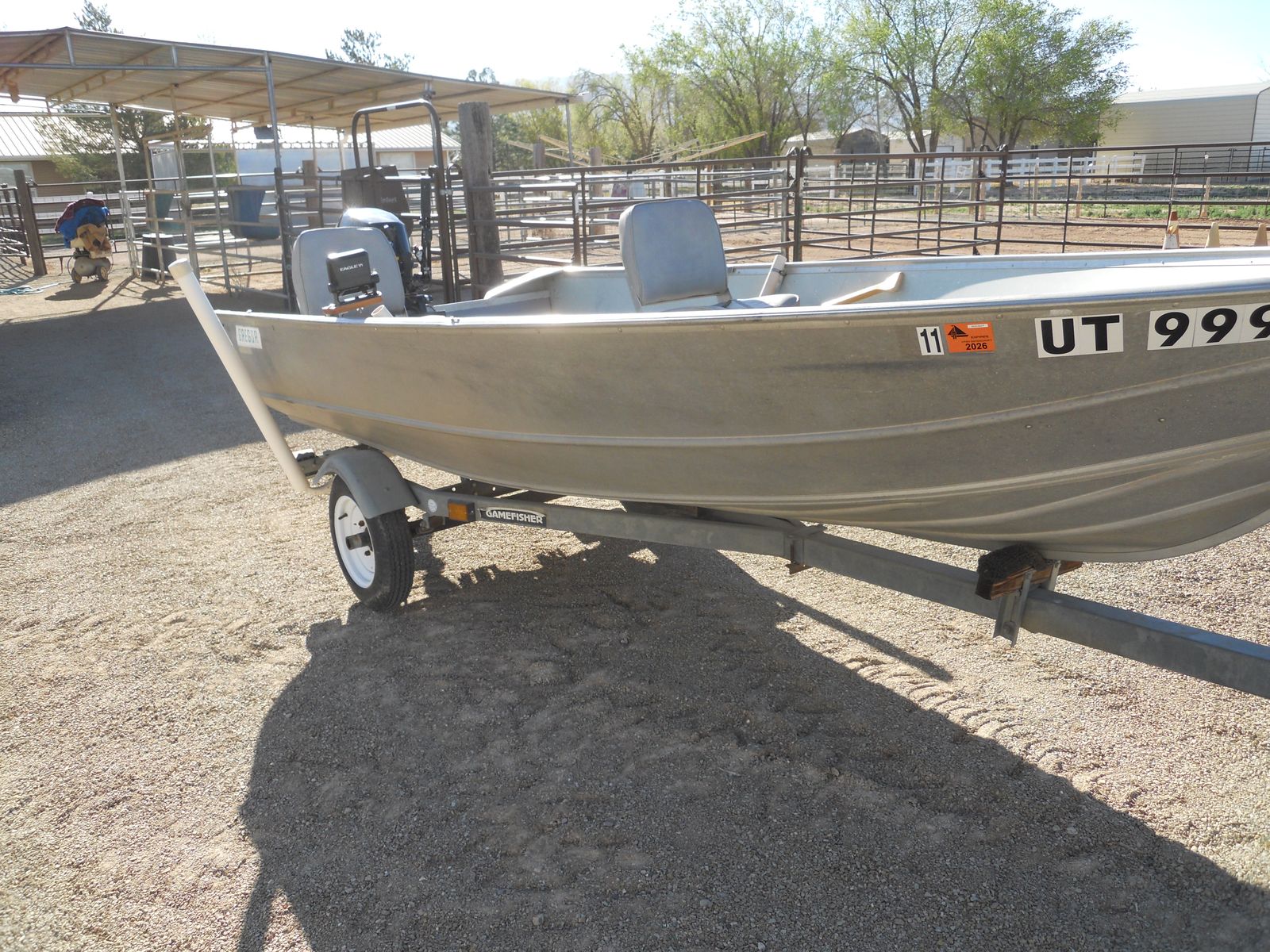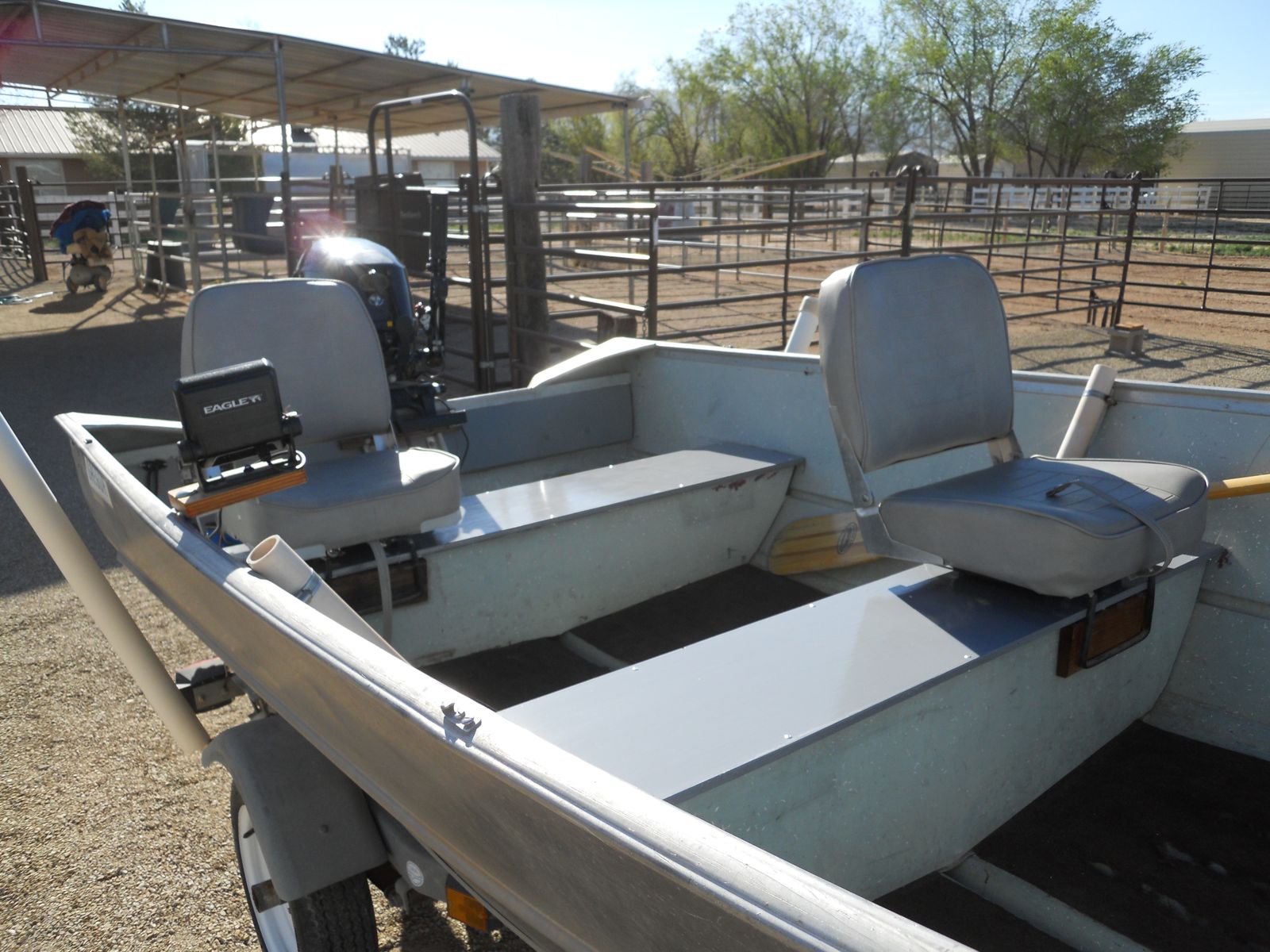 14' Gregor all welded aluminum fishing boat on a galvanized trailer with new LED lights, wiring and a spare tire. 4 cycle 20 HP Tohatsu outboard motor with fuel injection, electric start and power tilt and only 15 hrs on the motor. Toyhatsu is the largest manufacturer of small outboard motors and makes the small motors for Mercury. Swivel seats, depth/fish finder, 2 gas tanks, all safety equipment. Sunbrella cover. Ready for the lake.