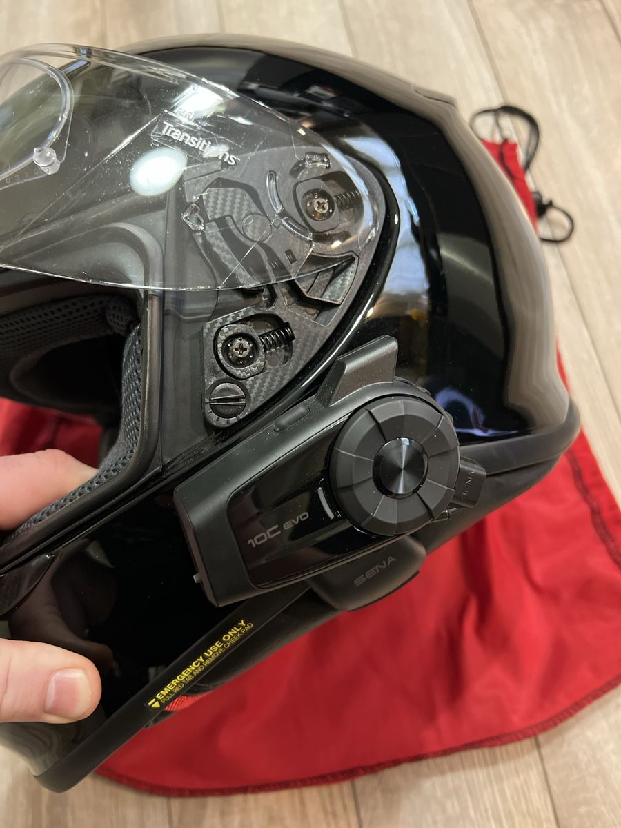 Shoei RF1200 in gloss black with Sena 10C Evo Bluetooth comms system and 4k camera. This helmet has the pin lock installed and a transitions lens…all like new worn once. I have XL cheek pads and XXL cheek pads to go with the helmet. $400 cash only