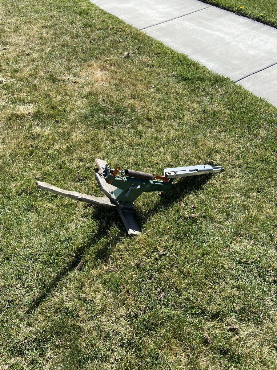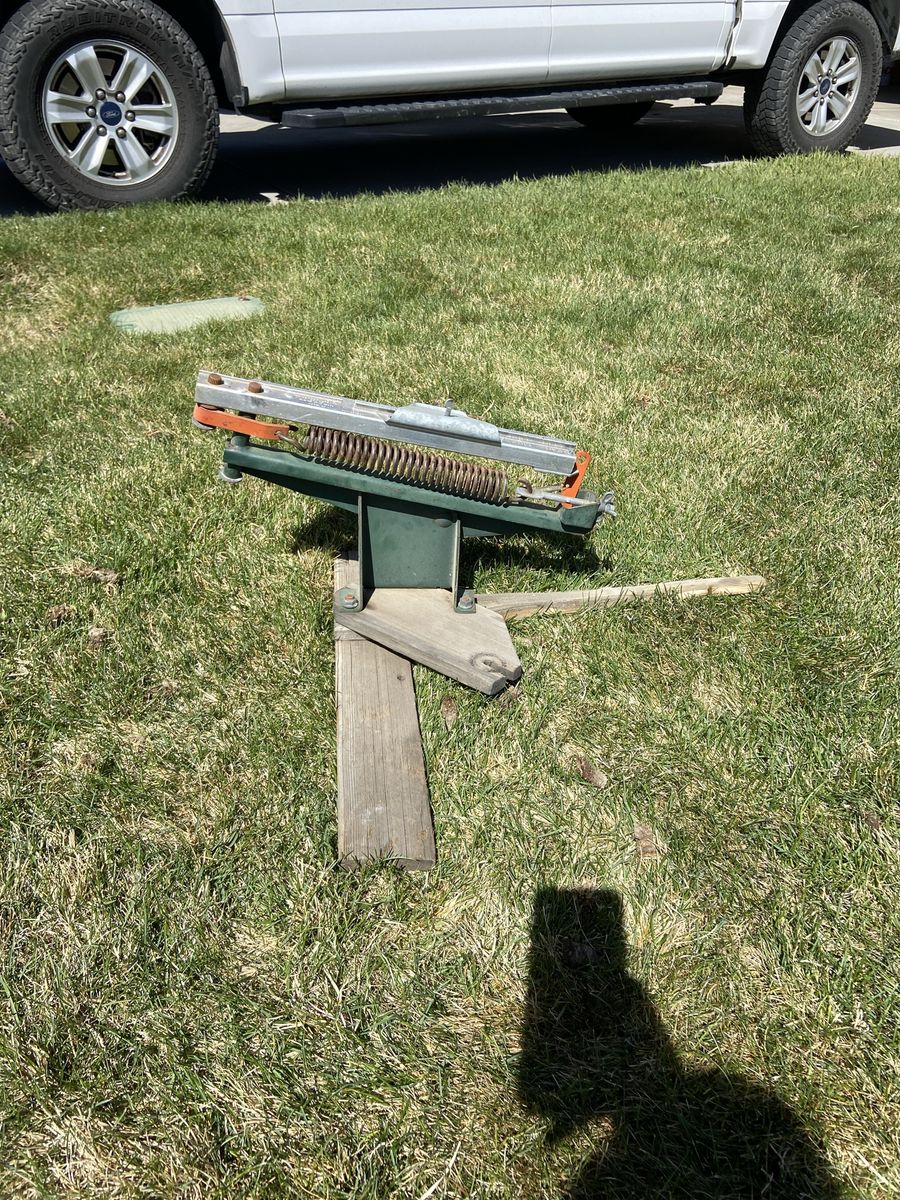 Works fine just needs some love. Wood got old and broke. To make it perfect again just get some new wood and mount it on a tire or something.