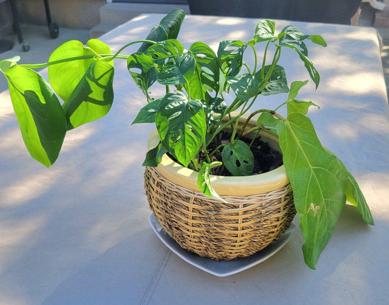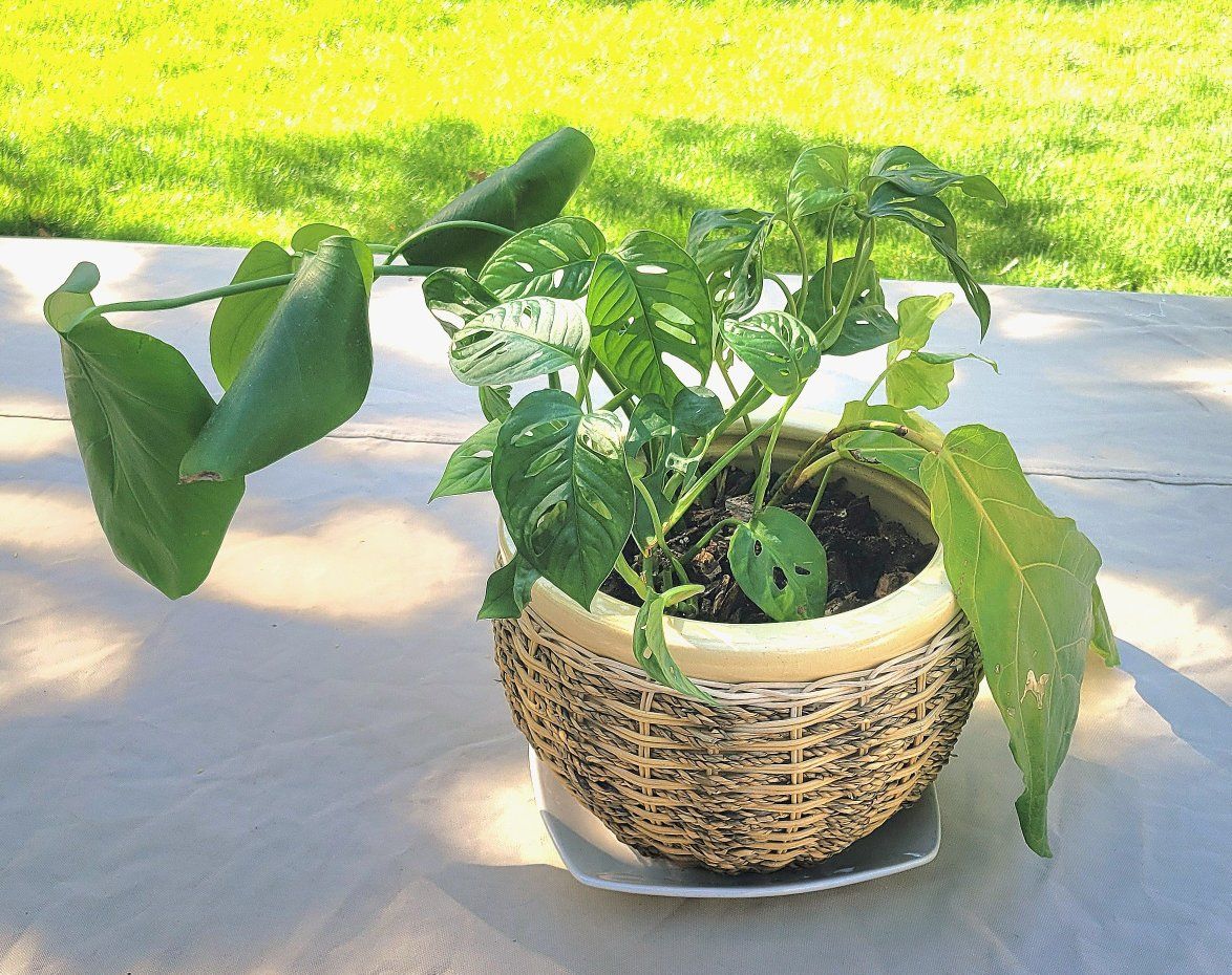 Large ceramic pot with woven basket accent. A variety of 3 different living plants.