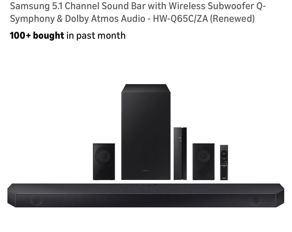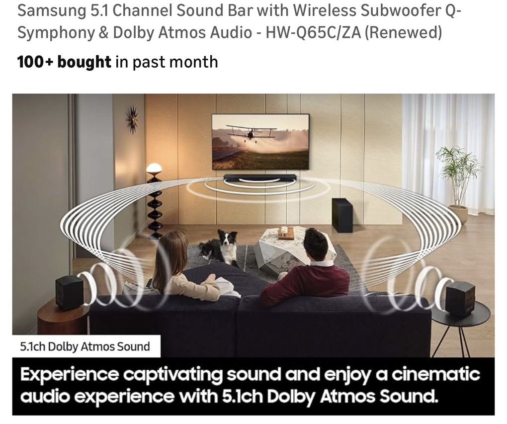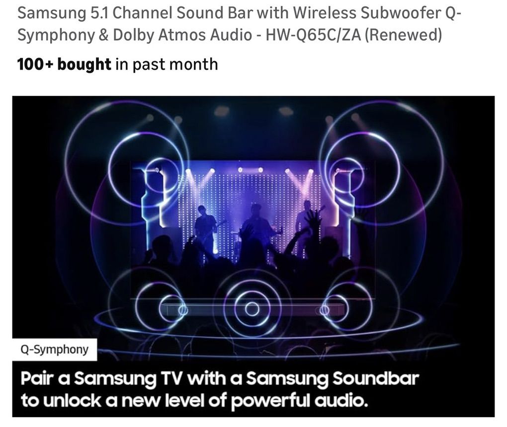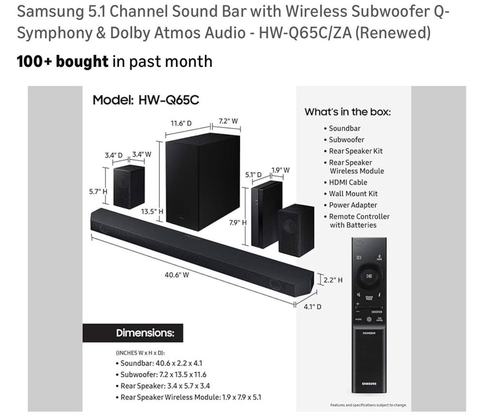 VenmoQ-SYMPHONY. - Amp up your audio with the greatest duo of all time—Samsung TVs paired with Samsung soundbars. With Q-Symphony, your TV speakers paired with Q-Series soundbars operate as one 5.1 CH. DOLBY ATMOS SOUND. - Experience captivating sound and hear more during your favorite shows, songs, and movies with 5.1ch Dolby Atmos sound Rear Speaker Kit Included: Complete the all-around audio experience with our included rear speaker kit that helps boost the sound from your TV HDMI eARC: This single HDMI cable connection passes advanced audio like Dolby Atmos from your TV to your soundbar. One cable is all you need for a high-quality connection that won’t degrade your sound. Requires an HDMI eARC-compatible TV Game Mode: Optimize your gaming experience with perfectly synced directional audio that moves with the onscreen action. Game Mode eliminates distractions so you can hear better and play harder. So next time the game is on the line, you’ll have a leg up on the competition. Compatible with Gaming Hub and select gaming consoles (e.g. Xbox X, PS5). Gaming Hub requires a compatible TV and subscription. Please refer to Samsung.com for more information Bluetooth Multi Connection: Easily connect two smart devices simultaneously to share control of the Soundbar without having to disconnect every time. Conveniently play your favorite music from different devices. Soundbar mobile connection is not available when connected to the TV. Requires Bluetooth-compatible devices Adaptive Sound Lite: Enjoy dynamically optimized audio with enhanced voice clarity so you can follow along with action-packed games and blockbuster films. Scenes are analyzed in real time to amplify the most important audio based on the type of content