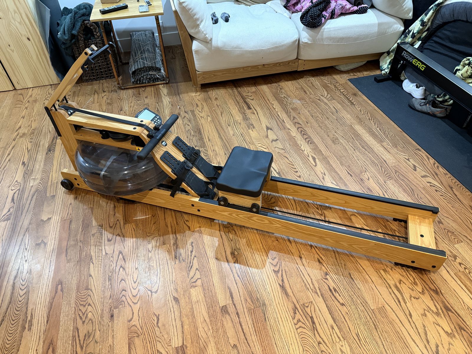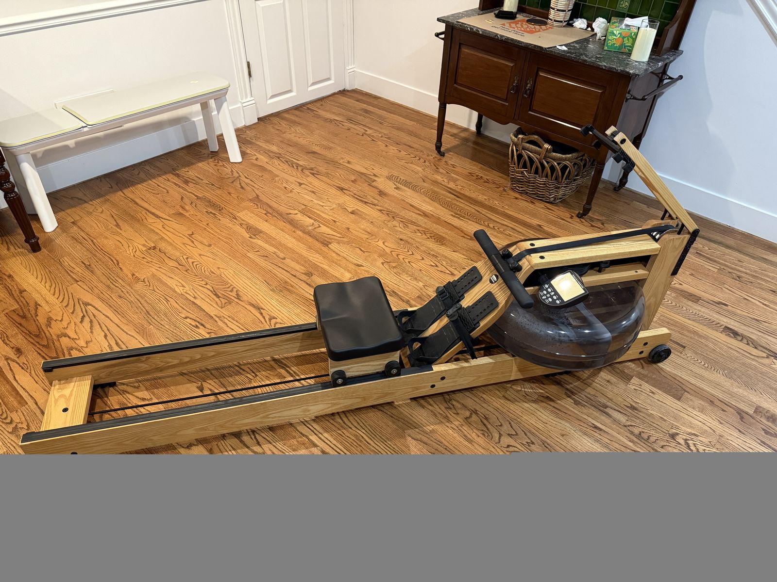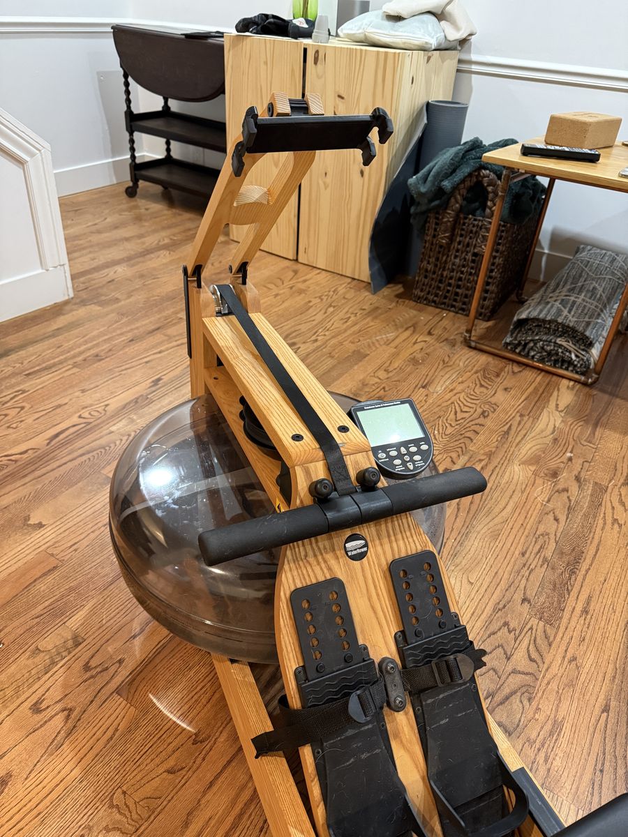 Zelle2018 wooden WaterRower for sale. Comes in natural Ash with Honey Oak stain. Also comes with the upgraded footboard and the SmartRow Bluetooth pulley system with the iPad arm mount. The original S4 performance monitor is still installed as well. Selling because we also have a Concept2 and don't have room for both systems. Price when new was $1,250.