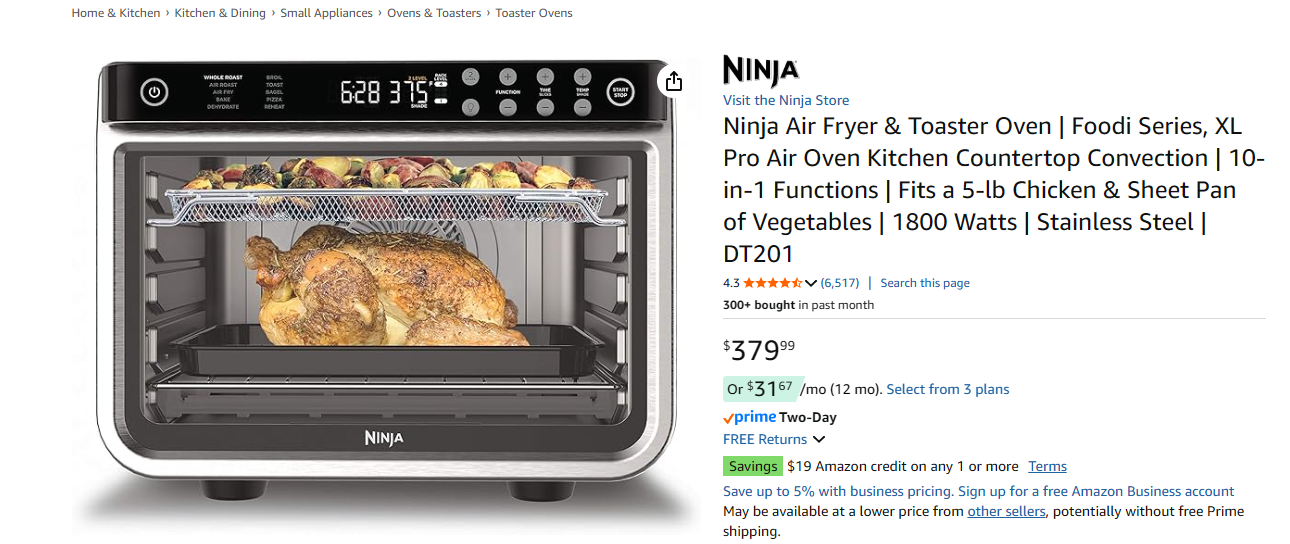 Foodi Series, XL Pro Air Oven Kitchen Countertop Convection | 10-in-1 Functions | Fits a 5-lb Chicken & Sheet Pan of Vegetables | 1800 Watts | Stainless Steel | DT201