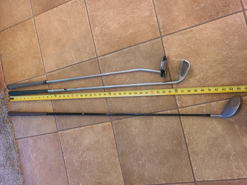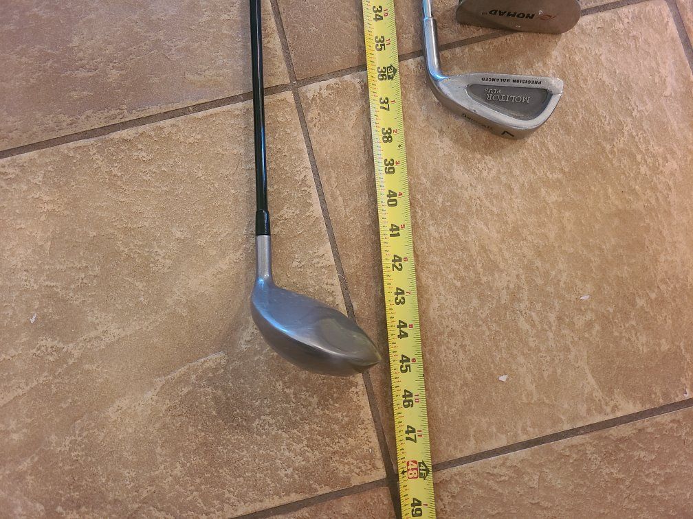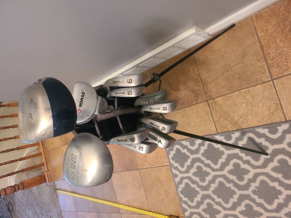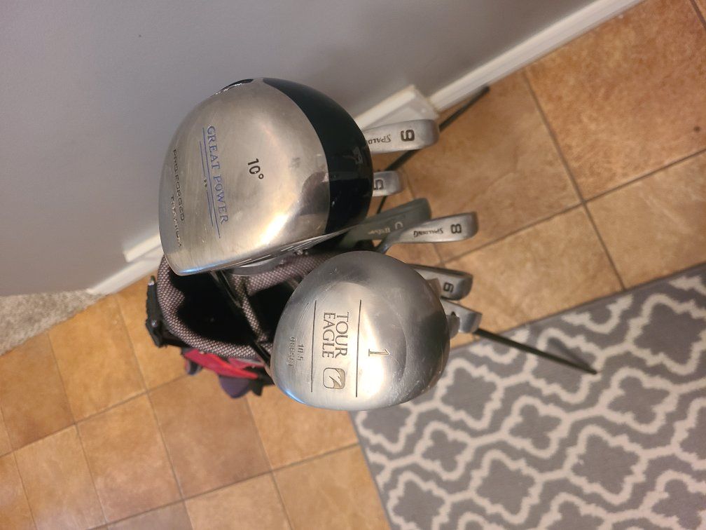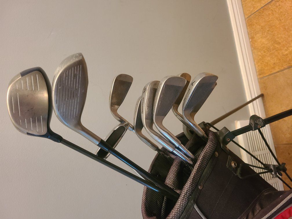 set includes bag with stand, drivers, irons, pitch and putter.