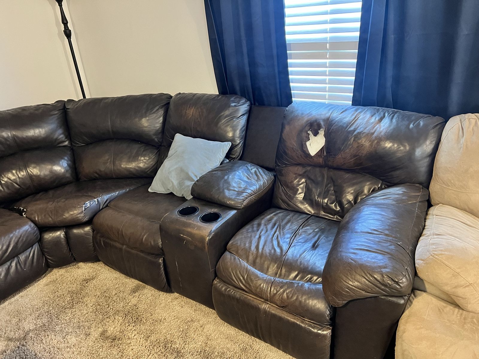 Very comfortable L sectional couch. Has a tear in one of the back rest. Has Three recliner. Will need to bring tools to disassemble, and muscle as it is heavy duty. Cash only. Or will trade for a pull out couch.