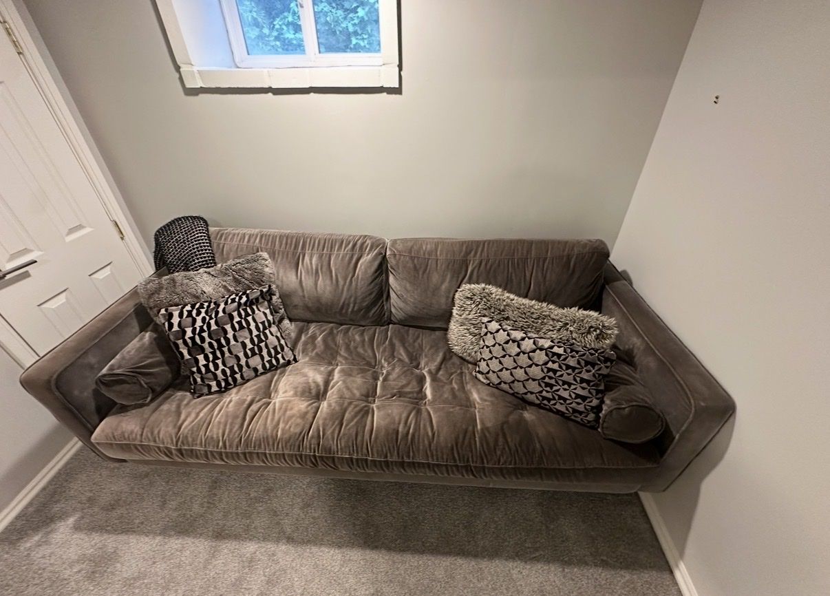 VenmoVery comfortable article Sven couch, gray velvet. 34"H x 88"W x 38"D