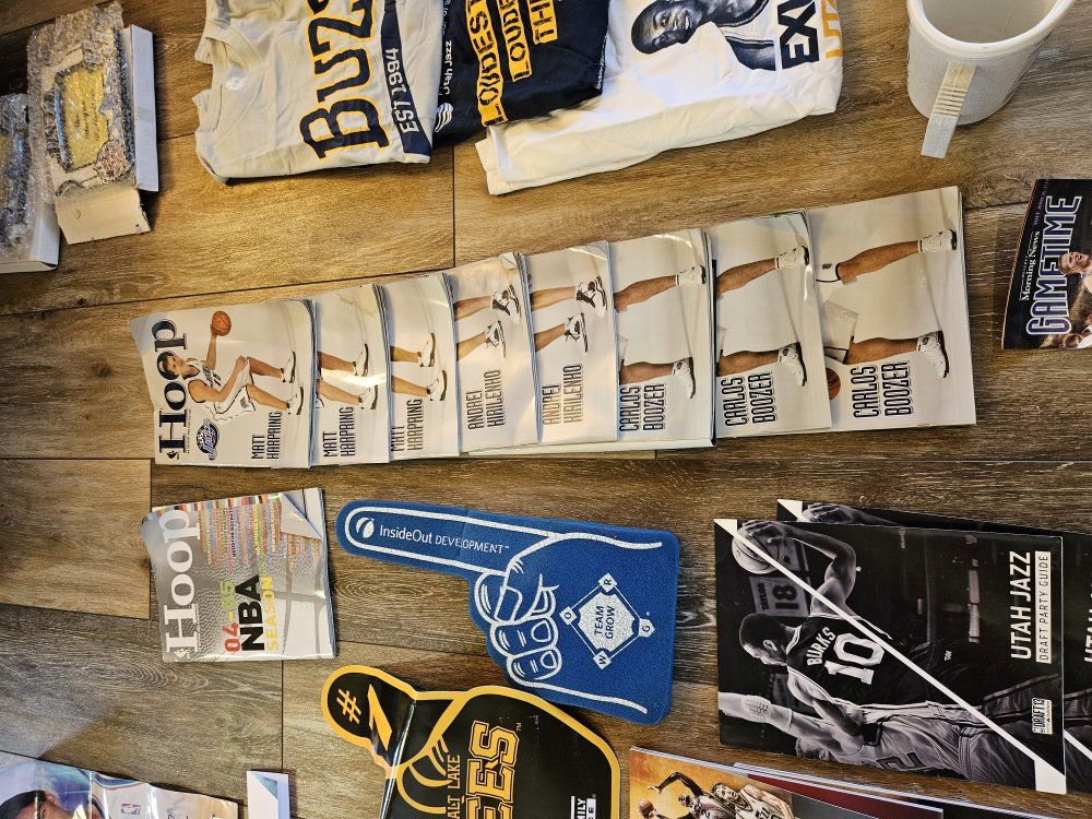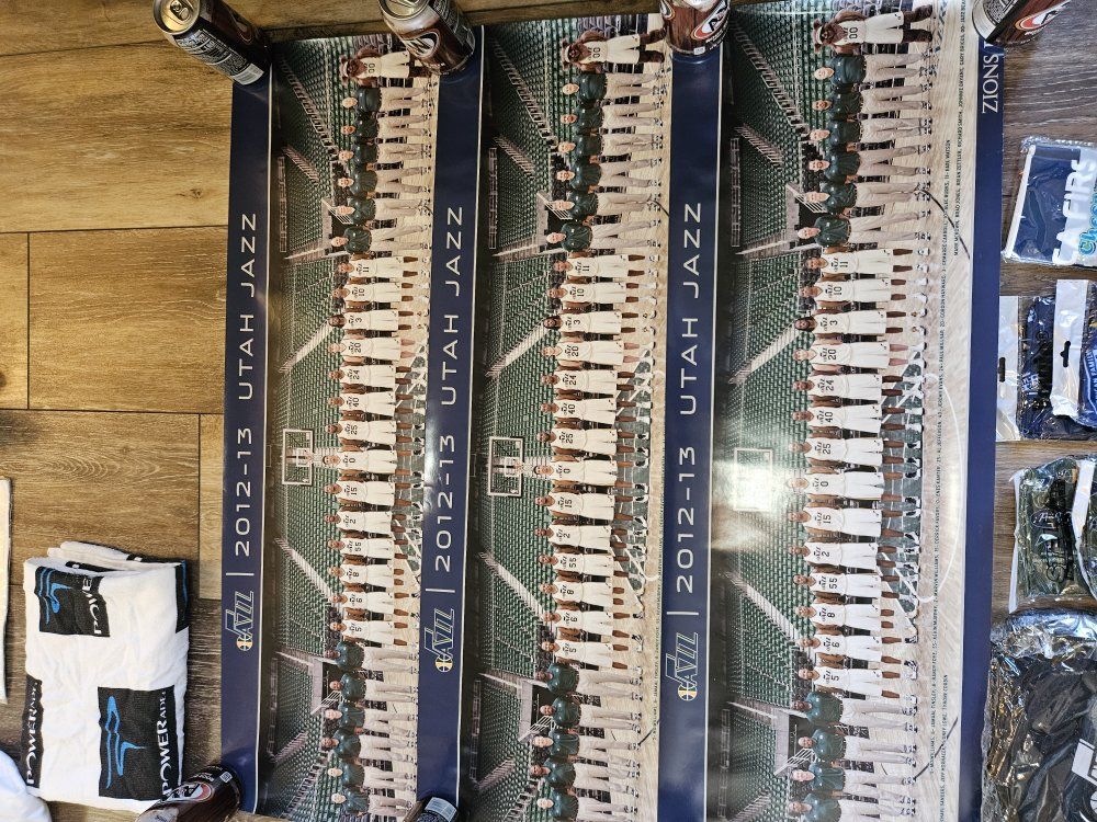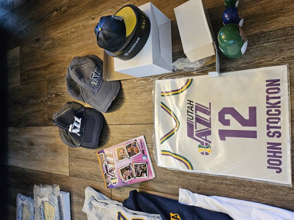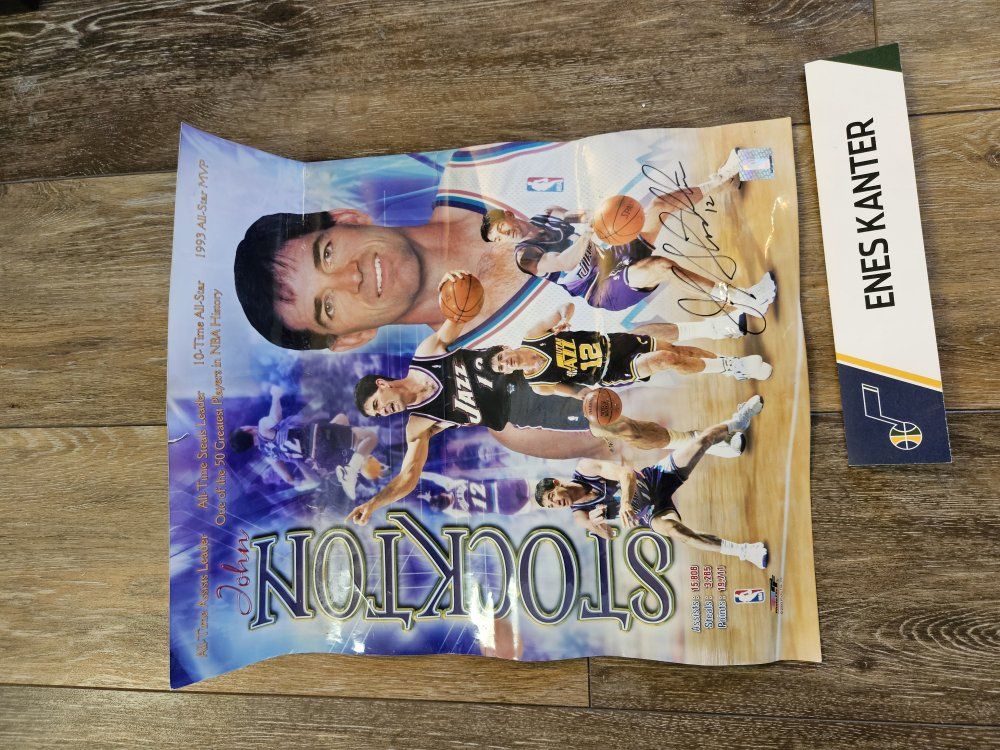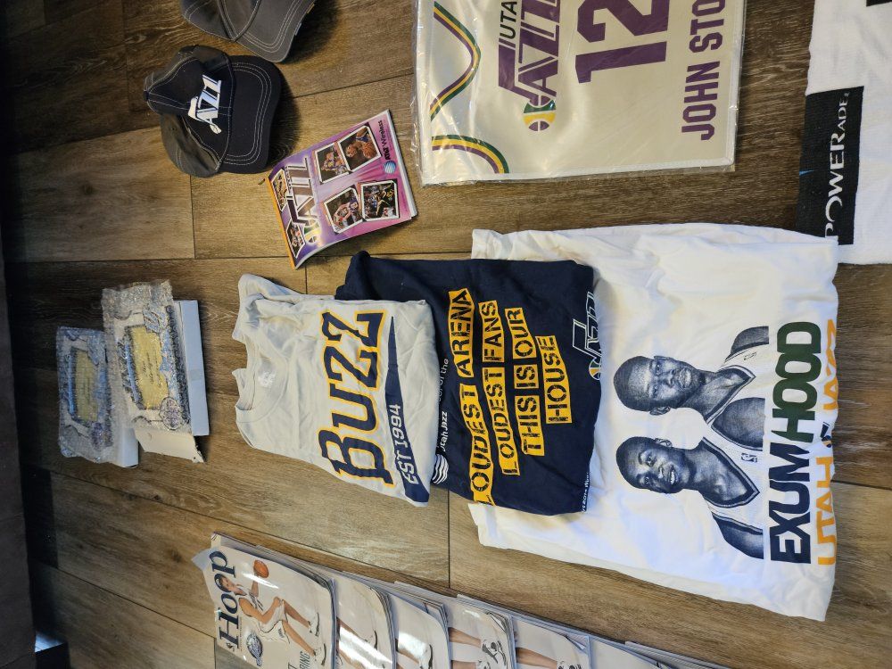 I had a collection of Jazz stuff given to me that I dont have space for. I'm hoping a fan or collector might want it. I will answer any questions I can. there are a lot of programs, towels, shirts, hats, collectibles (nesting doll, piggy bank, picture frames, posters, and some stuff that is sealed up). what you see is what you have. It must all go together though. The John Stockton poster looks like it was wet signed. the others look like the signatures were printed. thanks for looking.