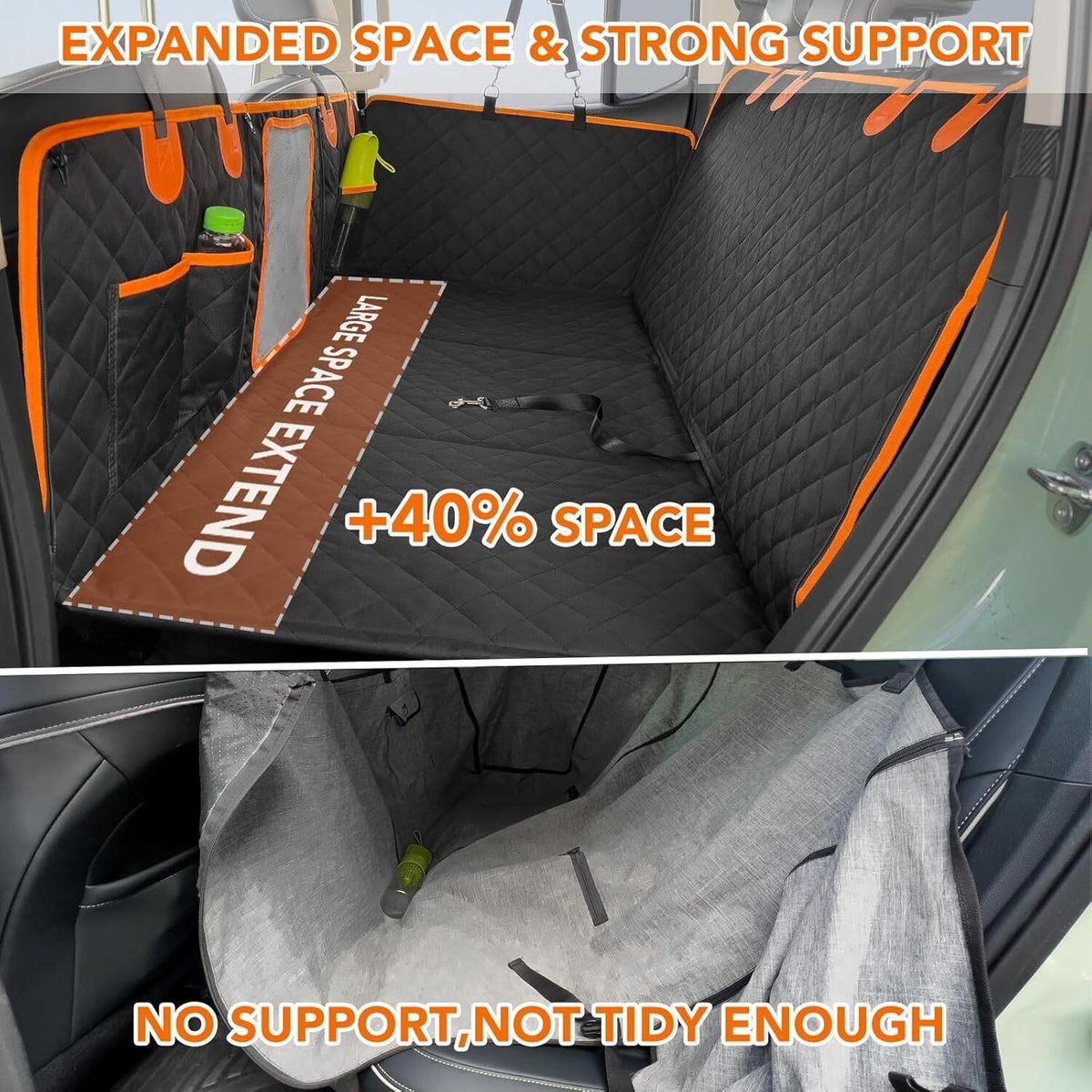Dog car seat extender for dogs size is 52" L * 25" W, fits for most cars, SUVs, and trucks. All straps of the car seat extender are securely fixed, ensuring easy installation without any concerns of loss. Additionally, there are 3 spacious storage bags provided, allowing convenient storage of dog essentials. The back seat protector for dog can be easily stored in your trunk, with dimensions of 26" * 17" * 3". , :