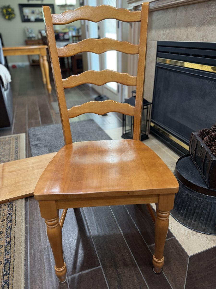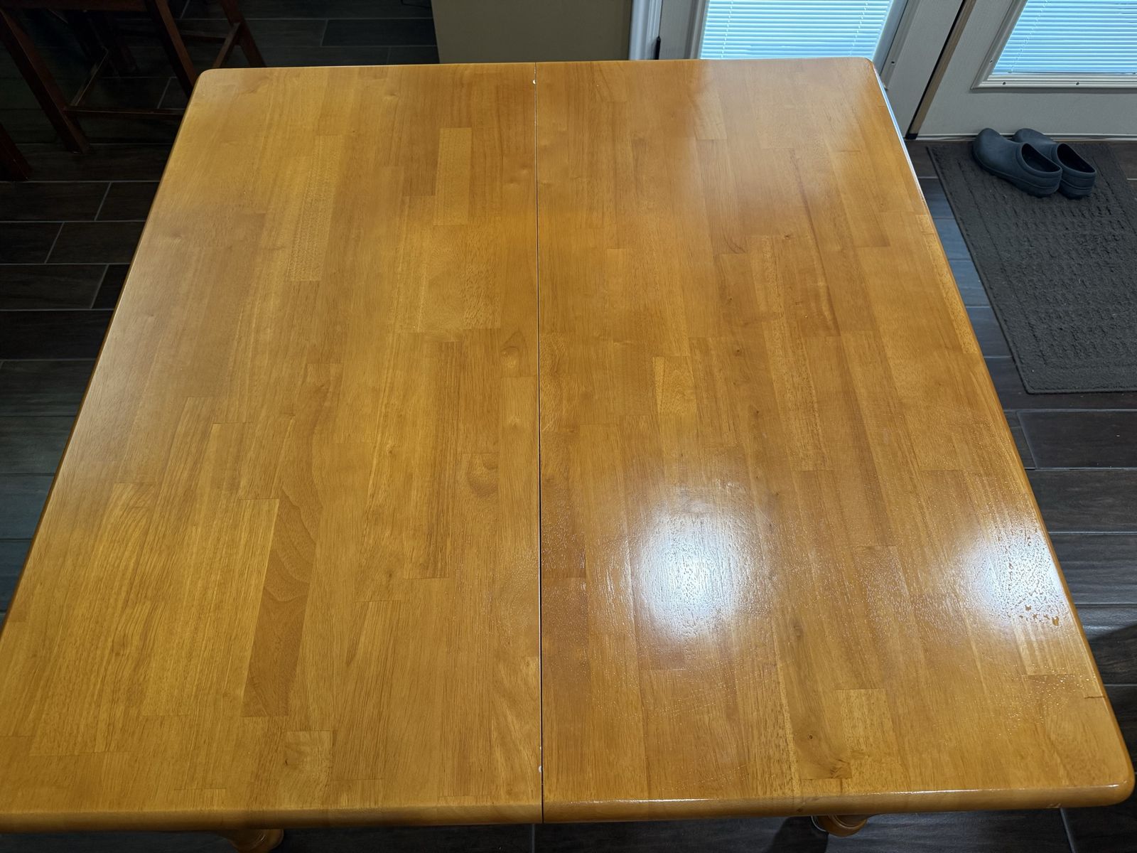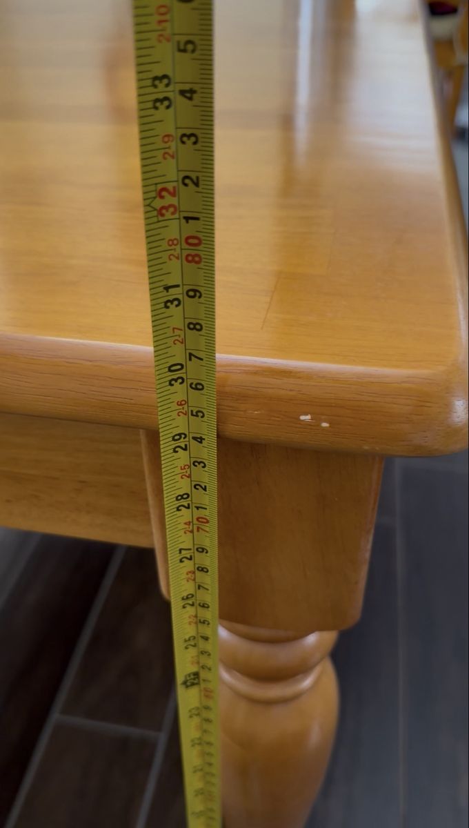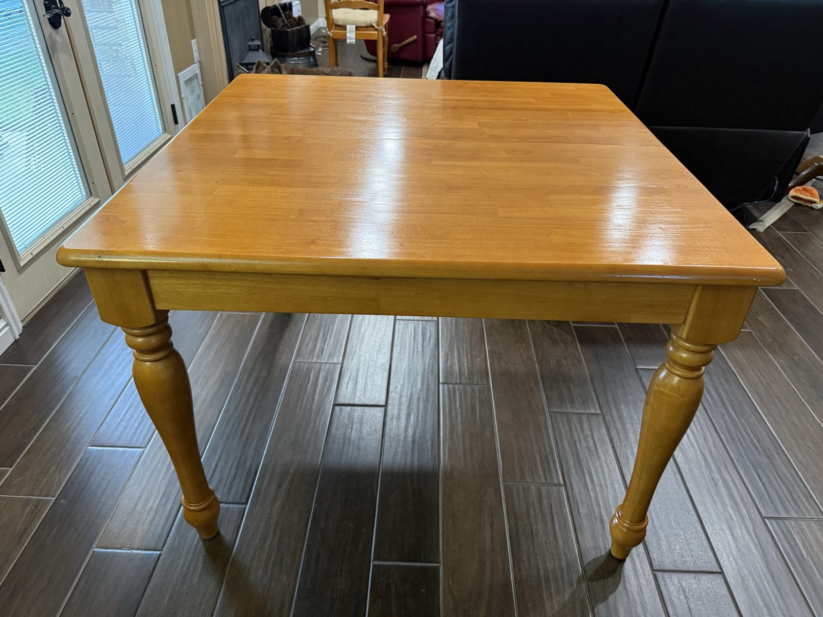 VenmoThe dining table starts as 42” square. The leaf extension is 18 inches. When fully extended you get 60 inches. I wanted more space around the table when family came to dinner so my husband built a table top that fits on top of the fully extended table. The table top is 4’x7’. The original set comes with 4 matching chairs.