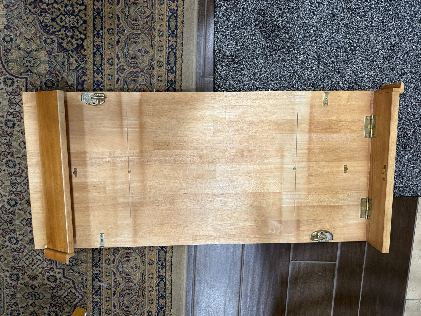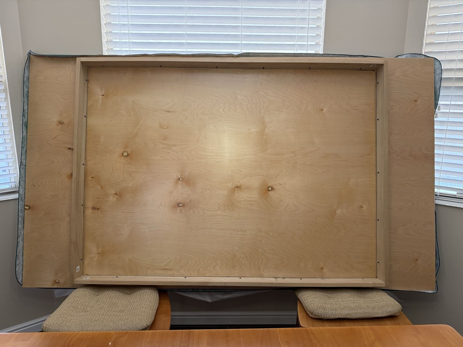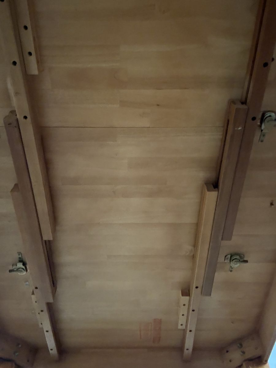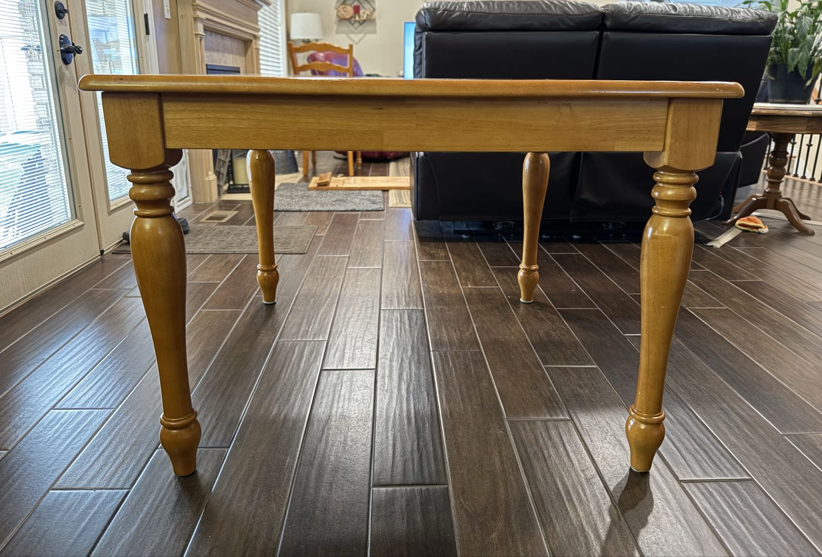 VenmoThe dining table starts as 42” square. The leaf extension is 18 inches. When fully extended you get 60 inches. I wanted more space around the table when family came to dinner so my husband built a table top that fits on top of the fully extended table. The table top is 4’x7’. The original set comes with 4 matching chairs.
