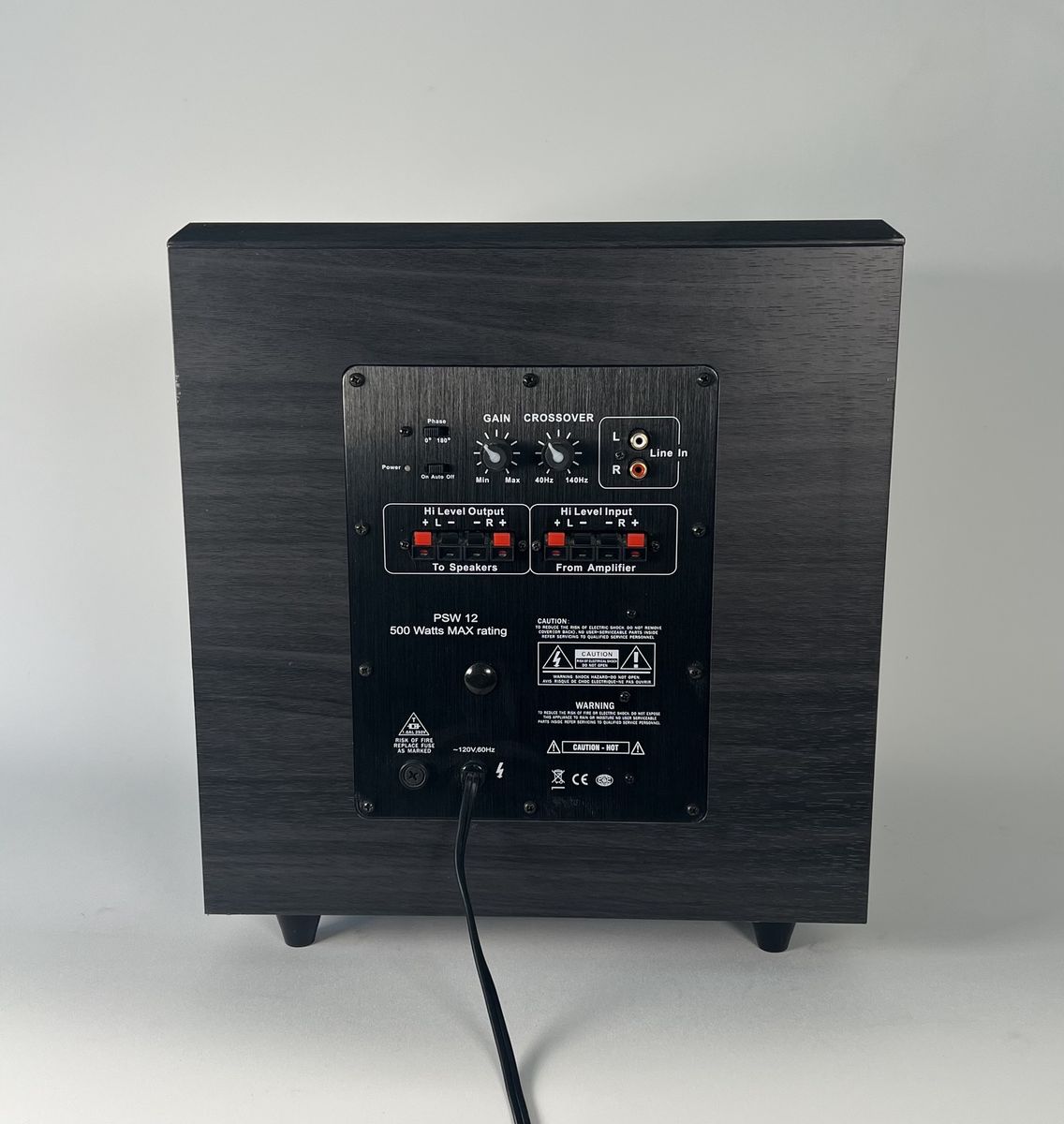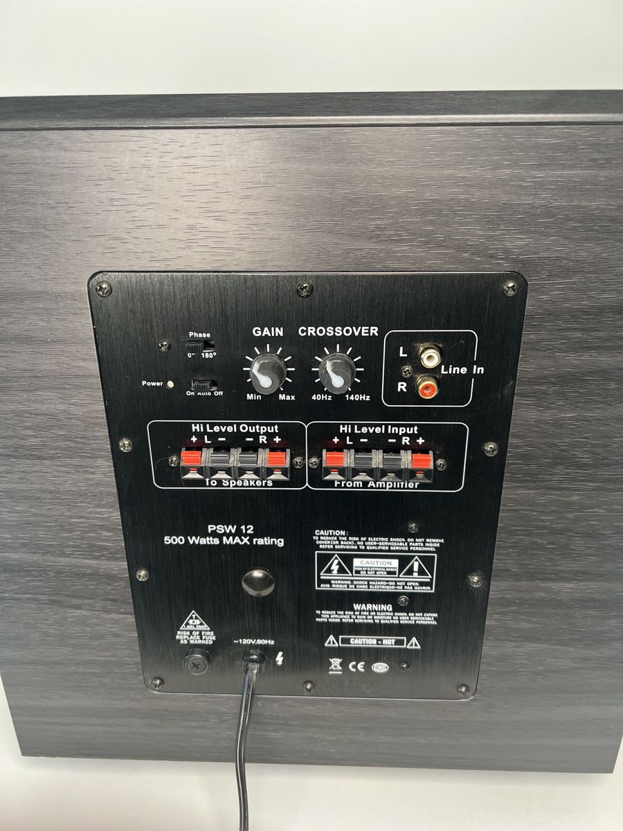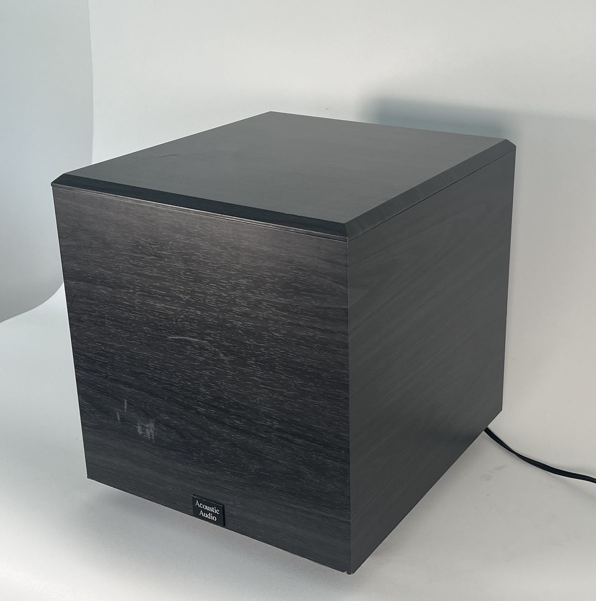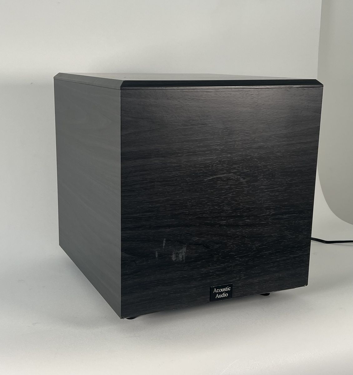 Good condition Acoustic Audio PSW-12 powered subwoofer. Solid unit with nice woodgrain cabinet finish. Shows some cosmetic wear on the front (see photos), but overall presents well.