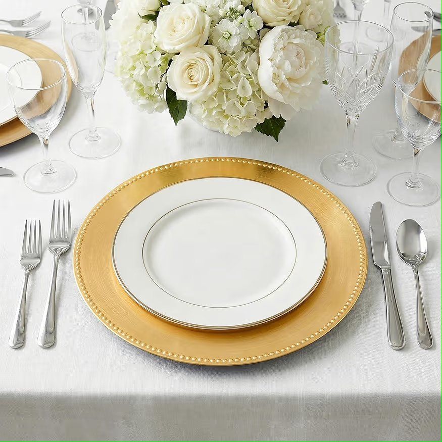 PLEASE NOTE: These charger plates only need to be washed with water and wiped with a dry cloth. They are not suitable for microwave ovens and dishwashers and should not come into direct contact with food.