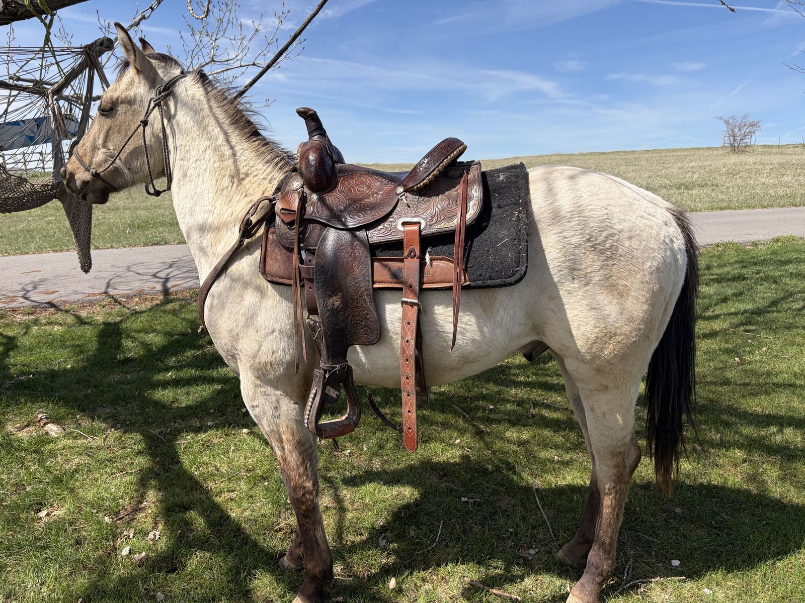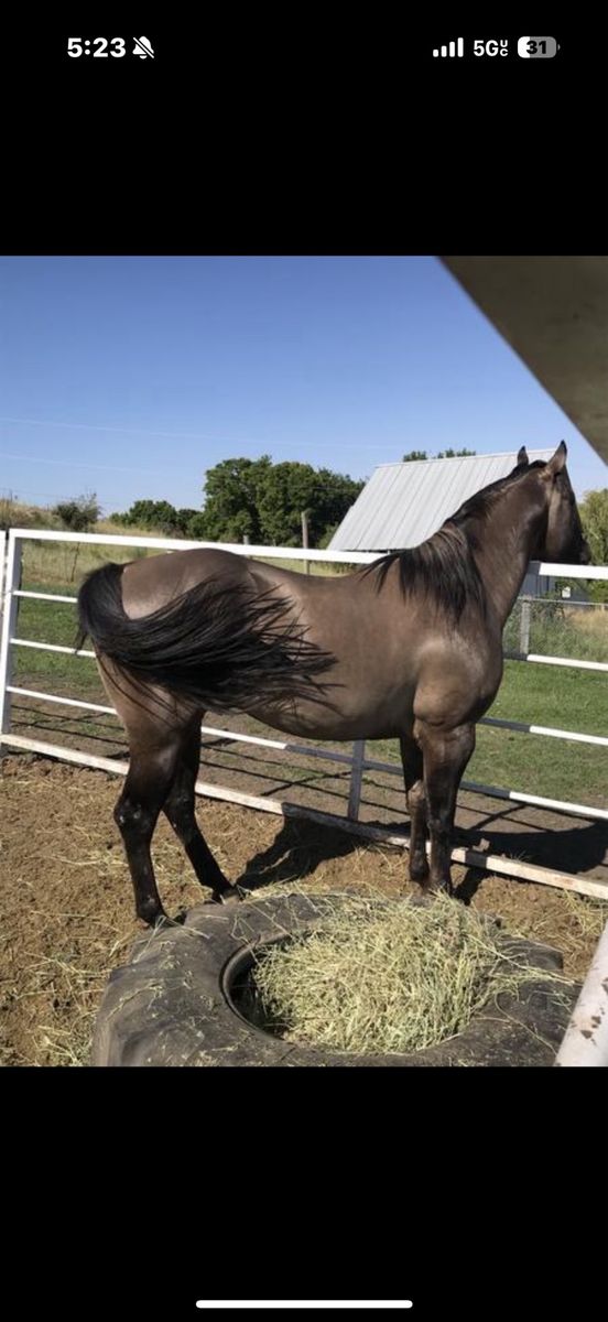 PayPalRipp is a coming 2 year old stout Grullo stud colt with a ton of Dun factor. Bars on his legs and beautiful dun strip. This colt is gentle, easy to be around, and good-minded. I have had the ferrier out to trim his feet. He did awesome. Loads and unloads takes a saddle (0 rides) and is the first one to greet me in the corral to take a halter. He’s built solid and should make a great ranch or pleasure horse . His mom is 16.2hh and super thick. I have pulled stubborn cows around with her. Super cowy and loves to work.