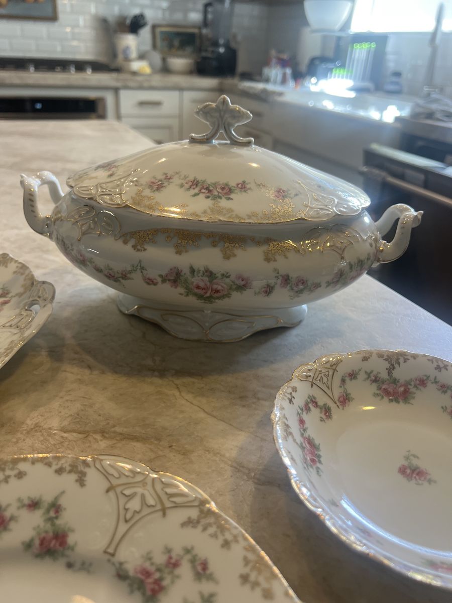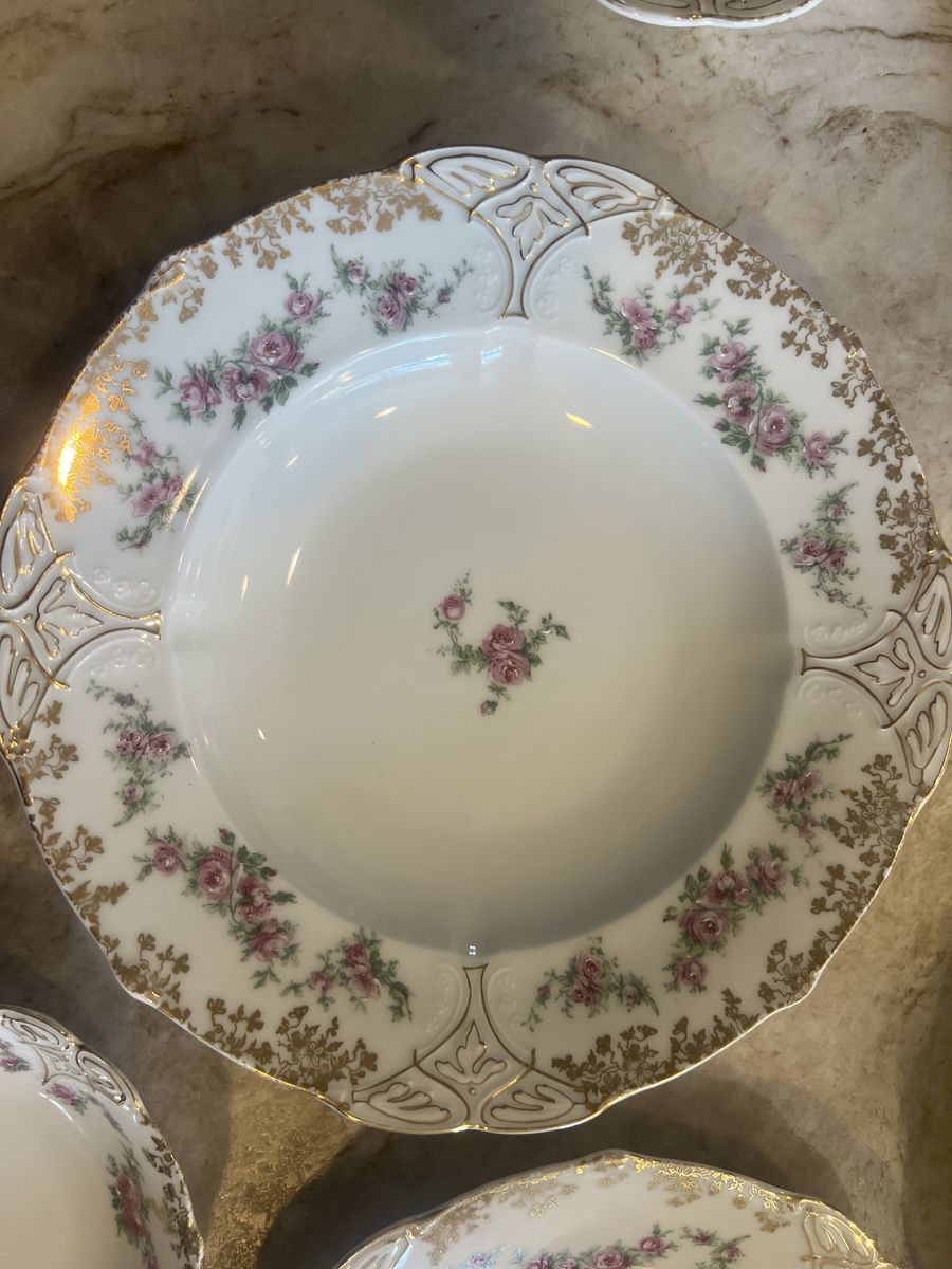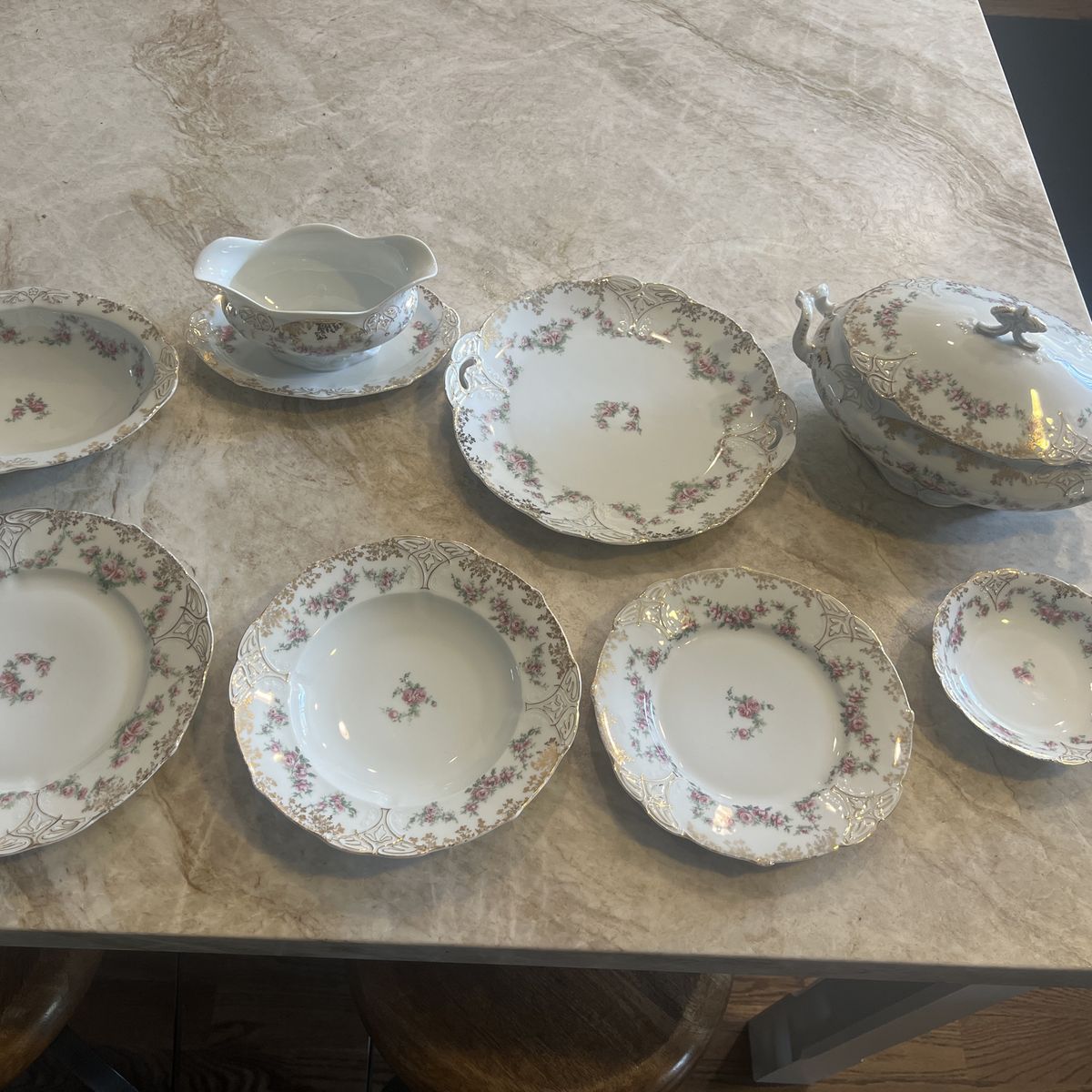 This beautiful set includes: 10 dinner plates 10 large bowls 11 salad plates 11 small bowls 1 gravy boat 1 serving tray 1 small serving dish 1 tureen
