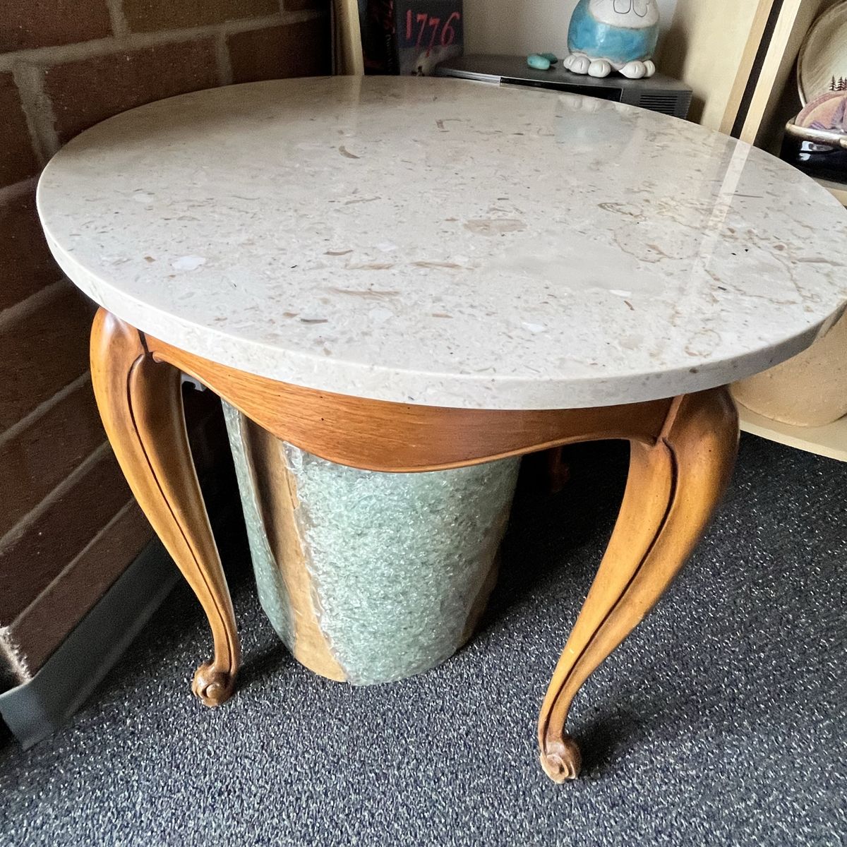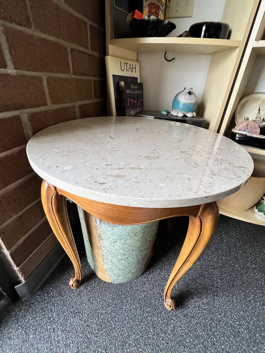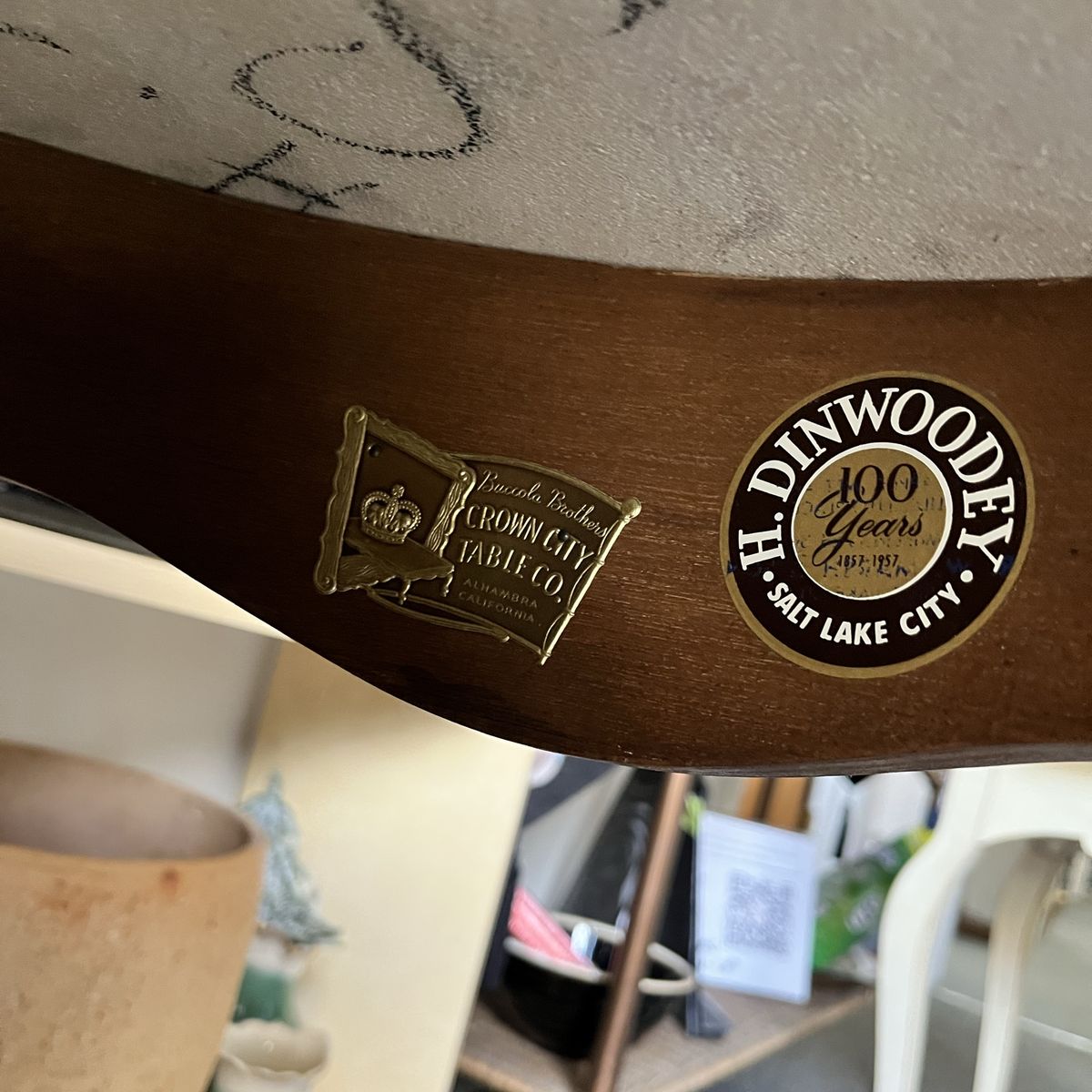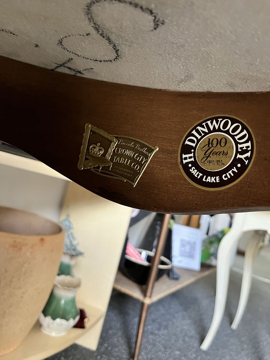 VenmoGorgeous table, with marble top (from Italy). Marked Dinwoodeys, a Salt Lake City furniture store, also marked Buccola Brothers Crown City Table Co, Alhambra, California. Approximately 25 1/2” tall x 26” across the top. Located in SSL
