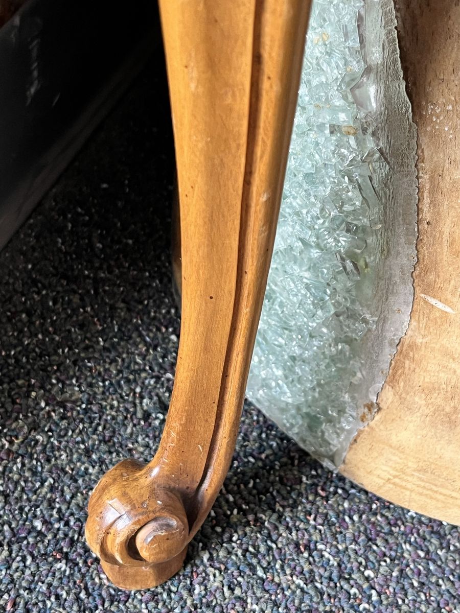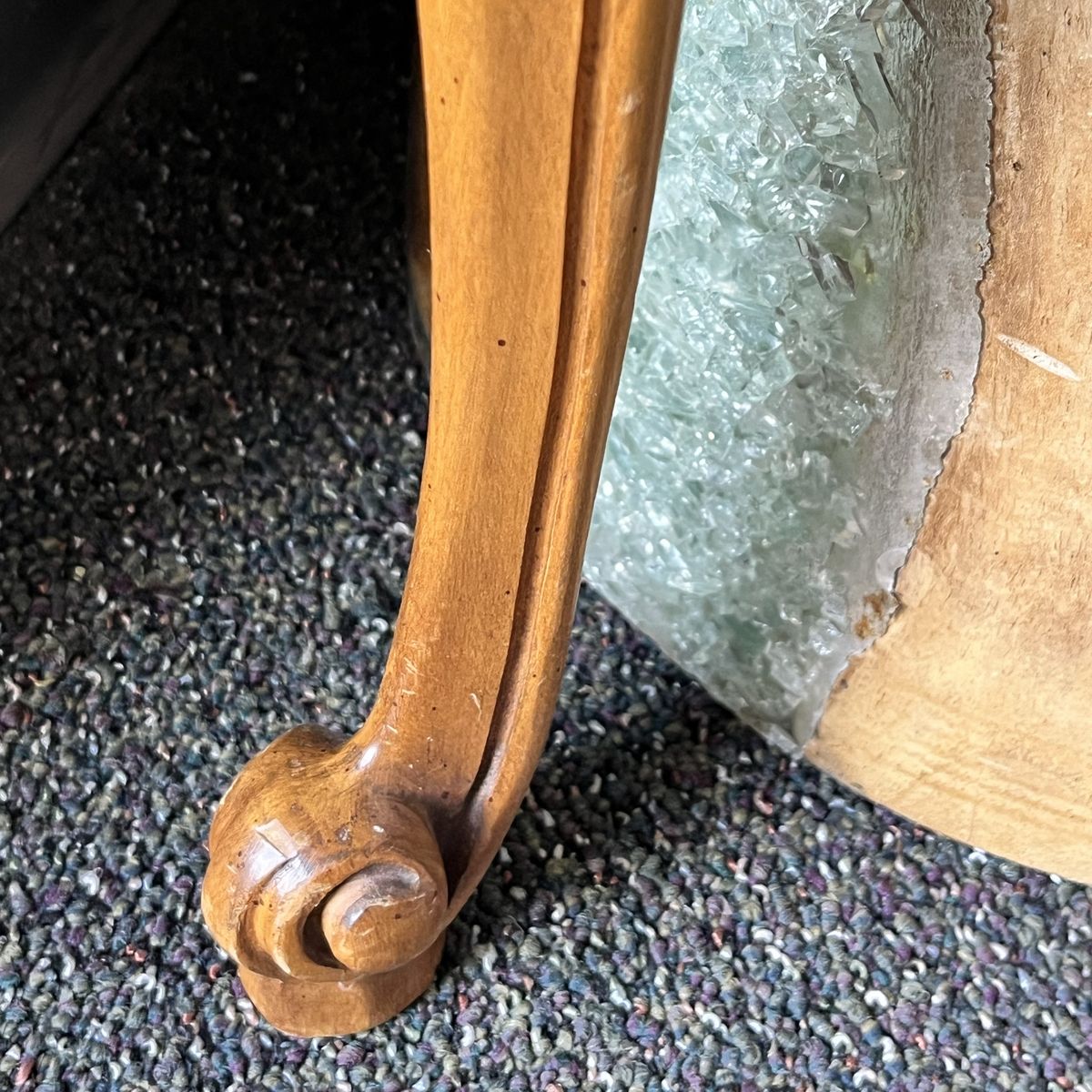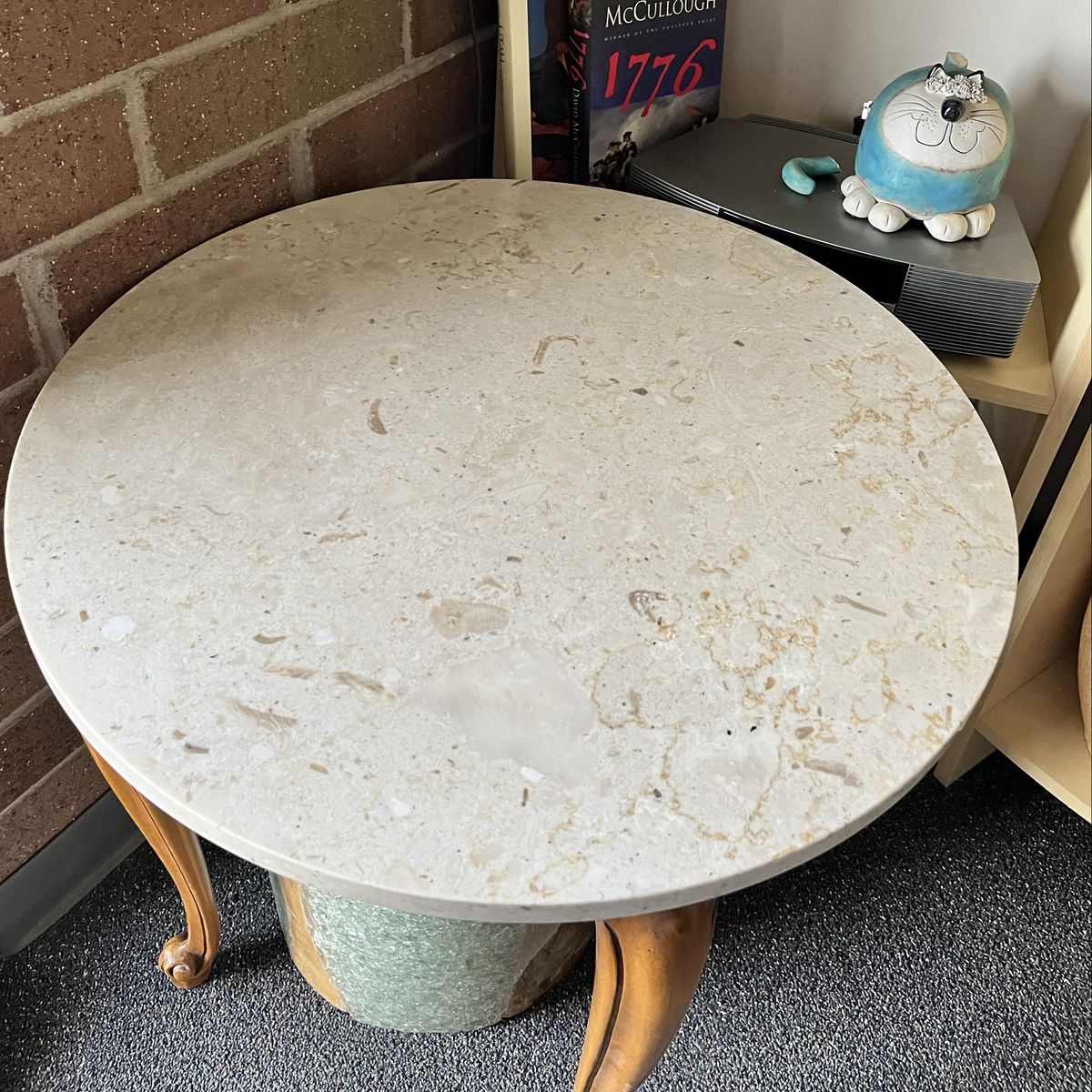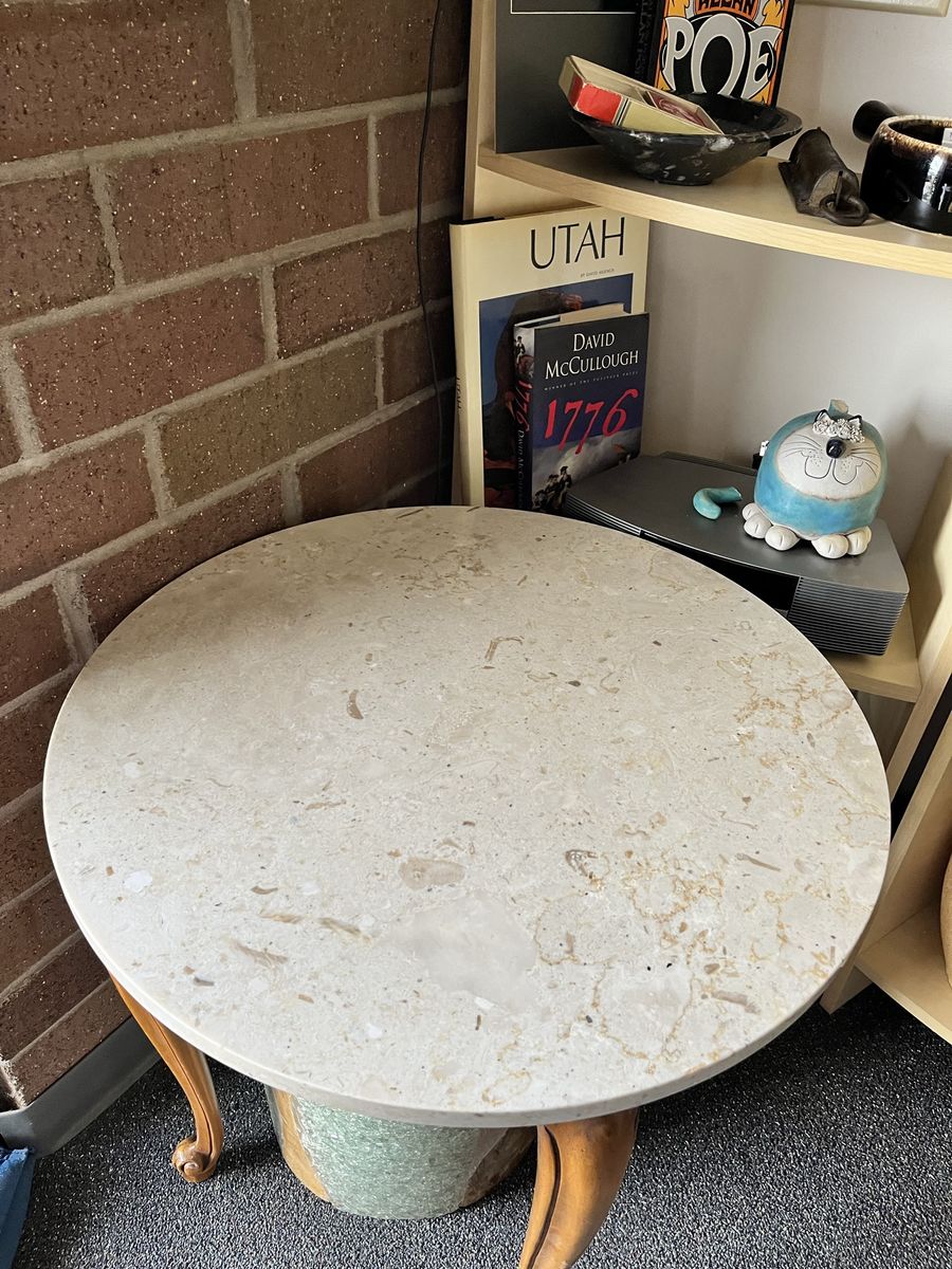 VenmoGorgeous table, with marble top (from Italy). Marked Dinwoodeys, a Salt Lake City furniture store, also marked Buccola Brothers Crown City Table Co, Alhambra, California. Approximately 25 1/2” tall x 26” across the top. Located in SSL