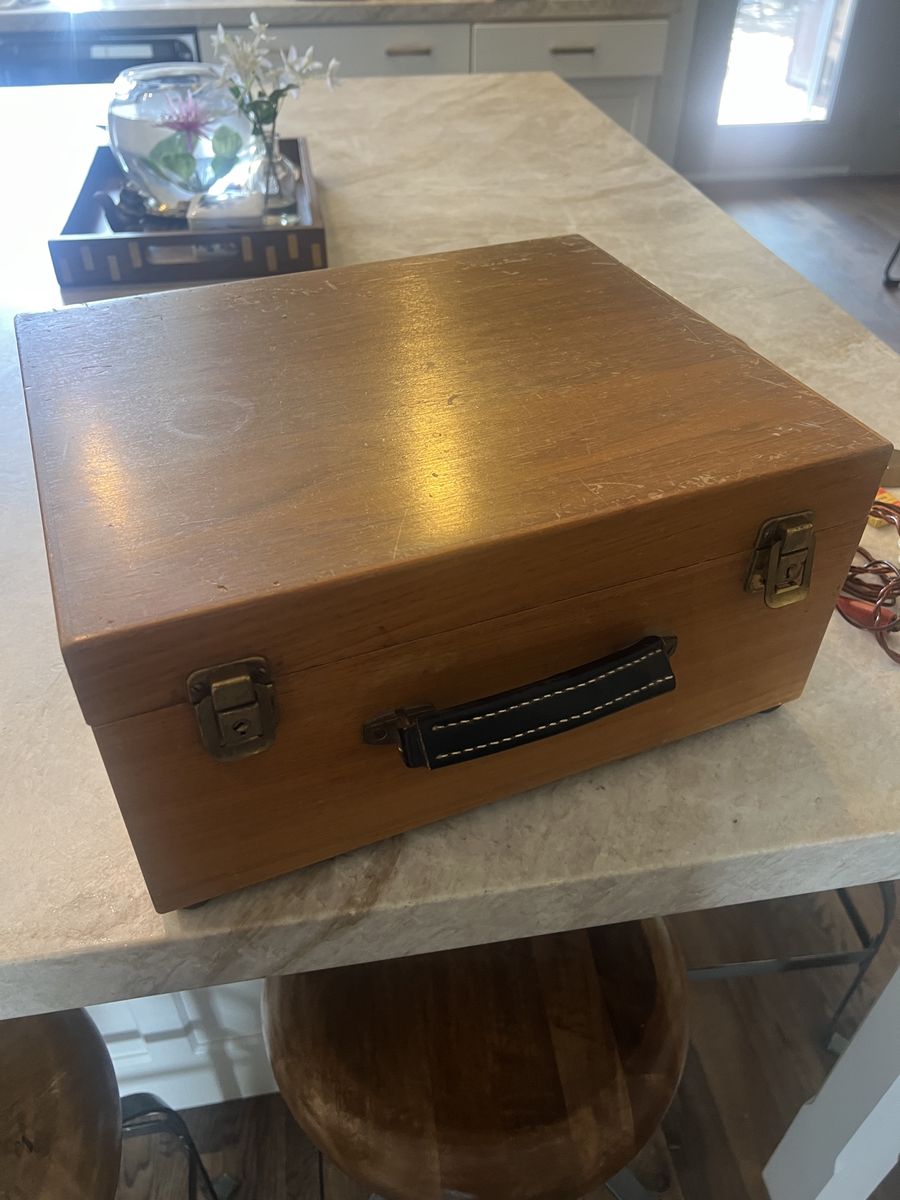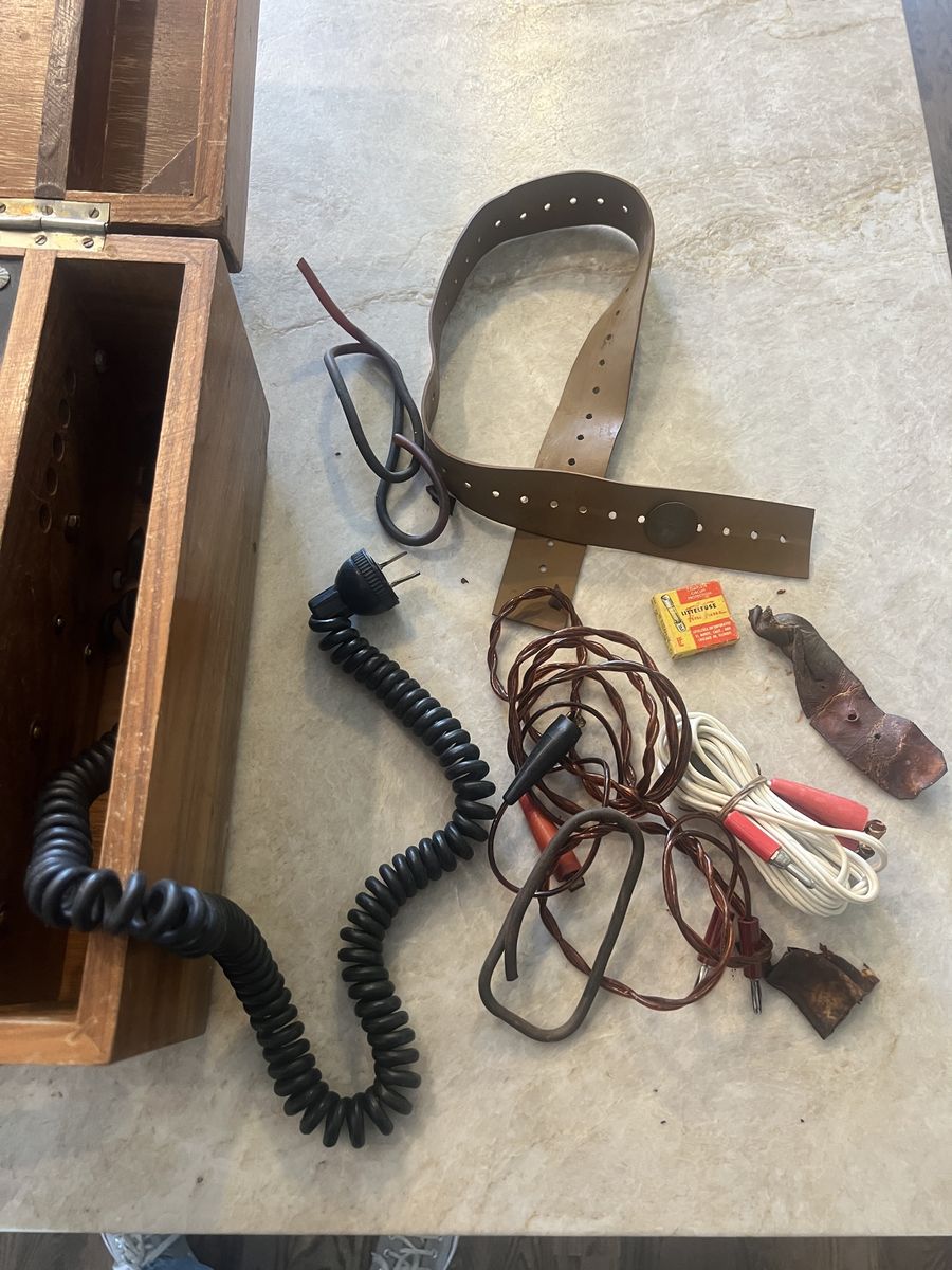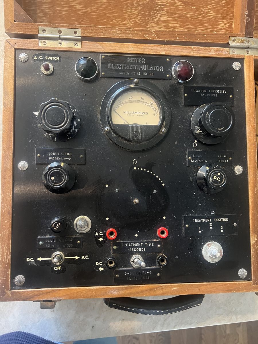 VenmoVintage Reiter Electrostimulator unit housed in its original wooden case. This is a mid-century electrotherapy device, likely dating to the 1940s–1950s, used historically for medical and therapeutic electrical stimulation.