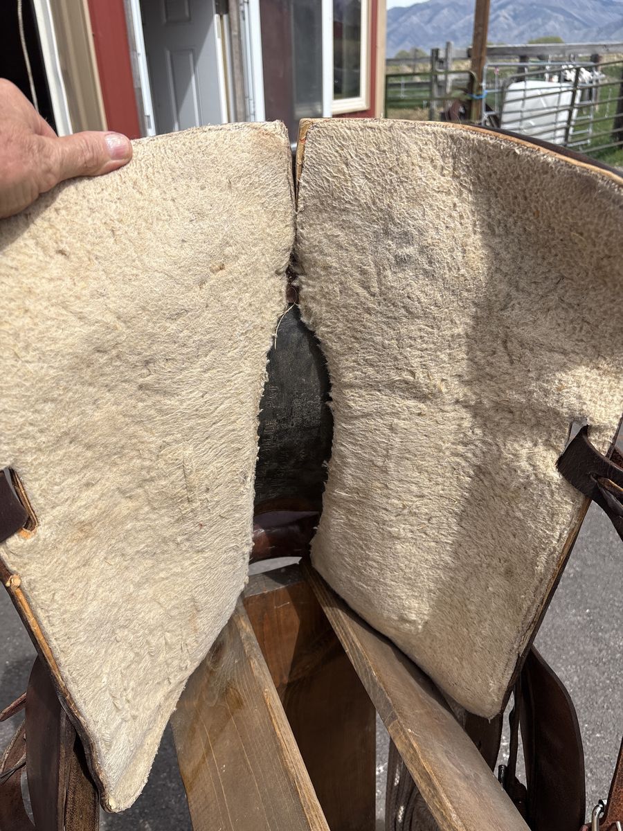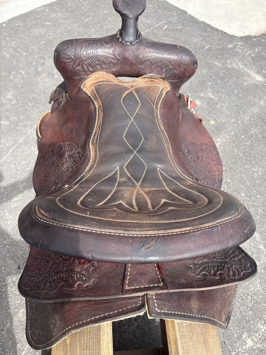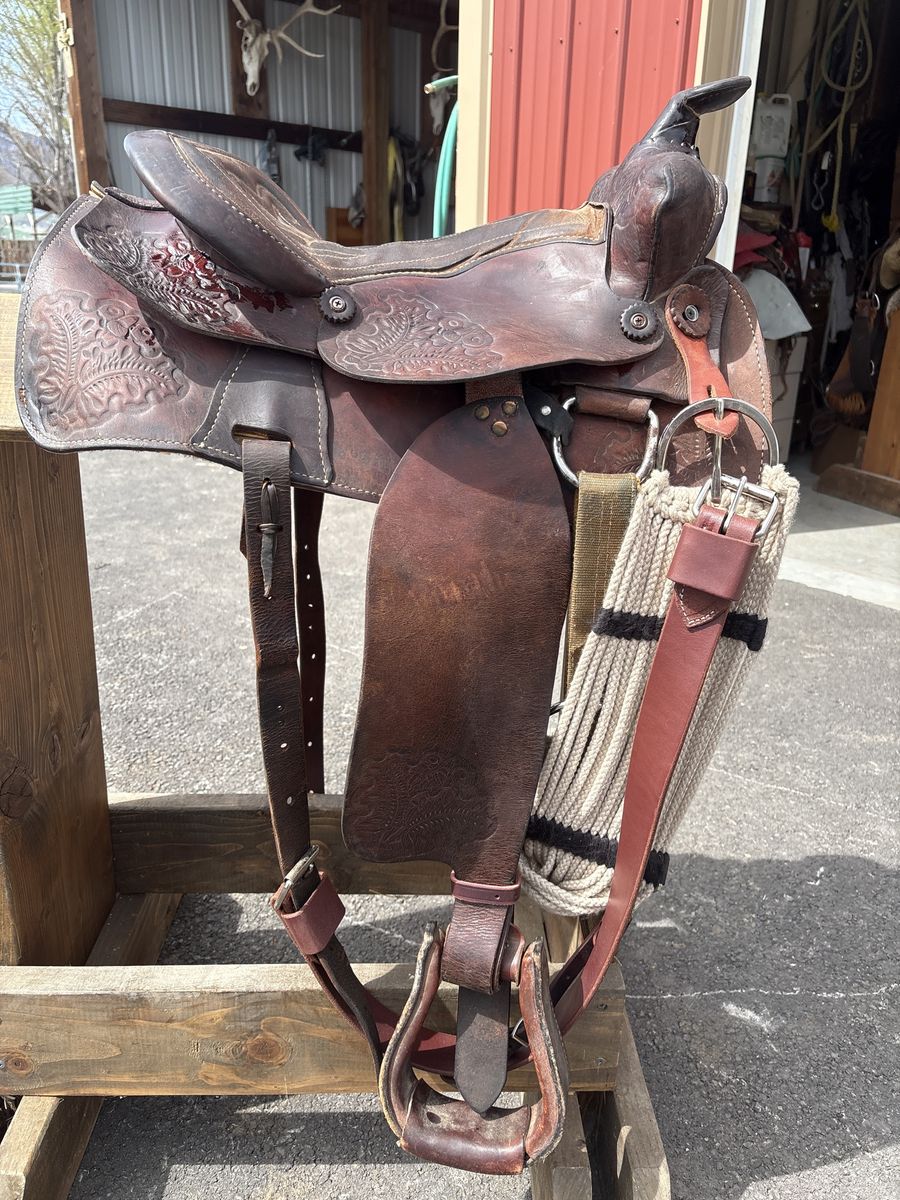 15 inch seat wit 7 inch gullet. Made by King series saddlery. Recently conditioned and cleaned. Leather covered quick change stirrups., front and back cinches. Located 7 miles south of Logan. 300.00
