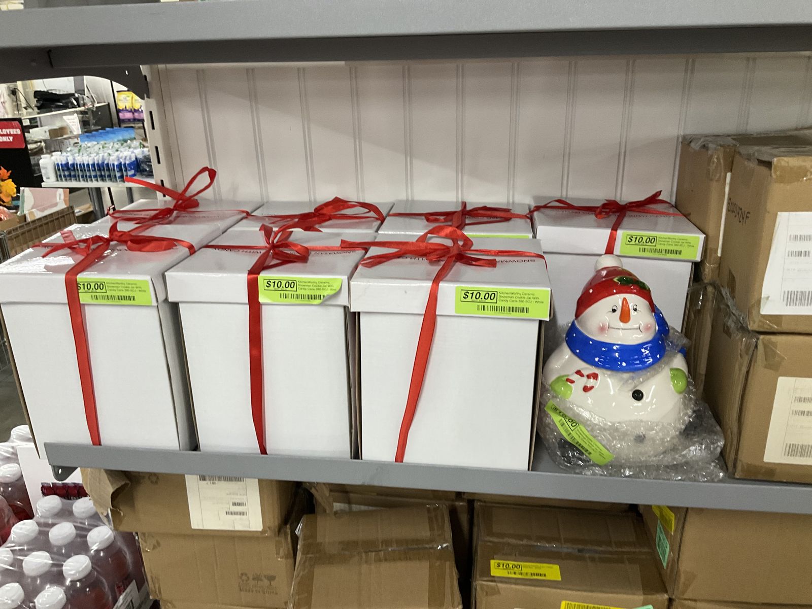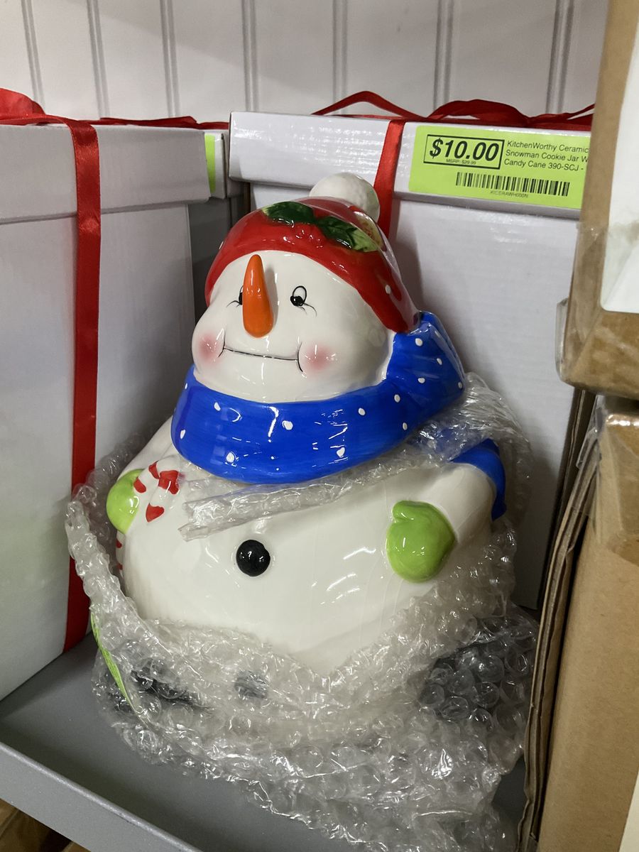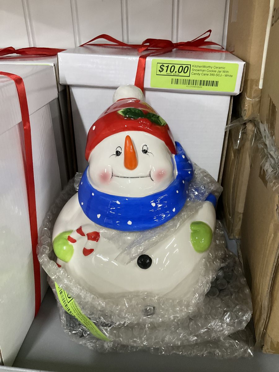 ApplePayKitchenWorthy Ceramic Snowman Cookie Jar with Candy Cane — festive and functional for holiday treats. Our price $10 — MSRP $29.99!