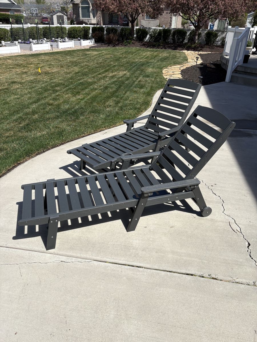 Made by SERWALL, they each measure 78" x 25" x 11.8". Made of weather-resistant HDPE, wood-like surface, 5 positions.