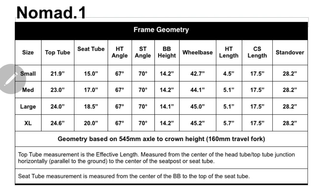 MODEL SPECS Compatible Forks 140mm to 180mm total travel 180mm travel max Headtube/Headset *See Component Notes Seat Post 30.9mm - Minimum insertion 100mm Front Derailleur 34.9mm Top Pull/Top Swing (Low Clamp) BB Shell Width 73mm - Threaded - ISO Chainline Spec 50mm Recommended Max Tire Size 2.5 - may vary by tire and rim model Brakes Disc Brake - ISO Max Brake Rotor Size 203mm Rear Hub 135mm x 10mm (QR style) Seatpost Clamp 34.9mm Component Notes Nomad 1 uses 1-1/8" straight steerer fork