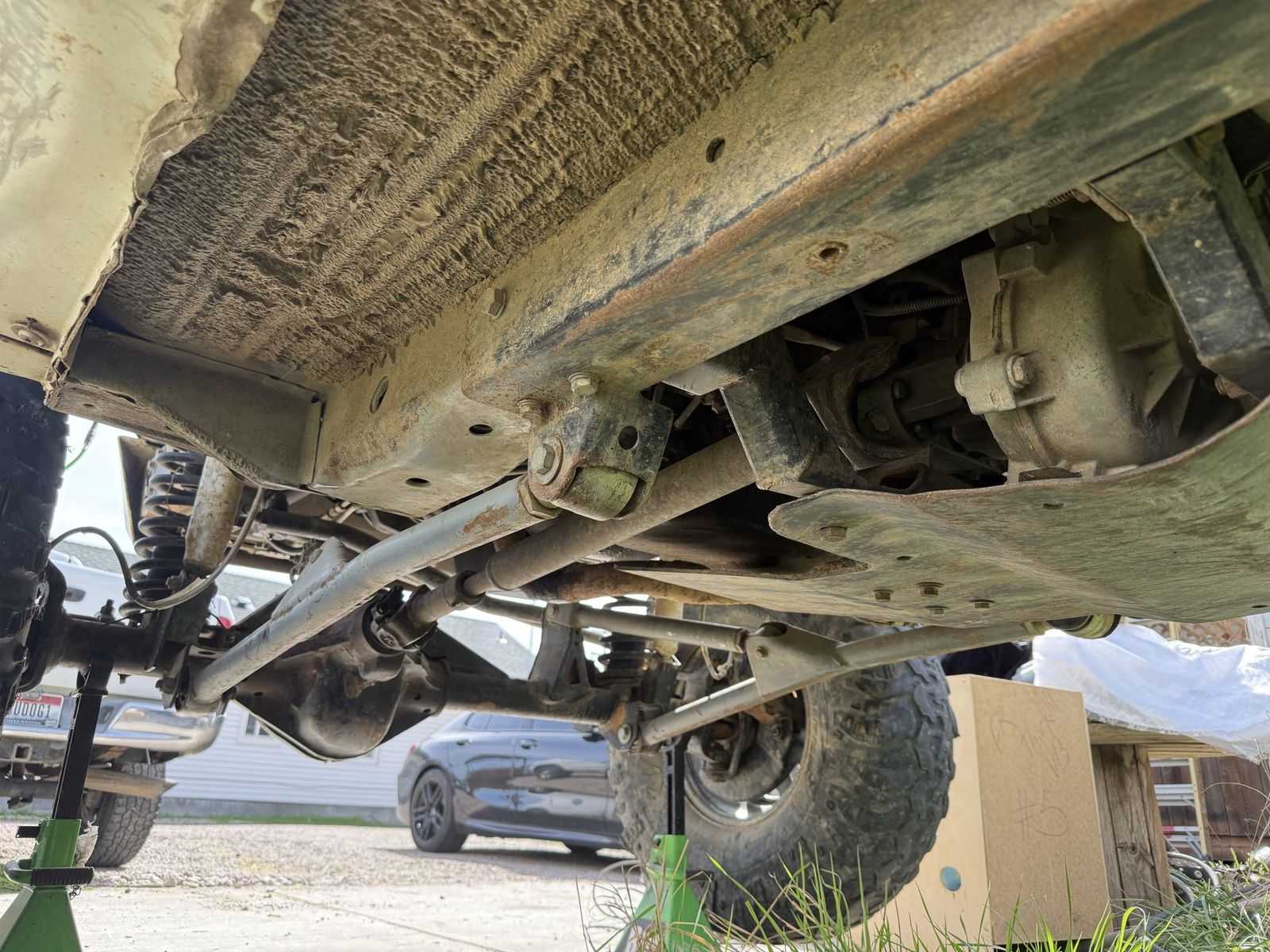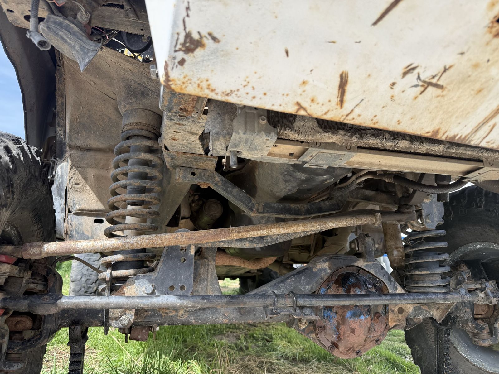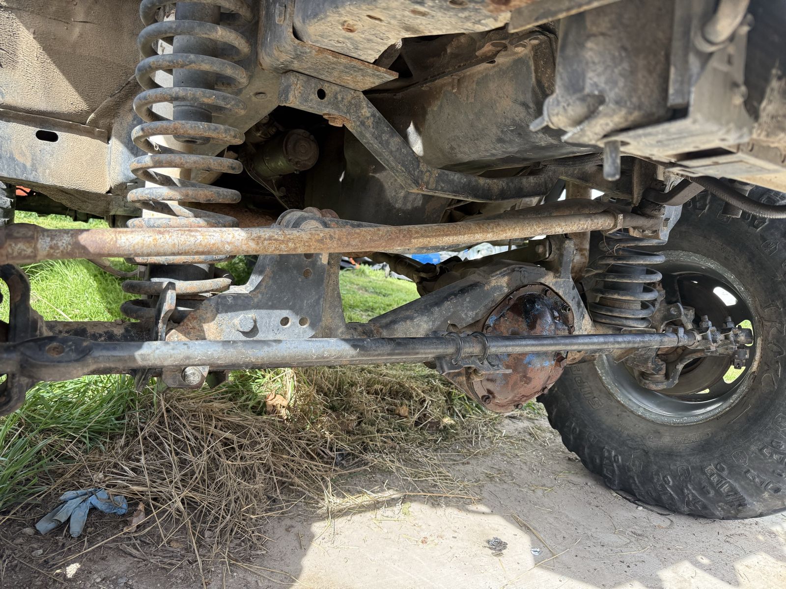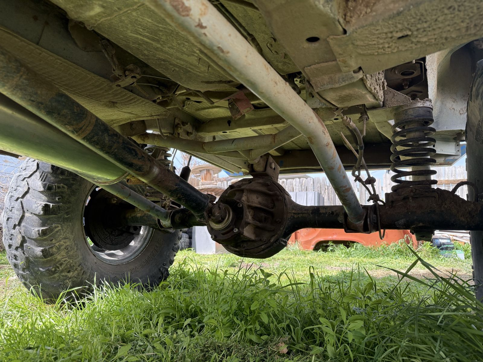 Front Dana 44 axle, chromoly axle shafts (they were $600) 4.56 gears pretty new ball joints. It needs steering stabilizer, old one was smashed I pulled it off and it gets death wobble now especially on bumpy dirt roads