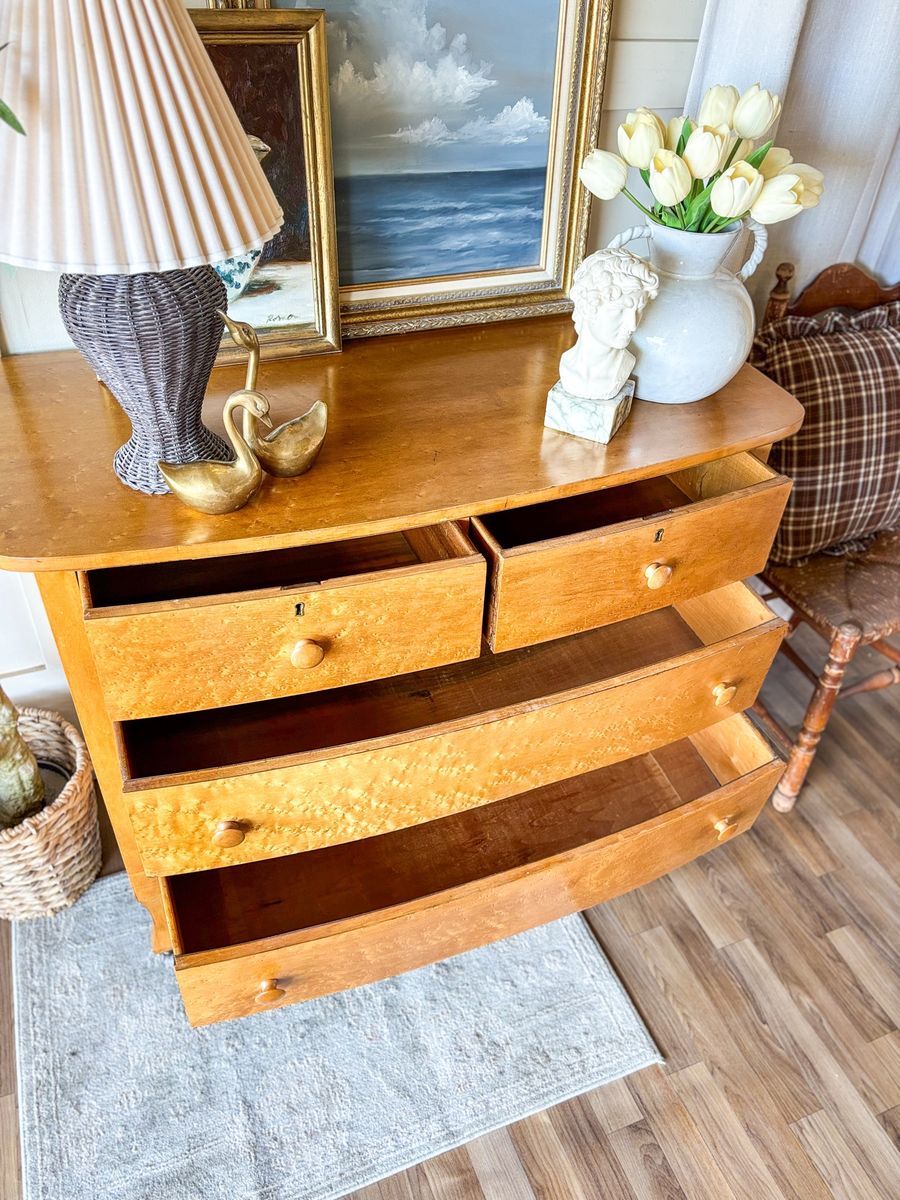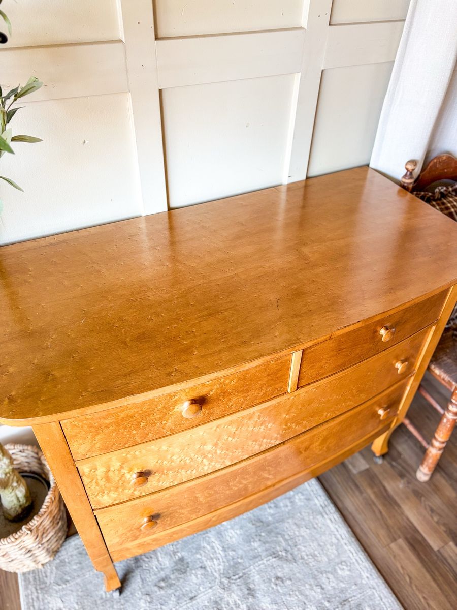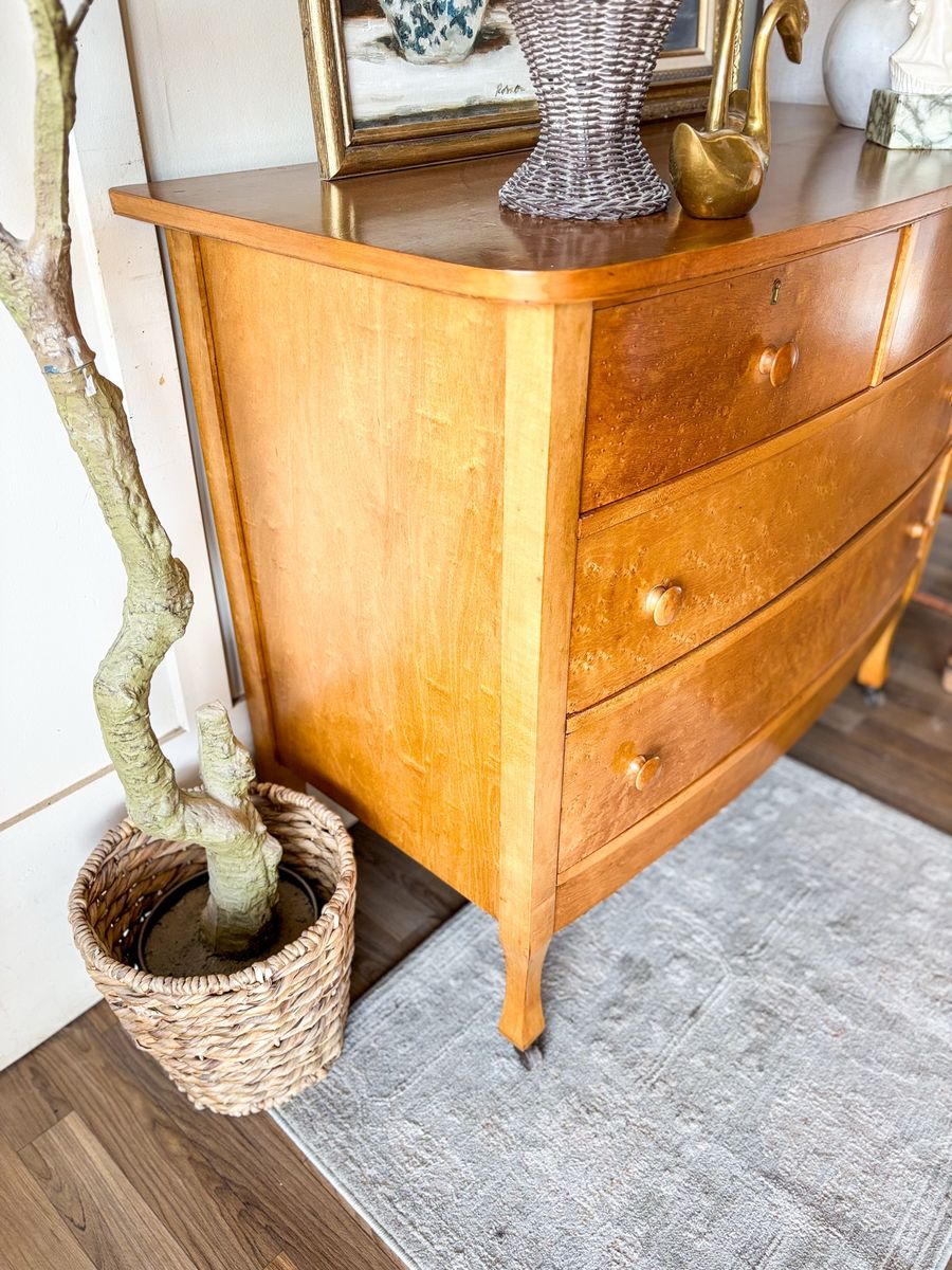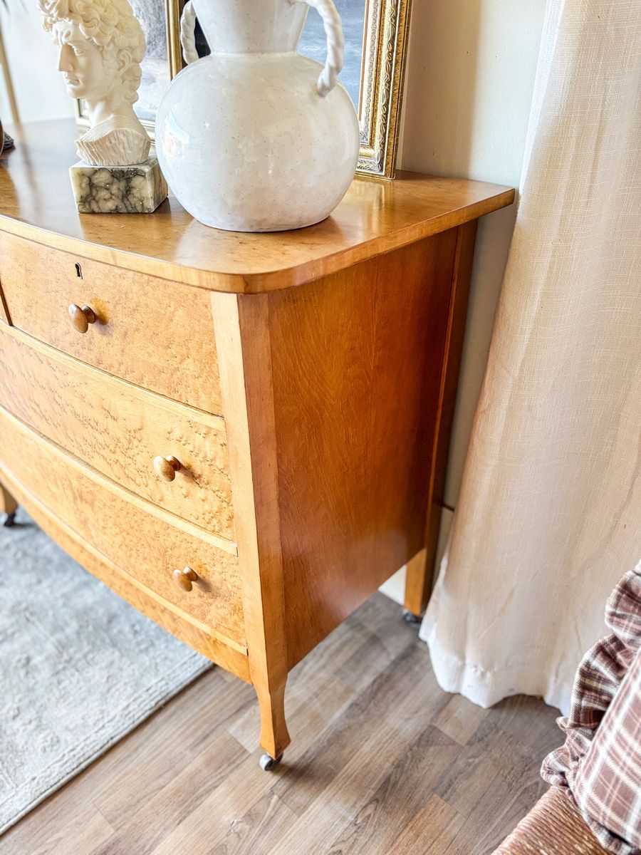VenmoThis stunning antique Birdseye maple dresser is a true statement piece filled with character and timeless charm. The beautifully detailed grain gives it a warm and elegant presence, while the classic shape adds to its vintage appeal. It features a removable mirror that swivels smoothly, offering both function and style. The dresser sits on castor wheels for easy mobility, and all drawers open and close with ease. It remains in original antique condition with only minor wear that adds to its authenticity and history!