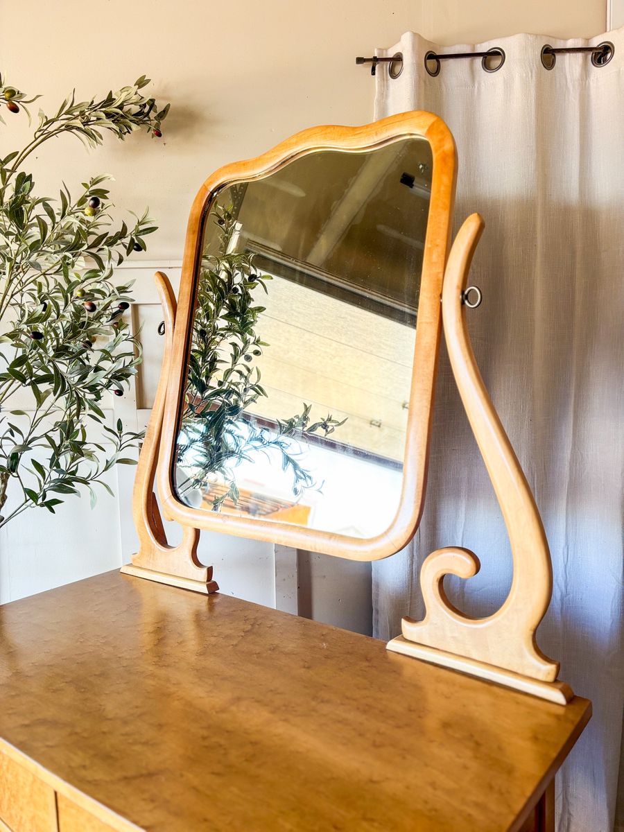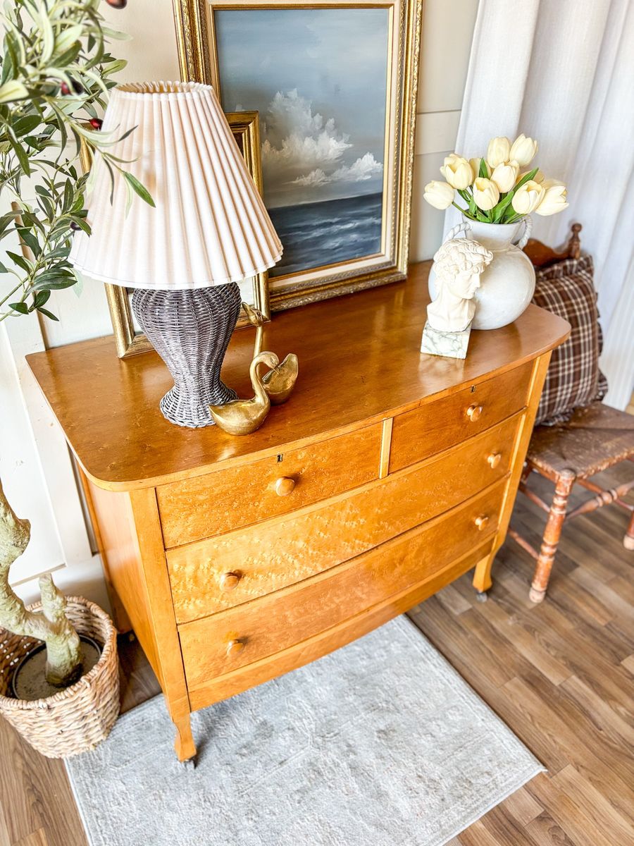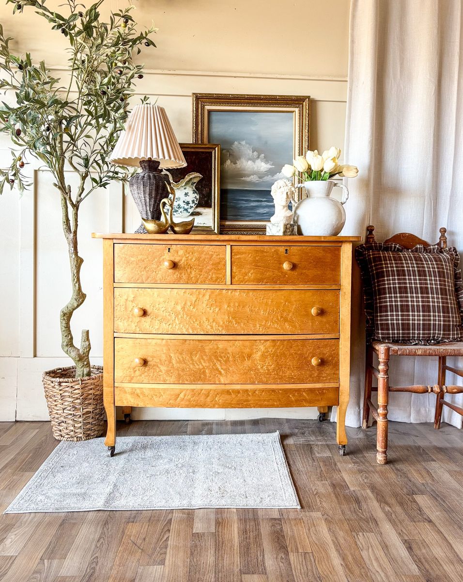 VenmoThis stunning antique Birdseye maple dresser is a true statement piece filled with character and timeless charm. The beautifully detailed grain gives it a warm and elegant presence, while the classic shape adds to its vintage appeal. It features a removable mirror that swivels smoothly, offering both function and style. The dresser sits on castor wheels for easy mobility, and all drawers open and close with ease. It remains in original antique condition with only minor wear that adds to its authenticity and history!
