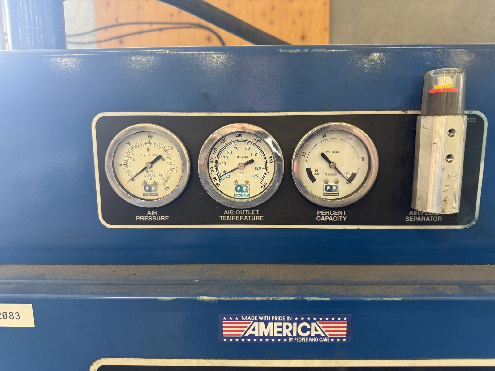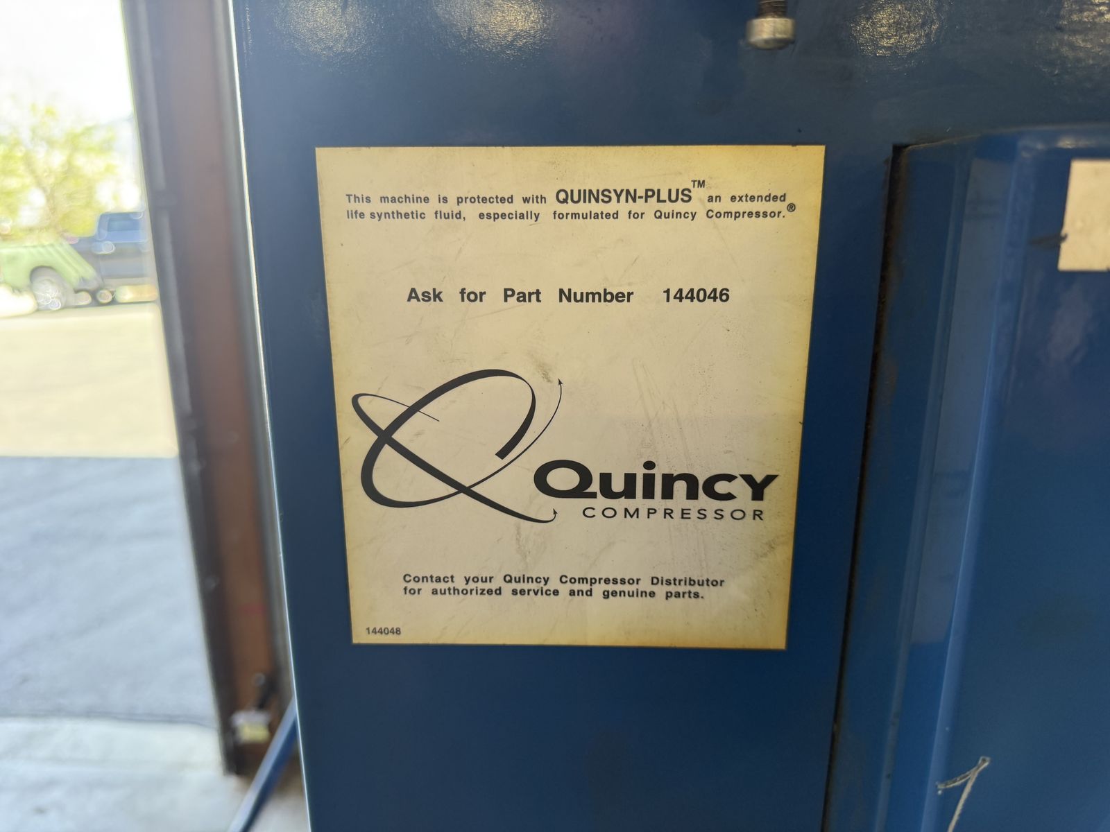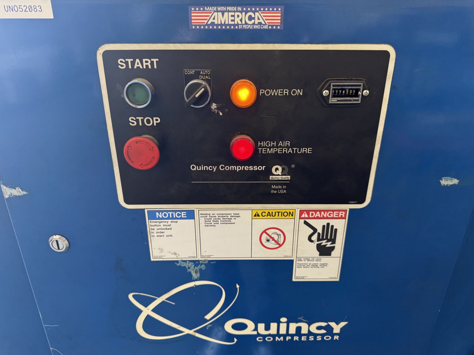 Details: Quincy QMB 20 compressor Mounted tank Control panel with start stop and temperature indicator Approx 17,000 hours on meter Includes Zeks refrigerated air dryer Wired and ready to run Well maintained and operational