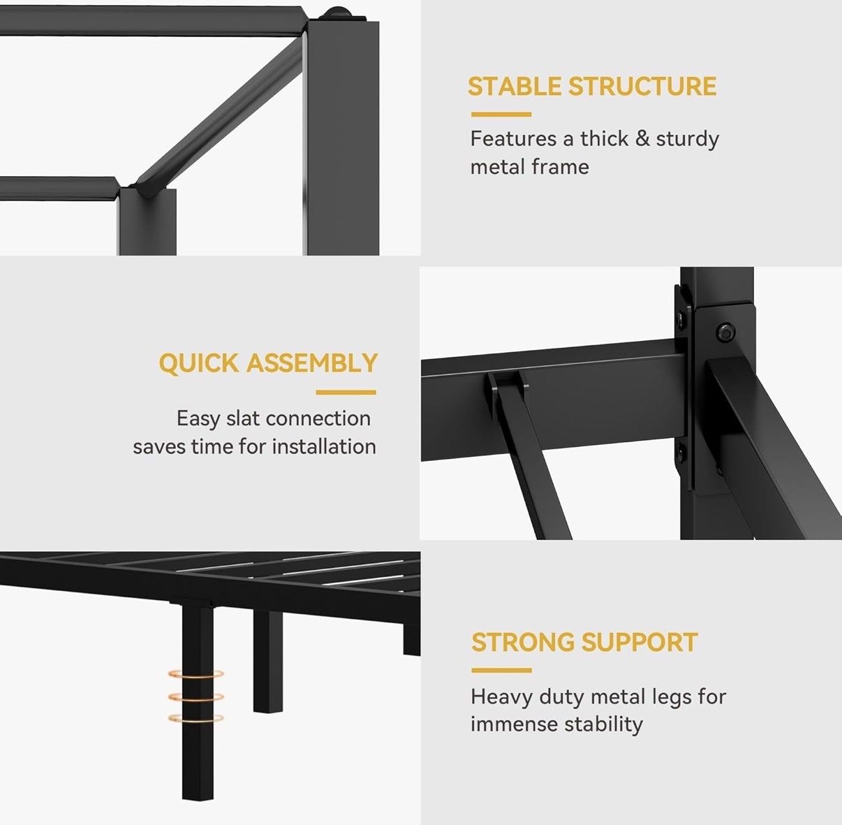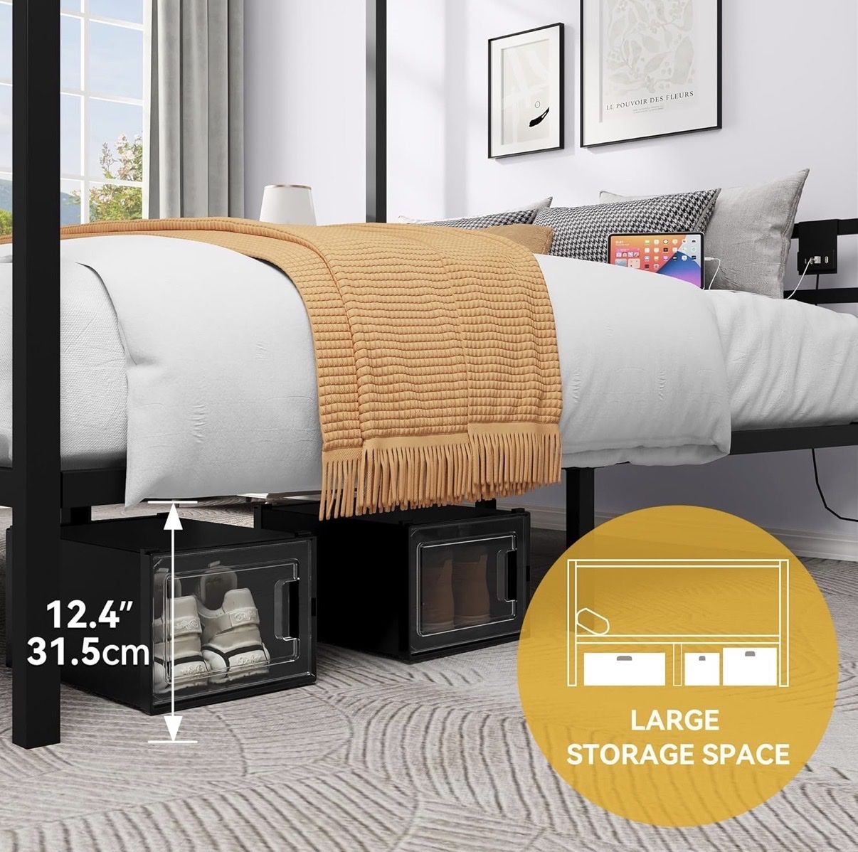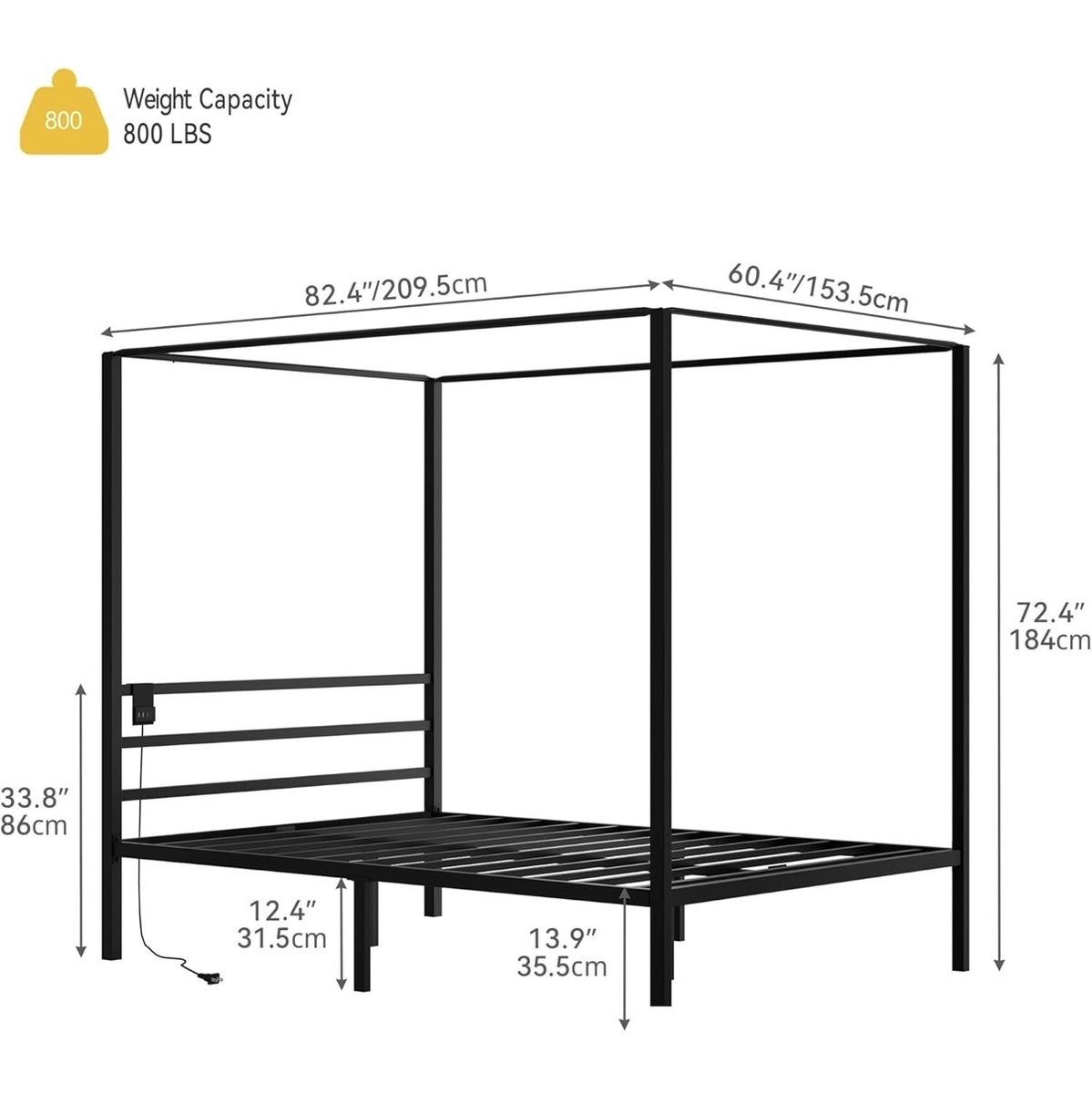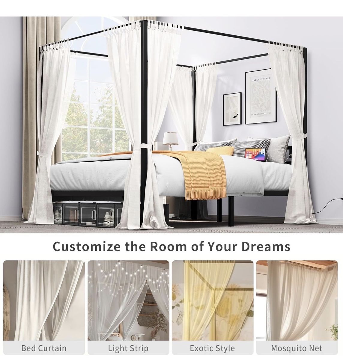 VenmoBrand New in the Box Queen Size 4-Poster Canopy Bed Frame with USB Charging Hub with Reinforced Metal Slats, Under-Bed Storage, No Box Spring Needed, Black