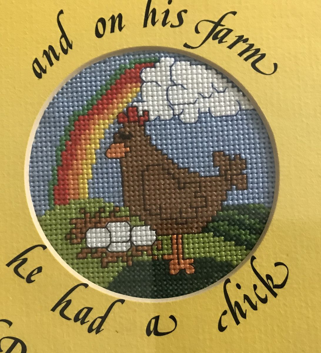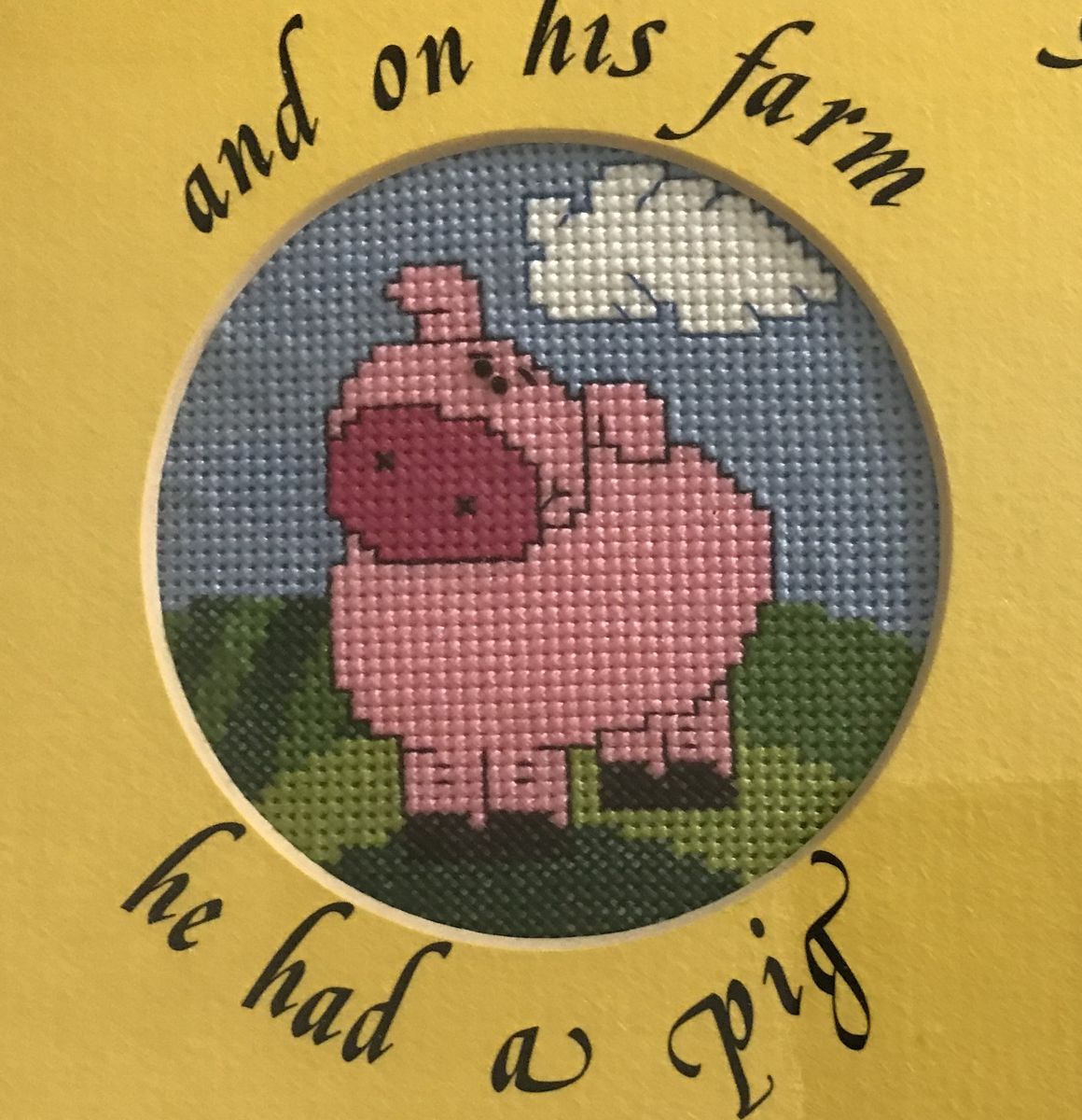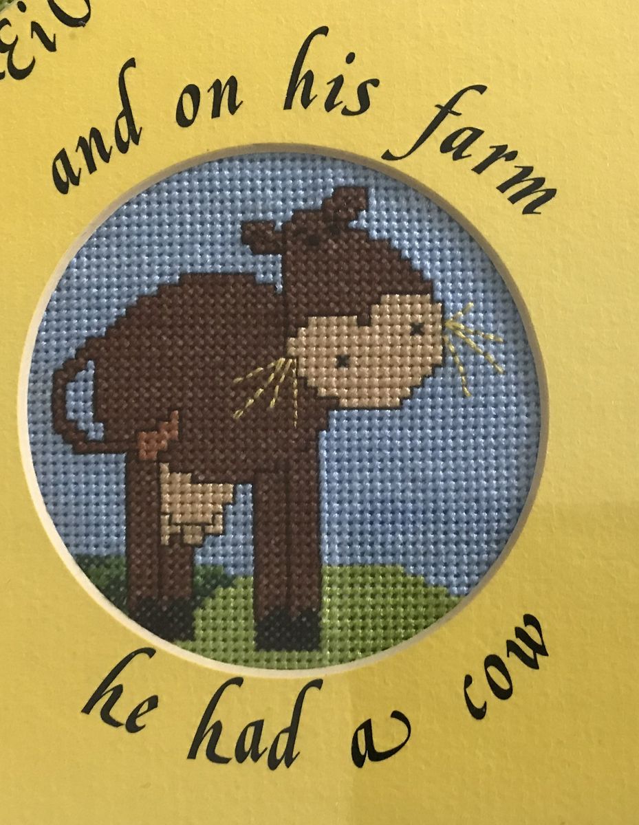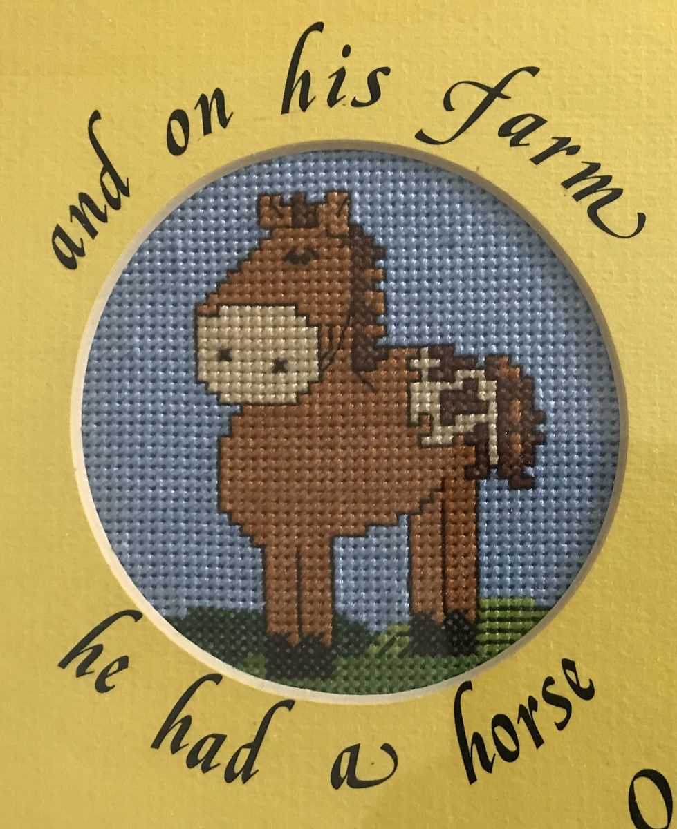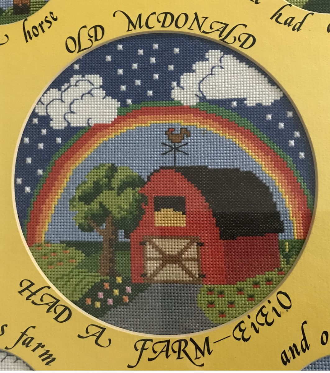 This handmade cross stitch features old Macdonalds farm in the middle surrounded with four cross stitch pictures of a horse, chick, pig, and cow. A wonderful addition for a baby or child's room.