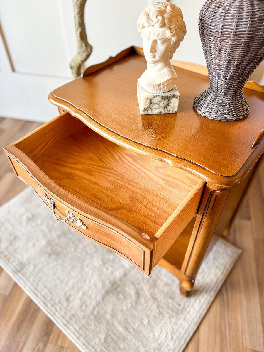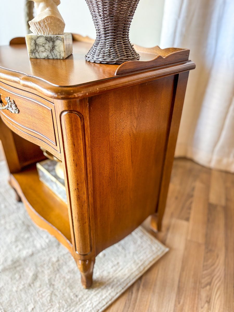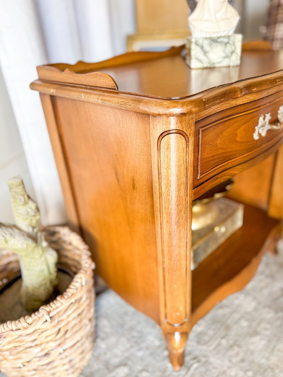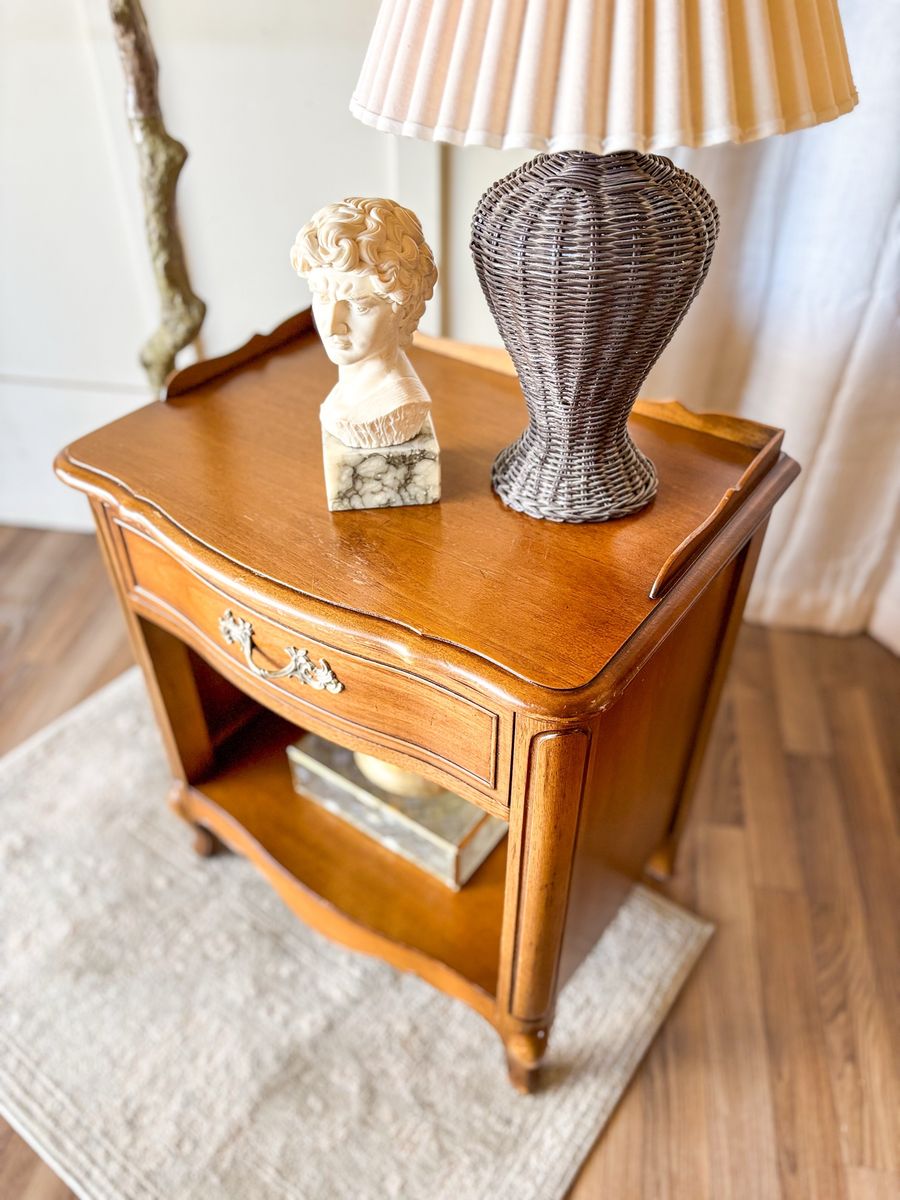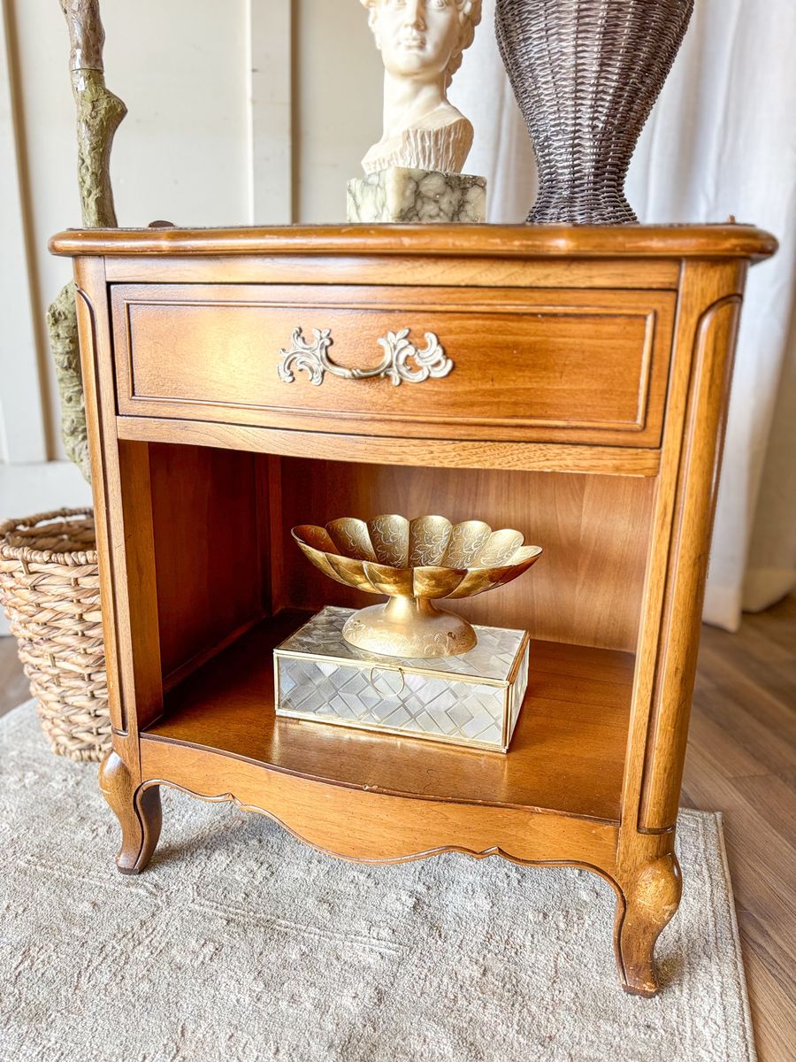 VenmoThis lovely vintage French provincial nightstand by Broyhill features a beautifully curved front and original French hardware that gives it classic timeless appeal. The two drawers glide open and close with ease, offering both style and practicality. It is in great condition with minor wear that adds to its vintage charm without taking away from its overall beauty!
