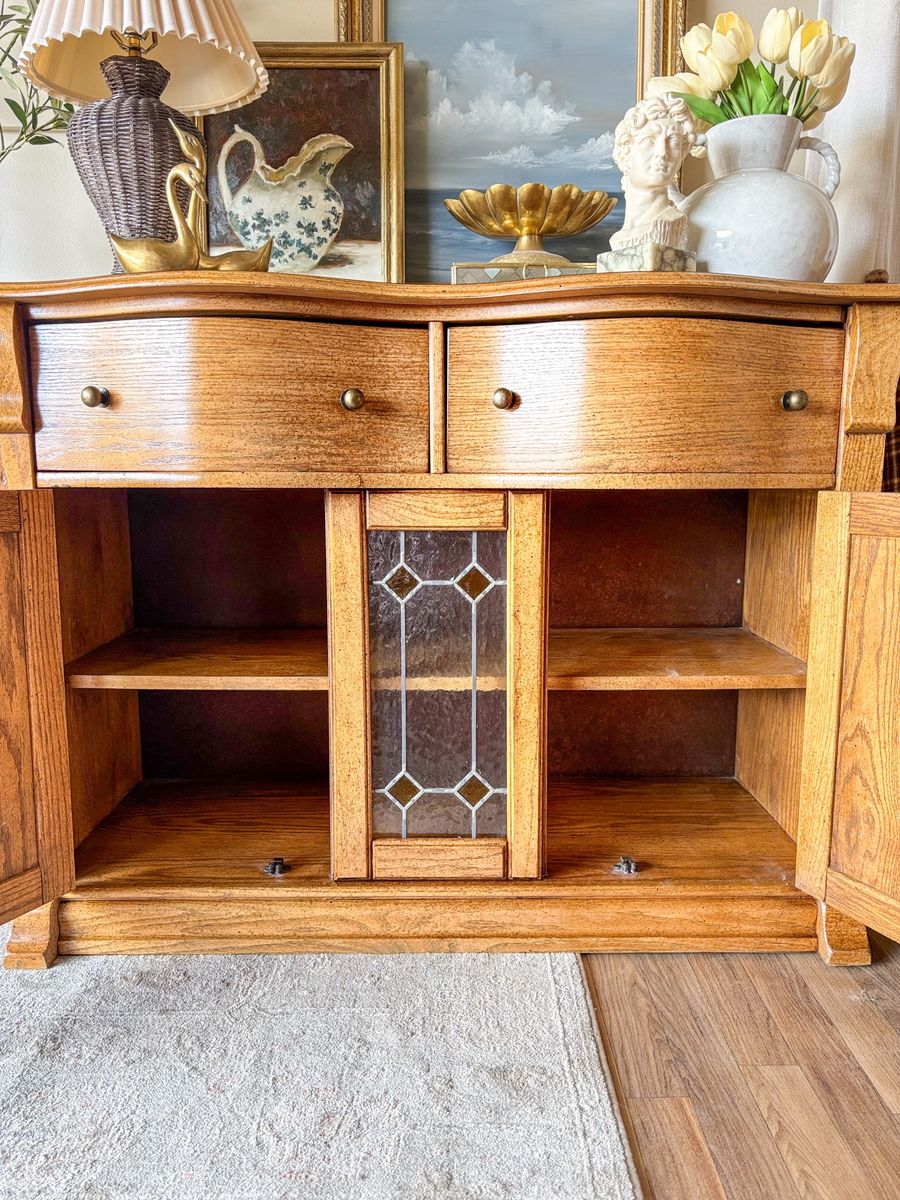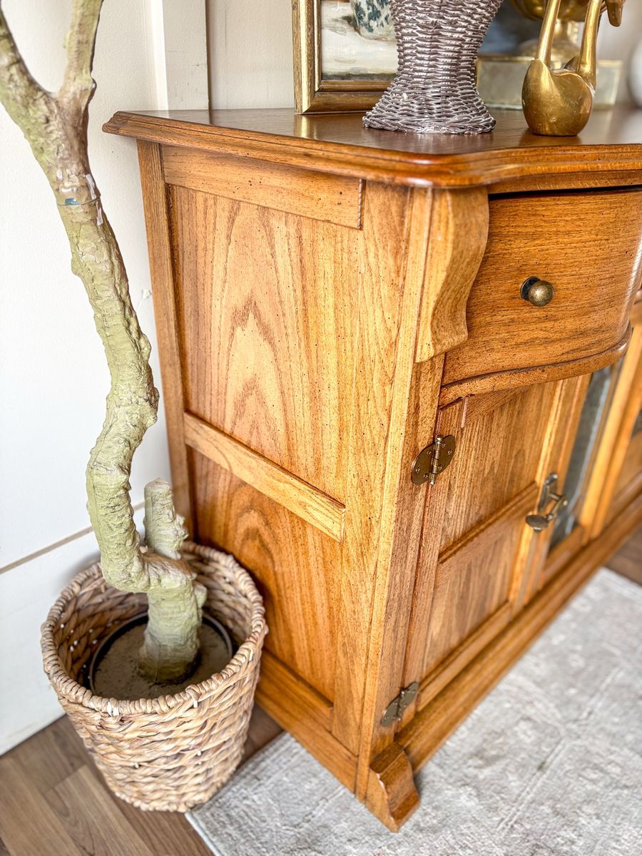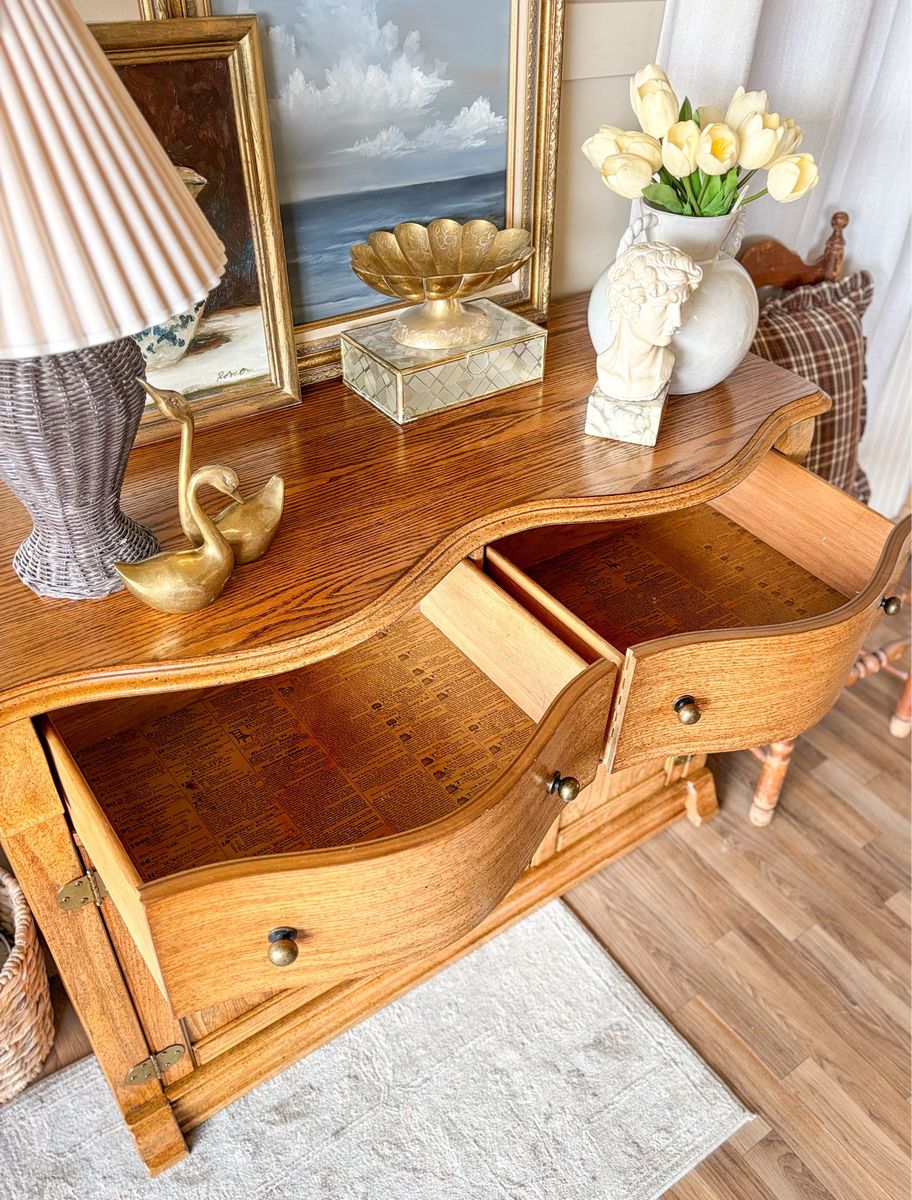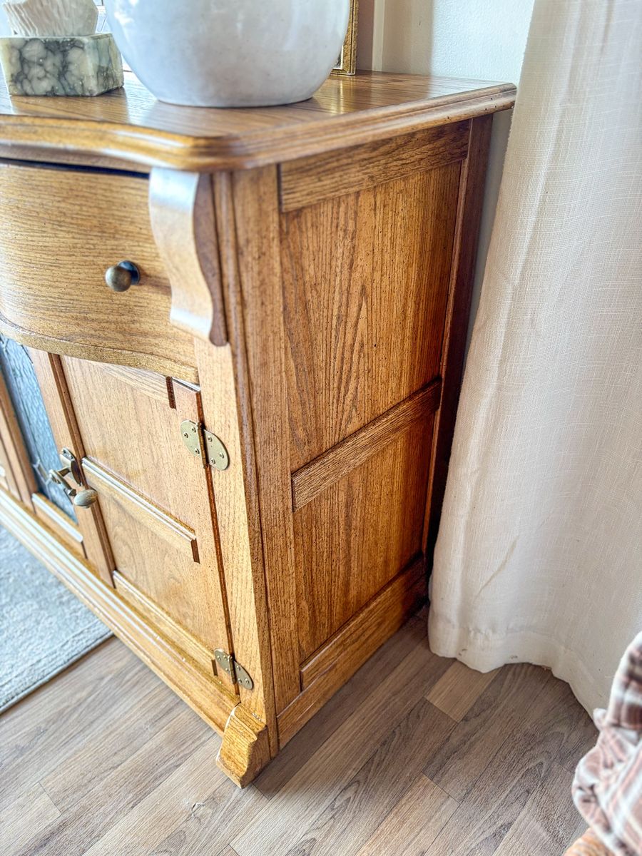 VenmoThis vintage bowfront keepsake credenza buffet is a true statement piece, combining elegant curves with warm wood tones and unique detailing. It features original brass hardware on the doors along with newly updated antique brass hardware on the drawers, creating a beautiful blend of old and refreshed charm. The center showcases a stunning original stained glass panel that adds character and visual interest. Each drawer and door opens and closes with ease, revealing a spacious interior with shelving for additional storage. The top has been refinished and sealed with lacquer, giving it a durable and refreshed finish. With only minor wear and incredible condition for its age, this piece is both functional and full of timeless appeal!