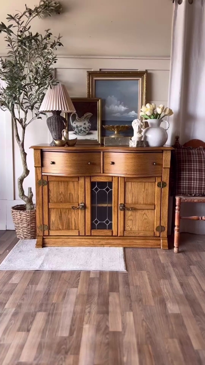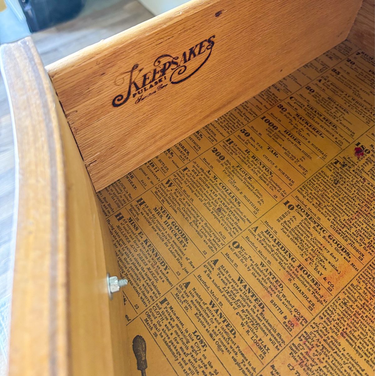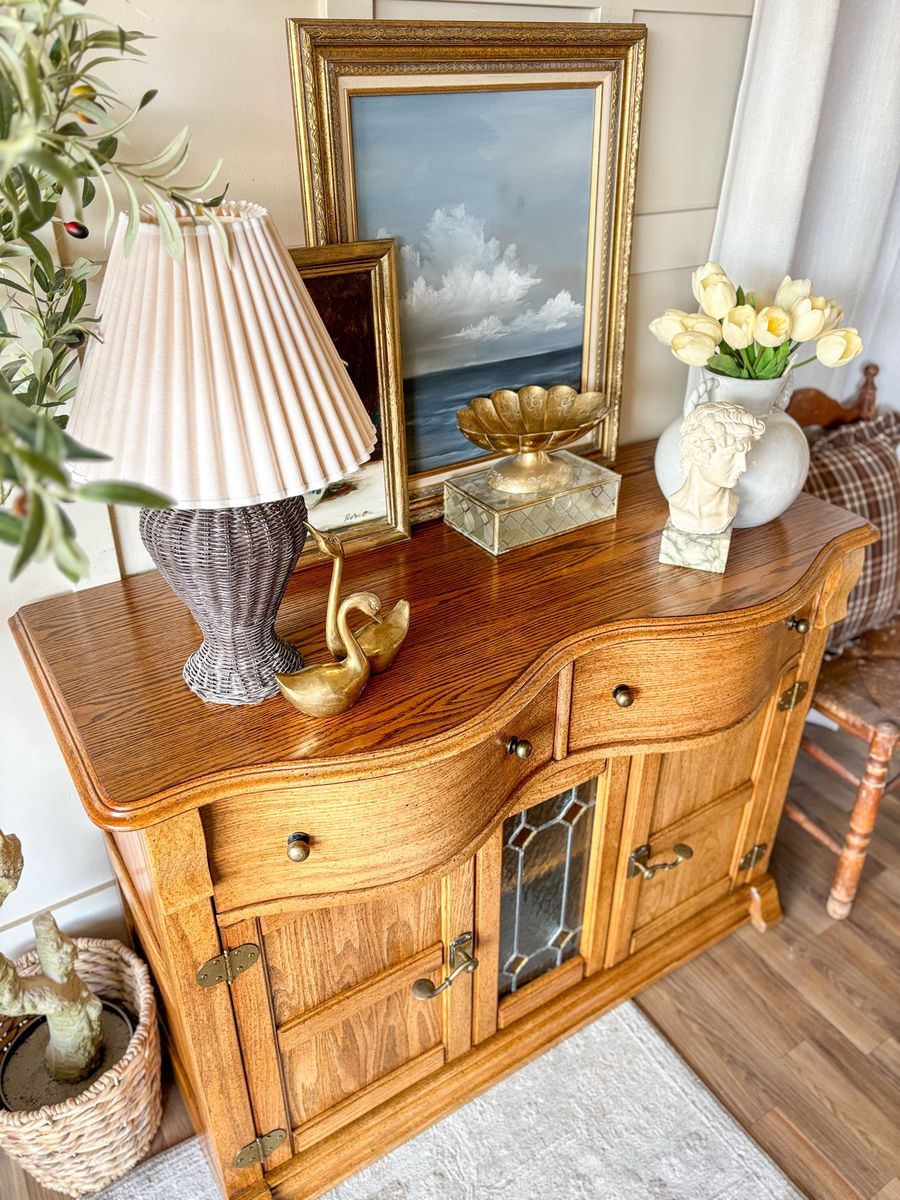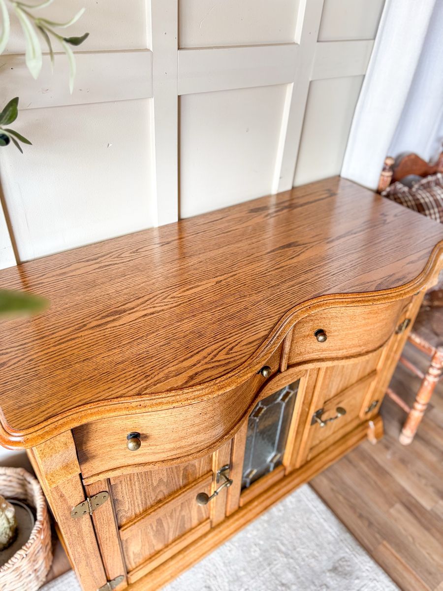 VenmoThis vintage bowfront keepsake credenza buffet is a true statement piece, combining elegant curves with warm wood tones and unique detailing. It features original brass hardware on the doors along with newly updated antique brass hardware on the drawers, creating a beautiful blend of old and refreshed charm. The center showcases a stunning original stained glass panel that adds character and visual interest. Each drawer and door opens and closes with ease, revealing a spacious interior with shelving for additional storage. The top has been refinished and sealed with lacquer, giving it a durable and refreshed finish. With only minor wear and incredible condition for its age, this piece is both functional and full of timeless appeal!