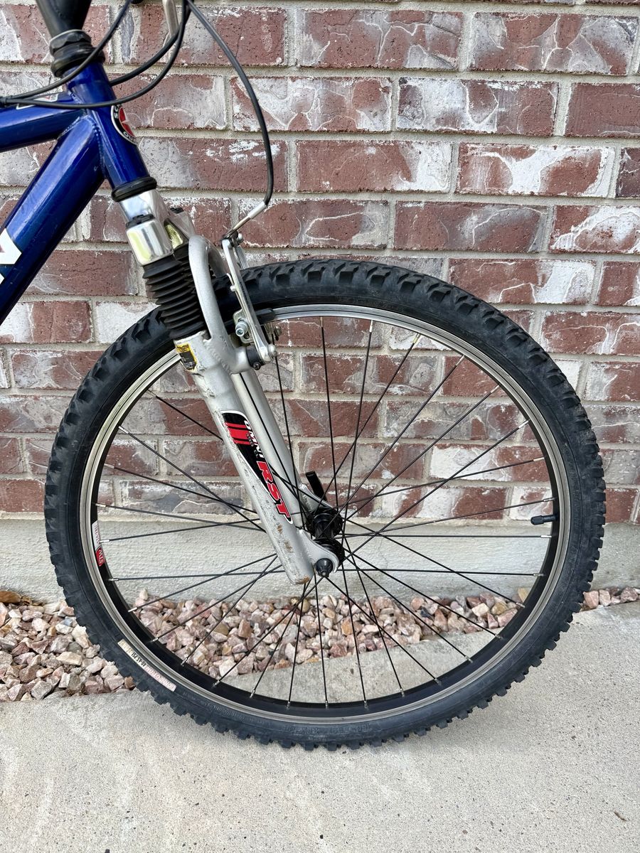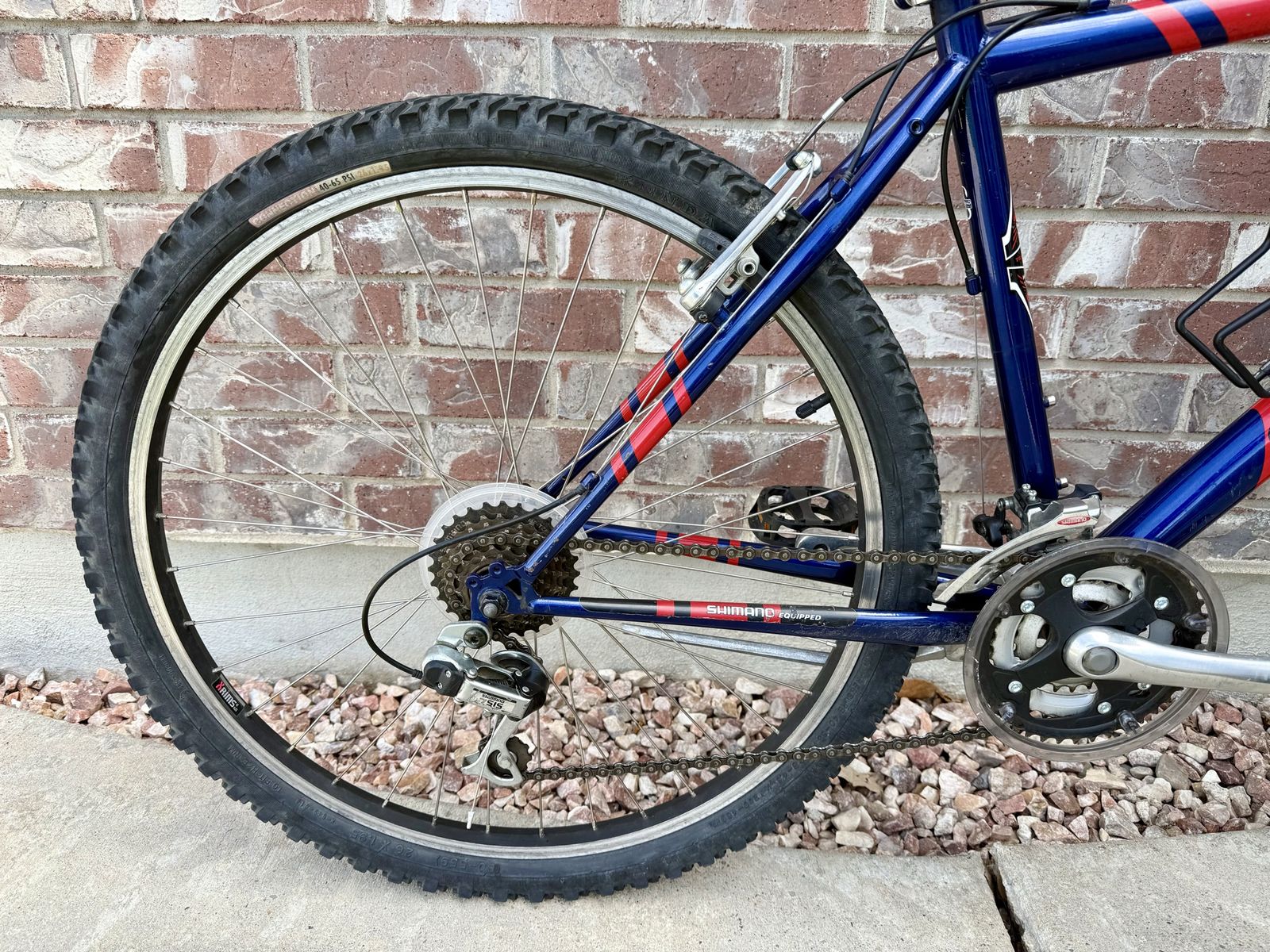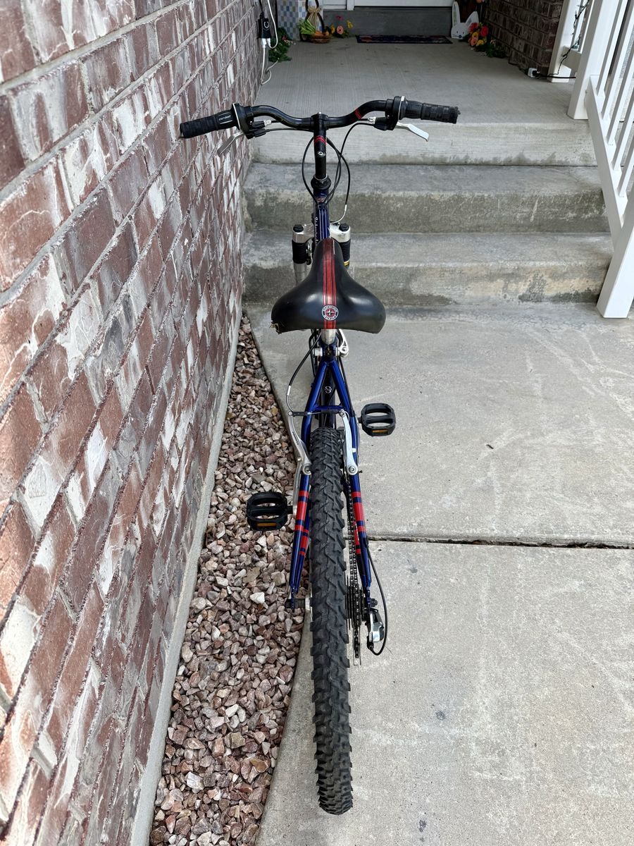 Good condition. 18“ medium frame. 26” wheels. 21 speeds(3x7). Great all arounder bike. Nice blue color with red accents.