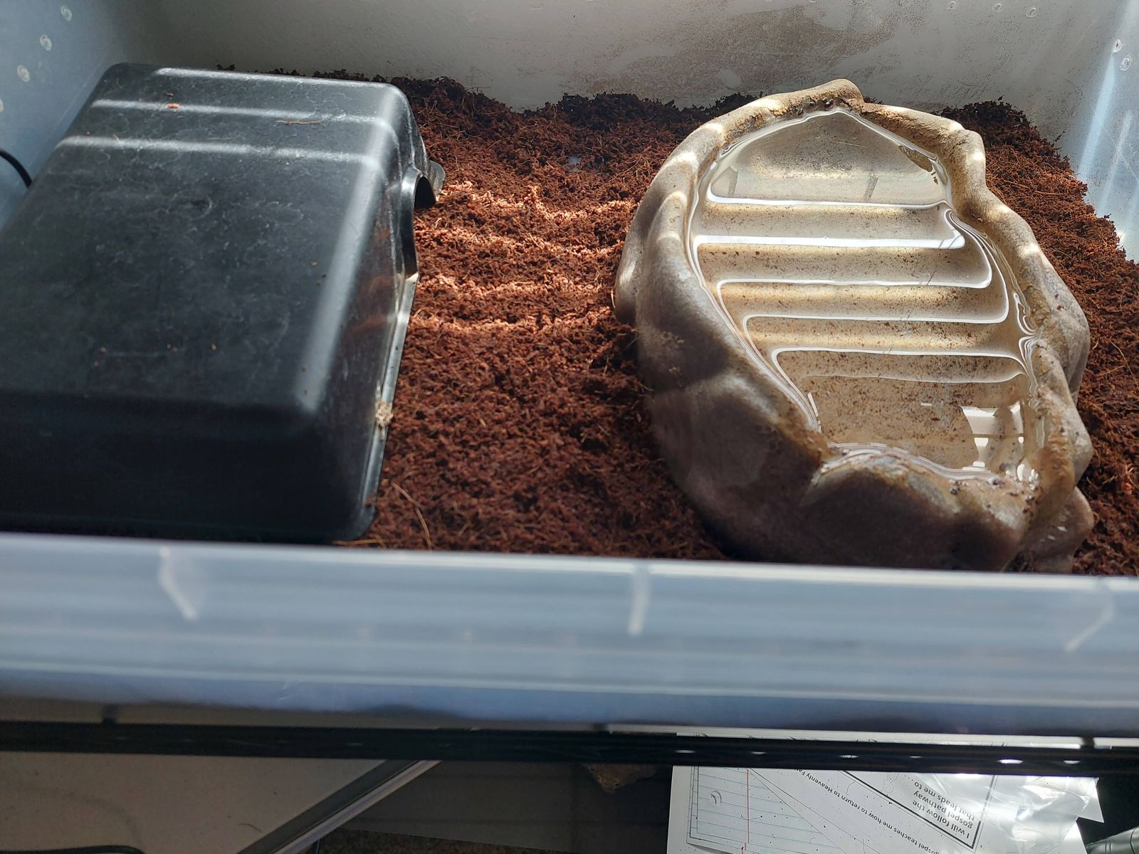 She comes with plastic enclosure, water bowl, hide, heating pad with control, thermometer with humidity gauge, and about 20 rats.