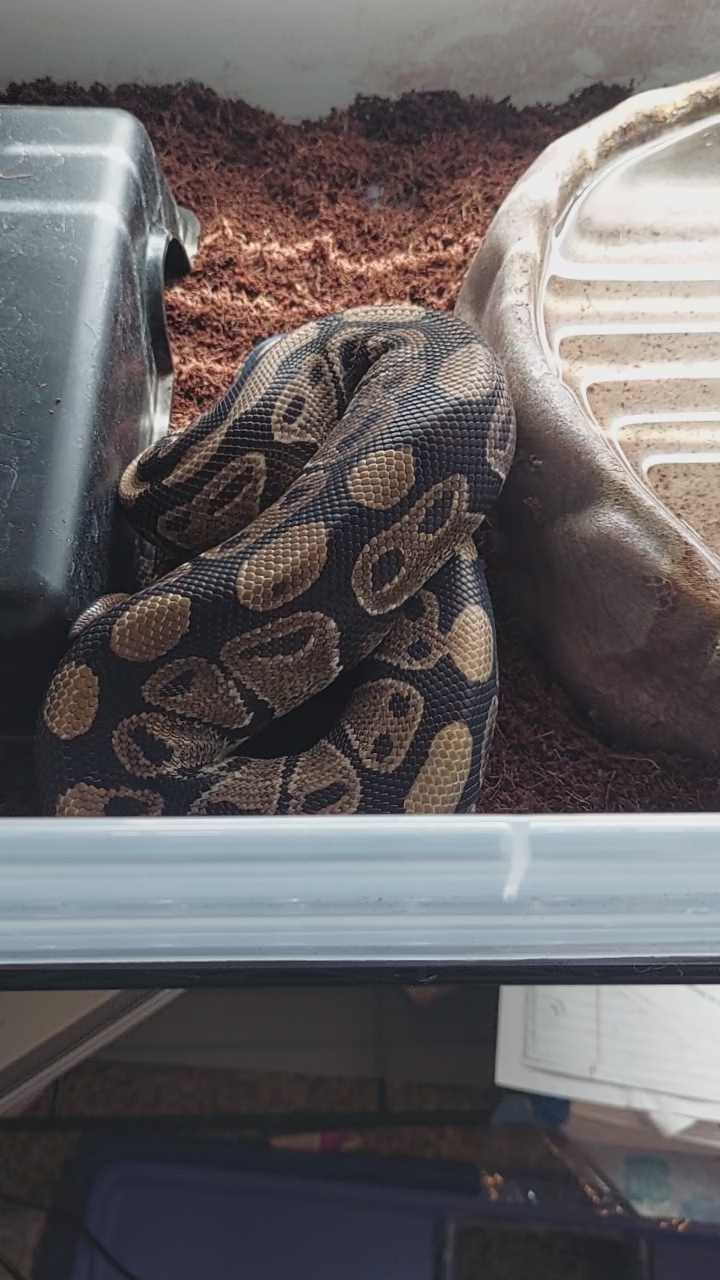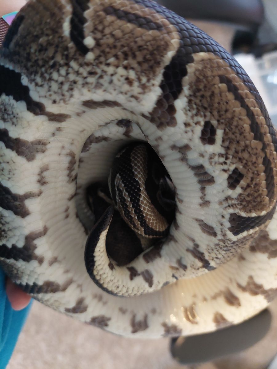 Female ball python. She is very shy and has never bitten anyone. She does take a while to unfurl when being held.
