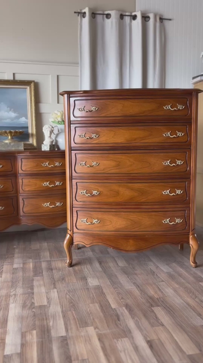 This beautiful vintage French provincial Broyhill bedroom set includes the low dresser, tall dresser, and matching nightstand, all showcasing elegant curved drawer fronts and original French hardware. The tops of the two dressers have been refinished to highlight the natural warmth of the wood while the bodies remain in original condition with minor wear that adds authentic vintage character. Each drawer opens and closes smoothly, making this set both functional and effortlessly stylish, perfect for bringing timeless charm to any bedroom space!